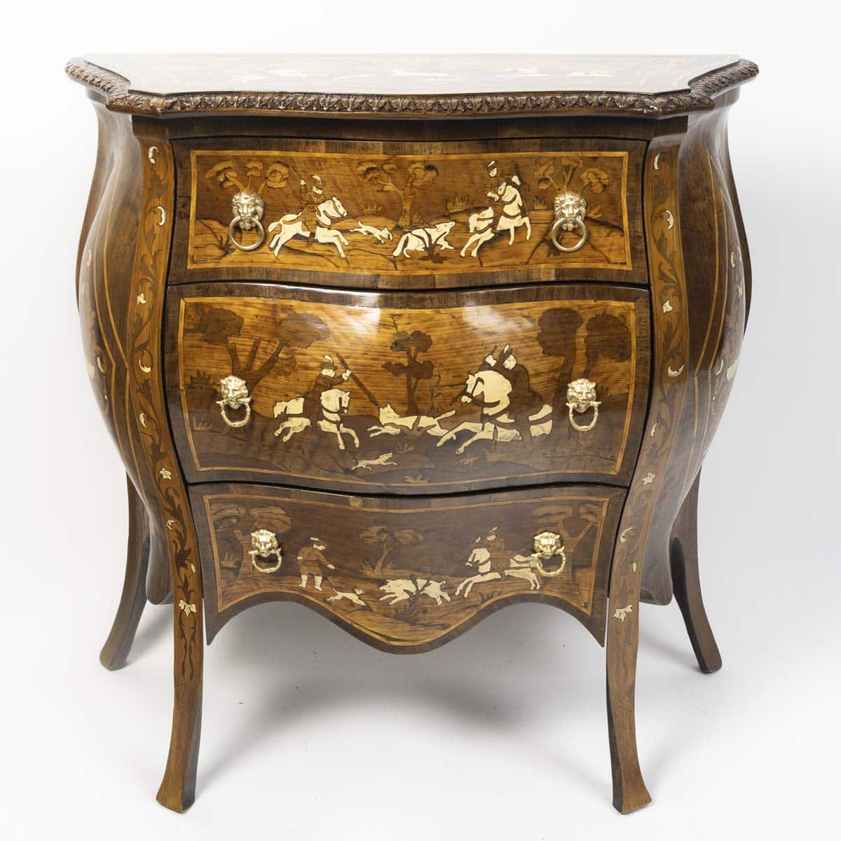Rare commode lombarde d’entre deux en noyer et marqueterie de bois fruitier, os et nacre. L’ensemble à décor marqueté de scènes de chasse de lion, de cerf, de loup et de sanglier. Elle ouvre en façade galbée et cintrée par trois tiroirs à traverses sculptées.