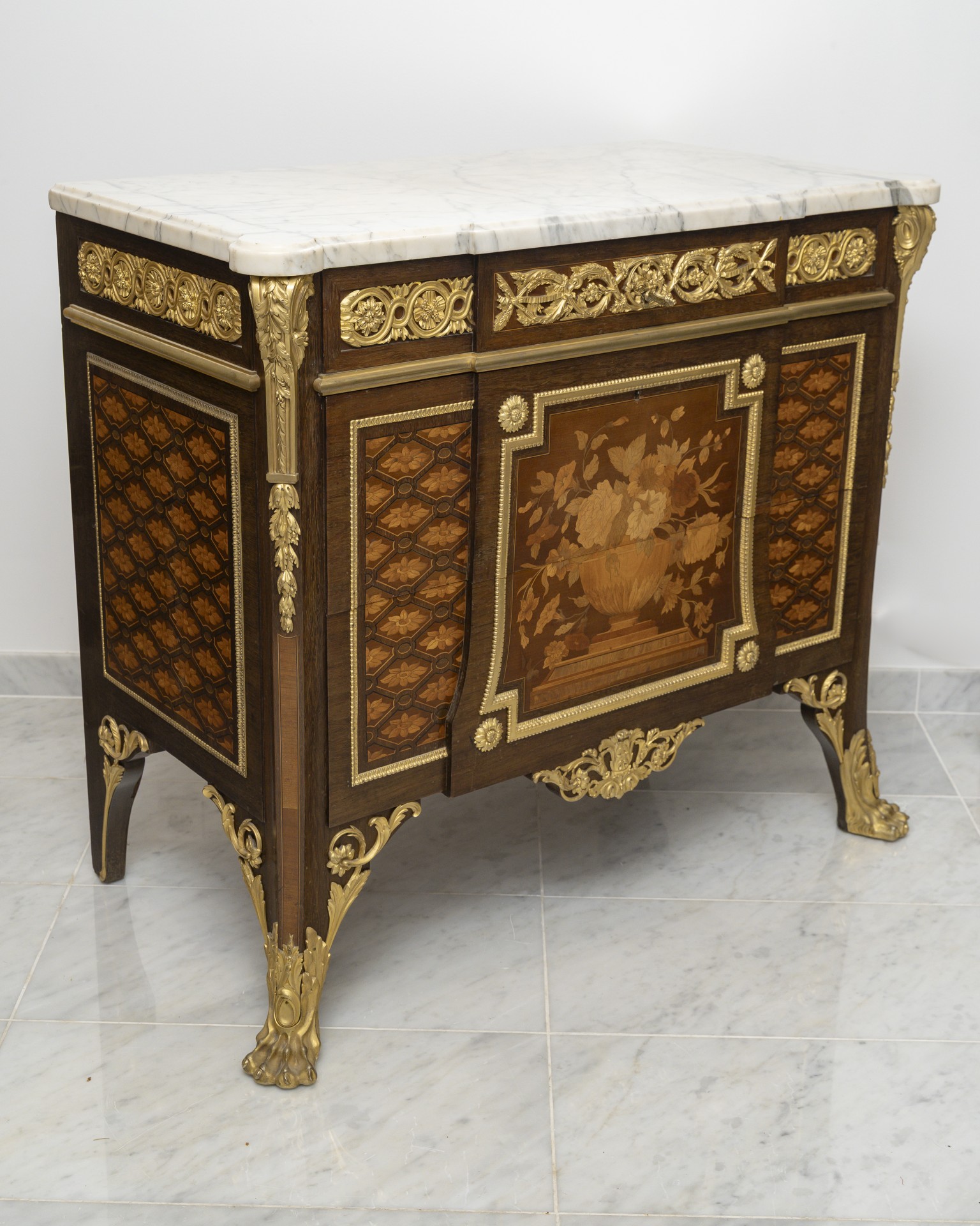 La marqueterie, d’une exécution soignée, présente des motifs de bouquets et de rinceaux fleuris, réalisés à partir de plusieurs essences de bois précieux, offrant un jeu de nuances chaudes et lumineuses.