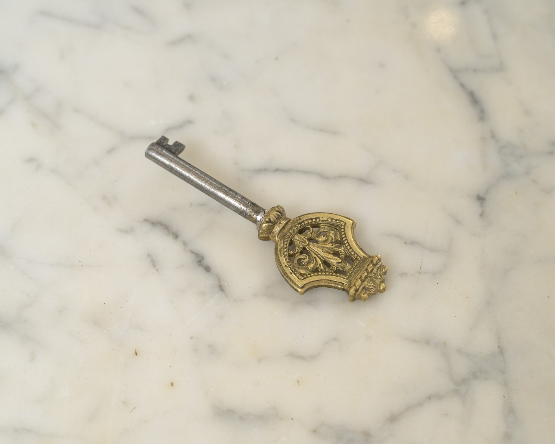 Les deux grands tiroirs inférieurs sont pourvus d’une fermeture ingénieuse : un système de serrure dissimulé permet de les verrouiller simultanément par la clé du tiroir supérieur, véritable prouesse d’ébénisterie du XIXe siècle.