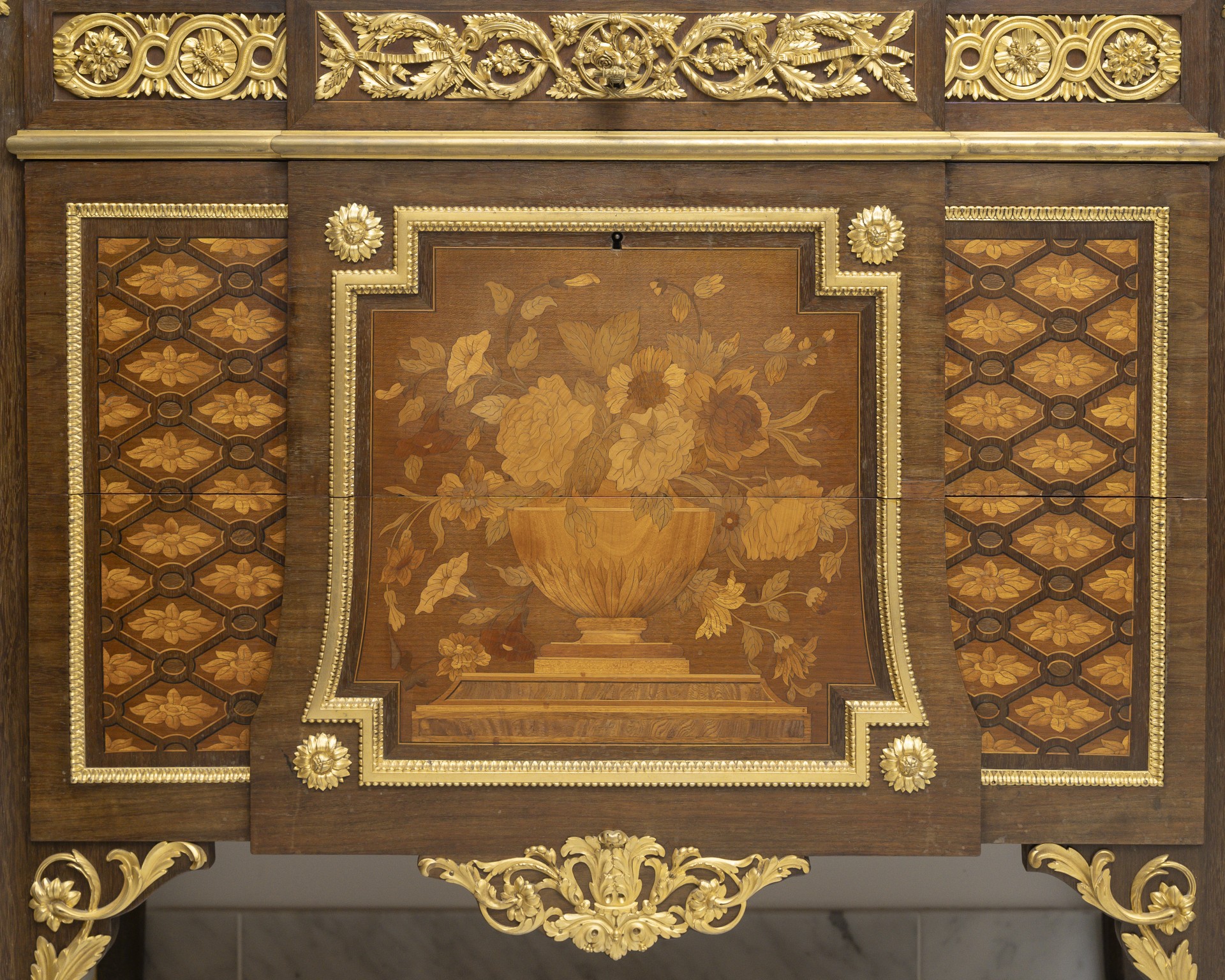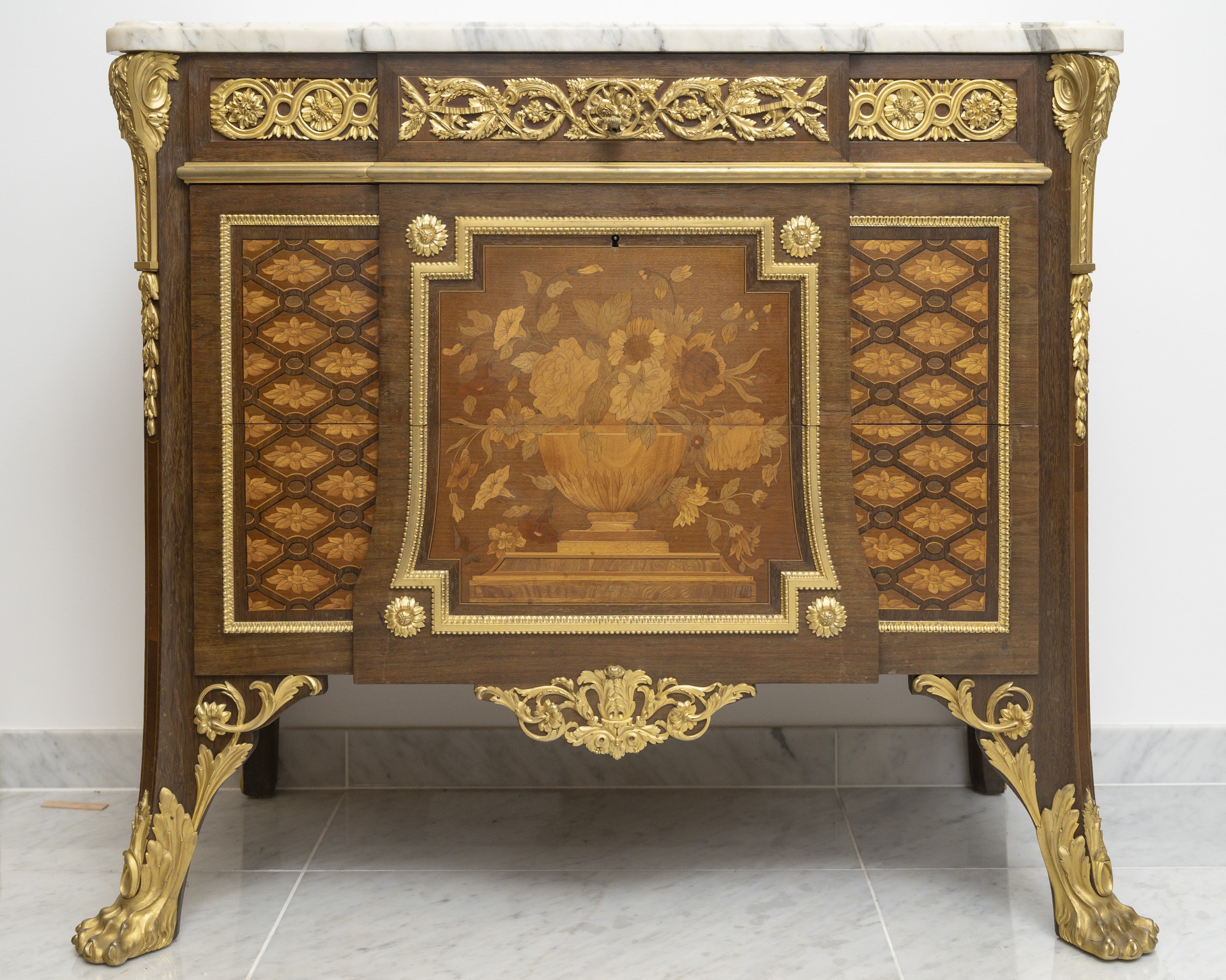 Elle est réalisée en marqueterie de bois précieux – amarante, citronnier, poirier et palissandre – et ornée de bronzes finement ciselés et dorés au mercure.