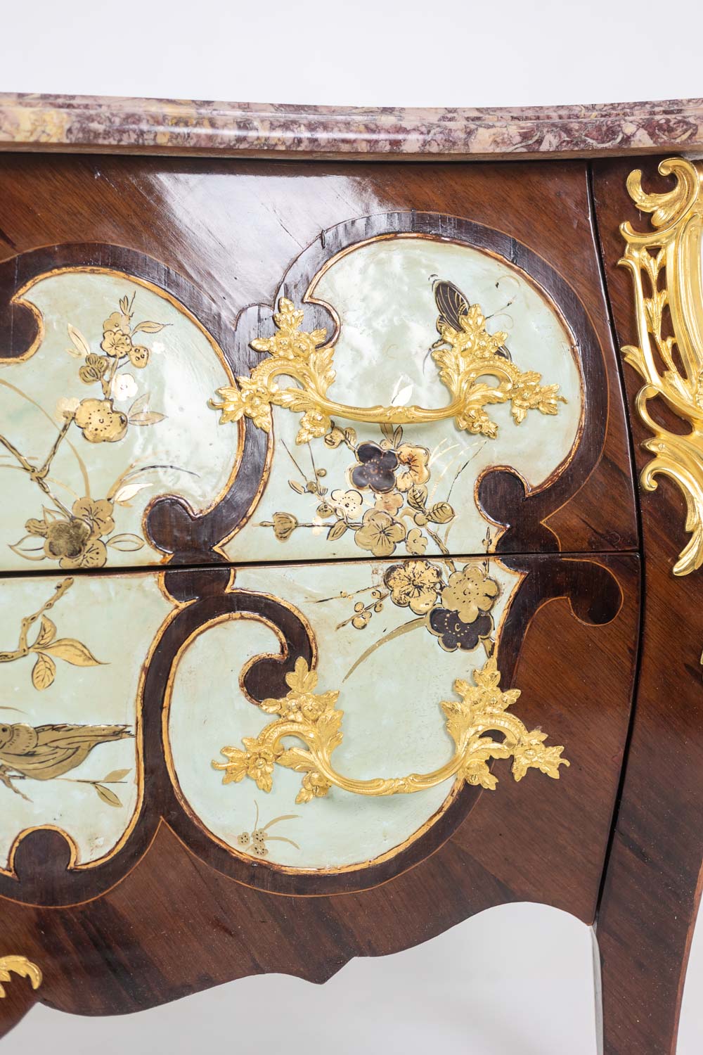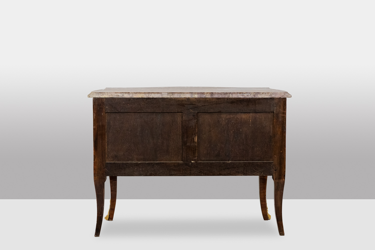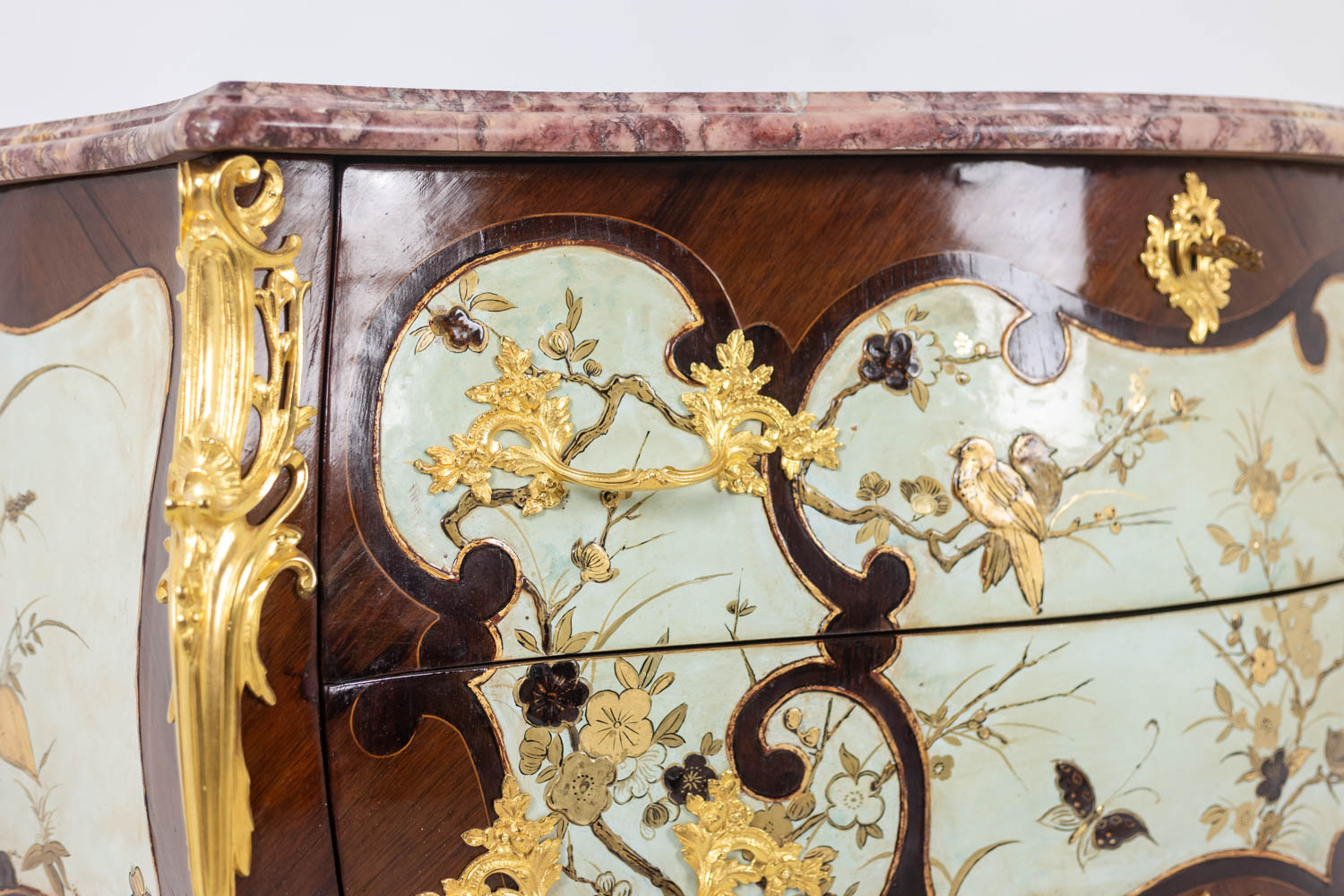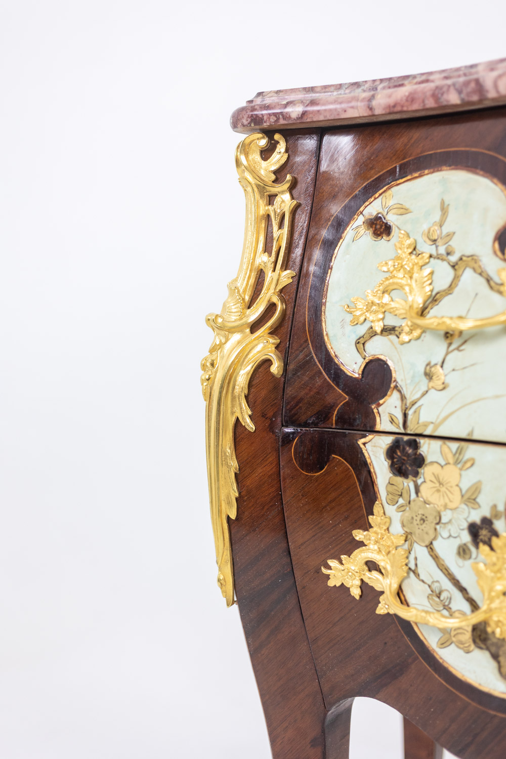 Commode sauteuse de style Louis XV, ouvrant à 2 tiroirs sans traverse, en bois de placage marqueté et ornée de bronze doré. Décor peint de fleurs dans des cartouches. Plateau en marbre griotte.