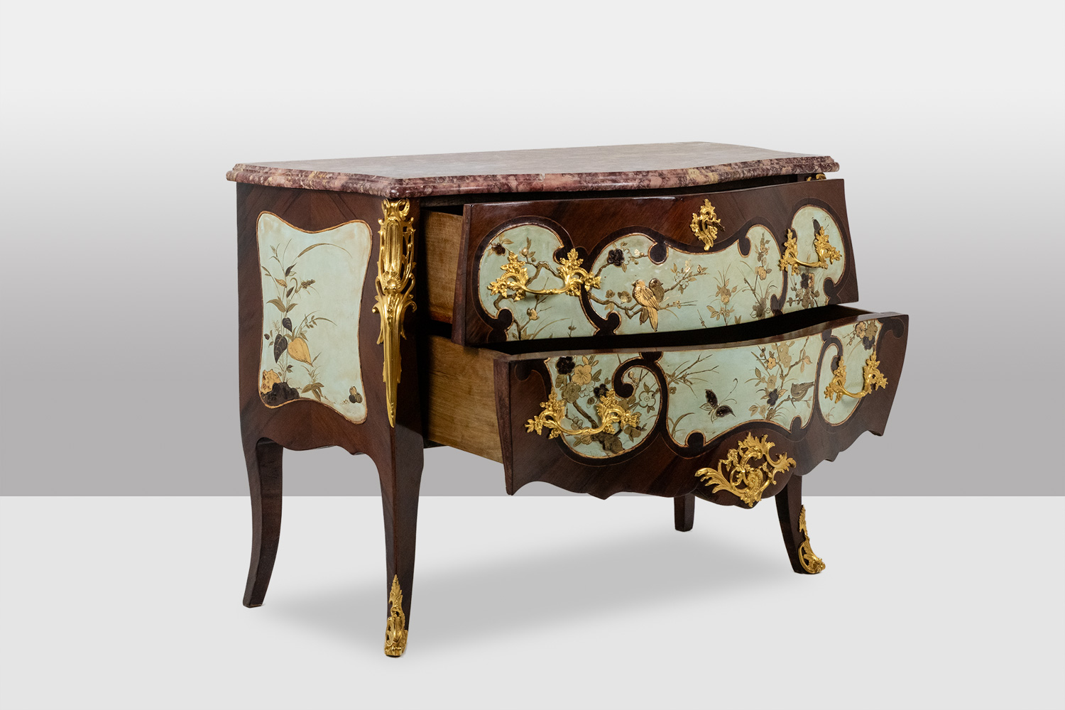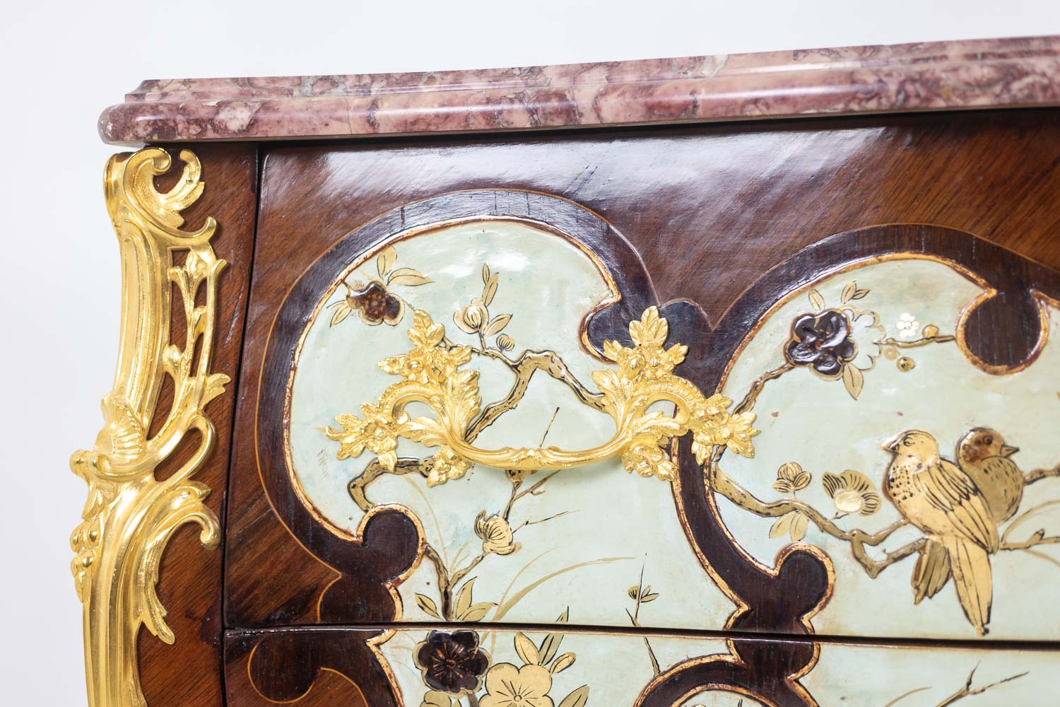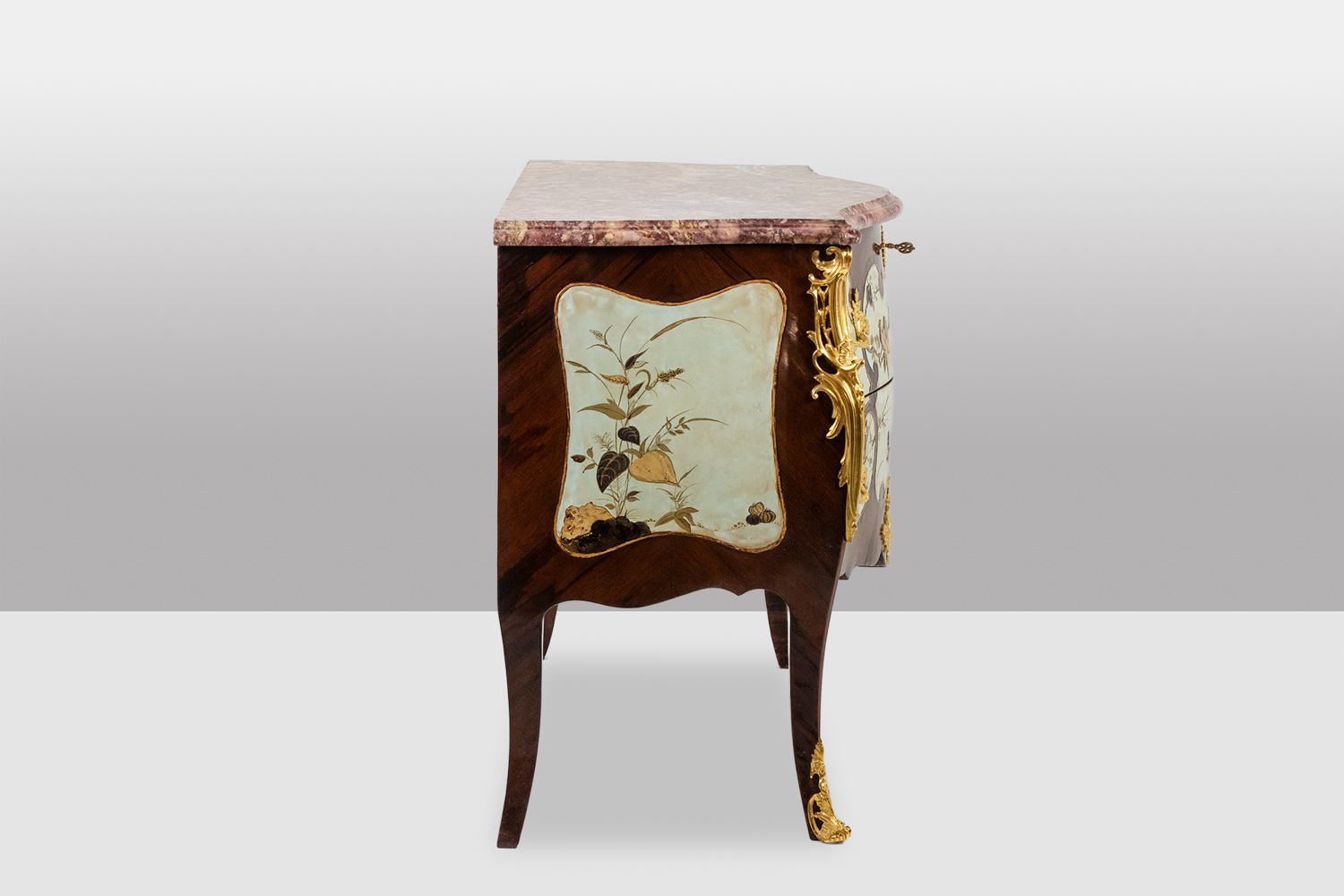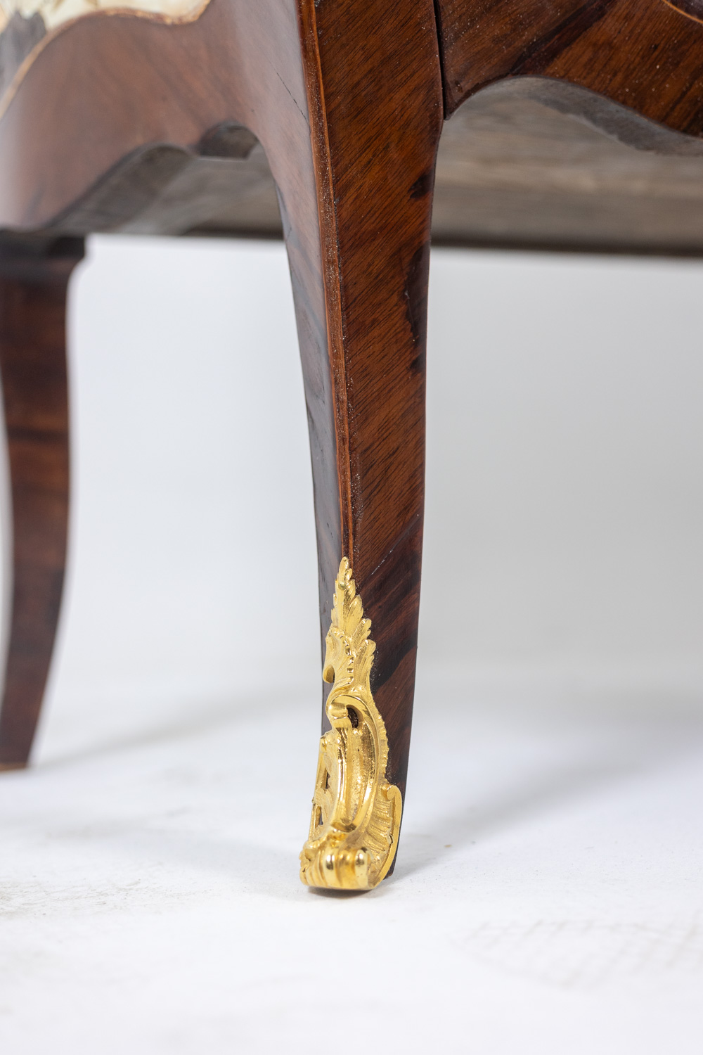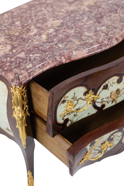 Commode sauteuse de style Louis XV, ouvrant à 2 tiroirs sans traverse, en bois de placage marqueté et ornée de bronze doré. Décor peint de fleurs dans des cartouches. Plateau en marbre griotte.