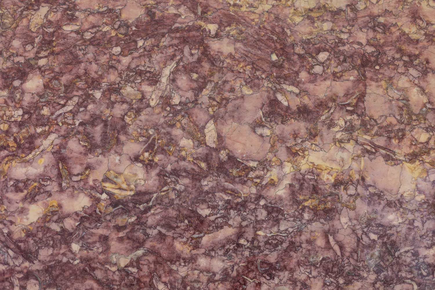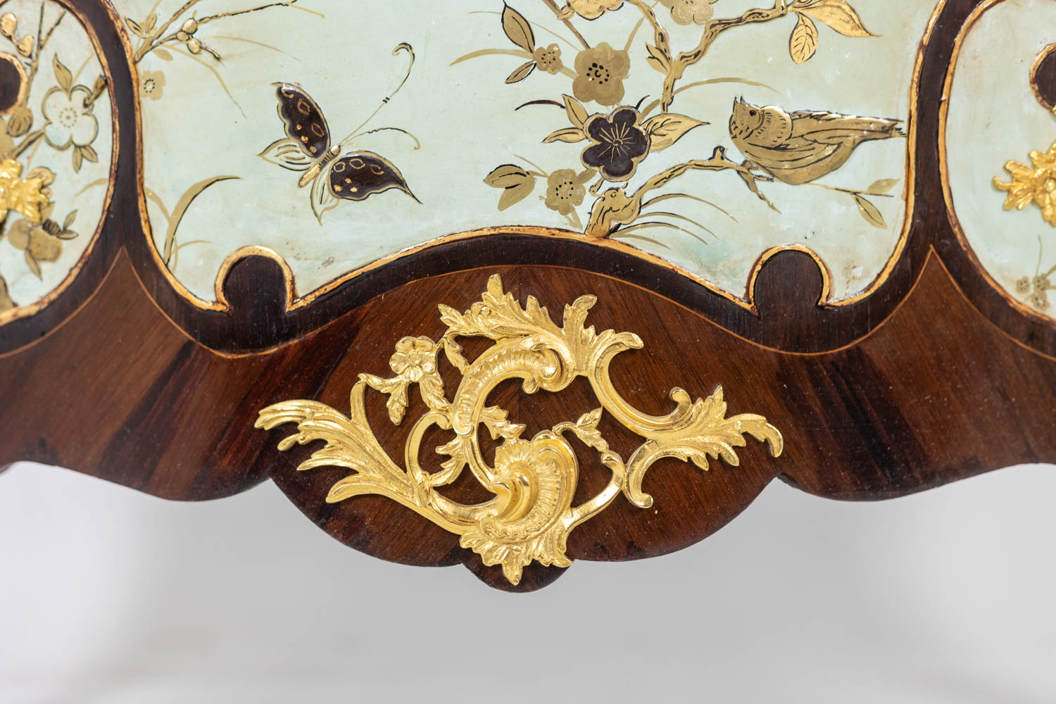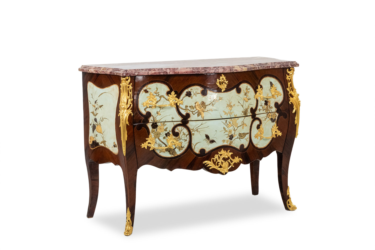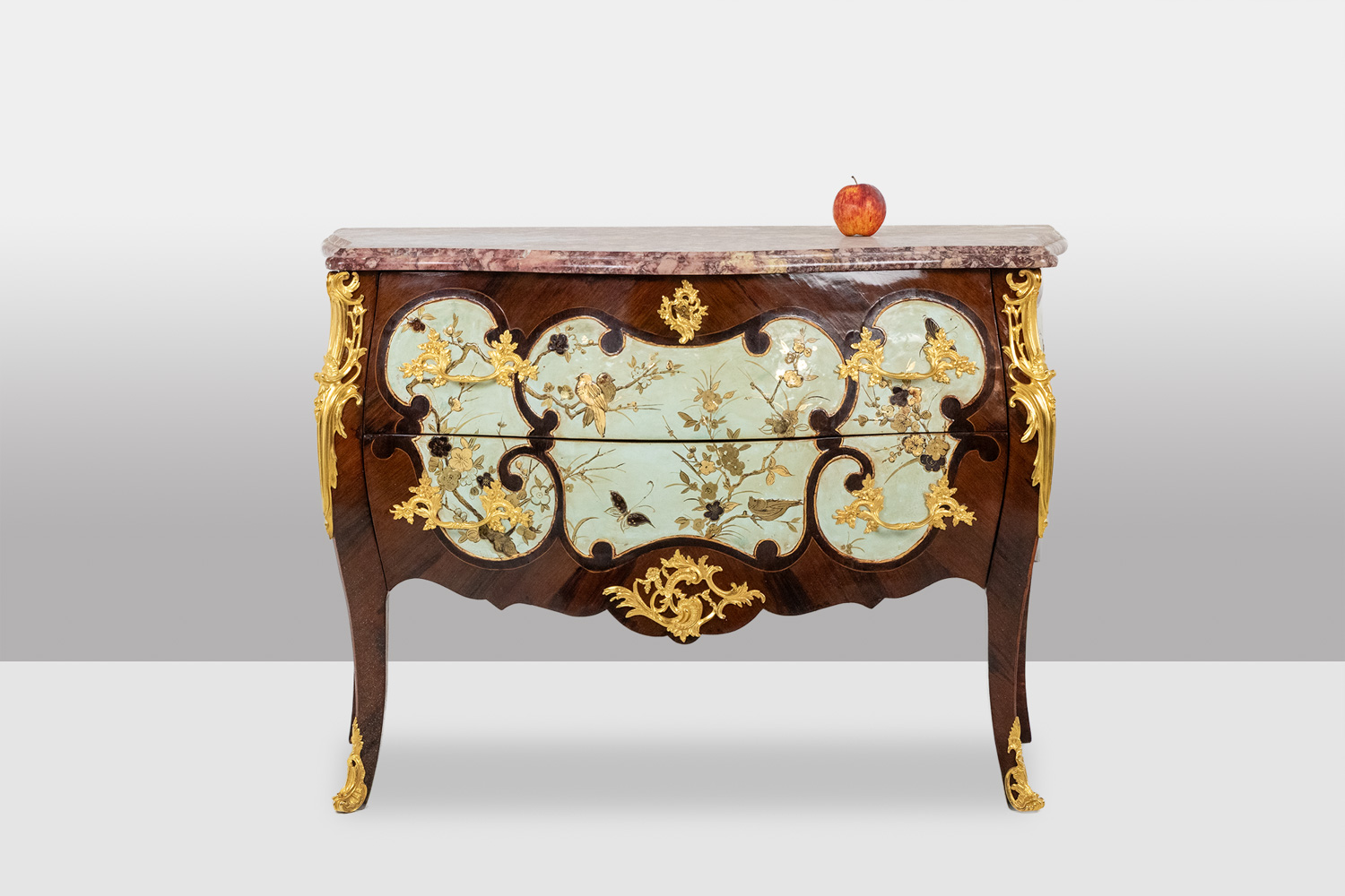 Commode sauteuse de style Louis XV, ouvrant à 2 tiroirs sans traverse, en bois de placage marqueté et ornée de bronze doré. Décor peint de fleurs dans des cartouches. Plateau en marbre griotte.