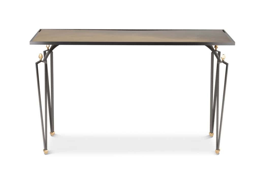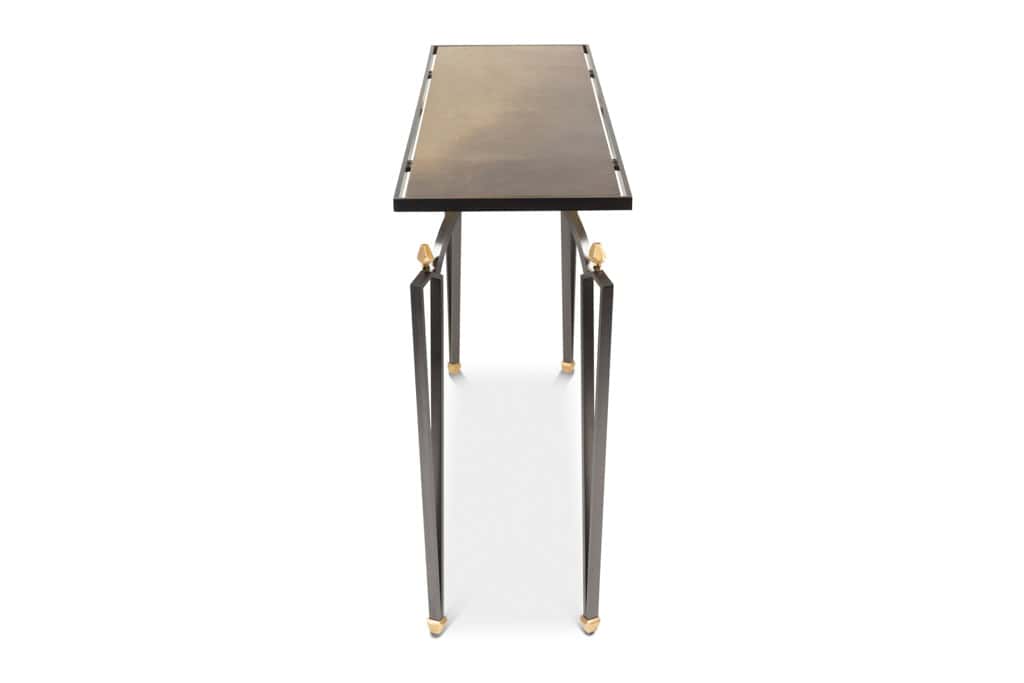 Console rectangulaire en acier brillant teinte canon de fusil, plateau en laiton patiné en dégradé, sur un piètement acier terminé par des sabots en laiton doré brossé.