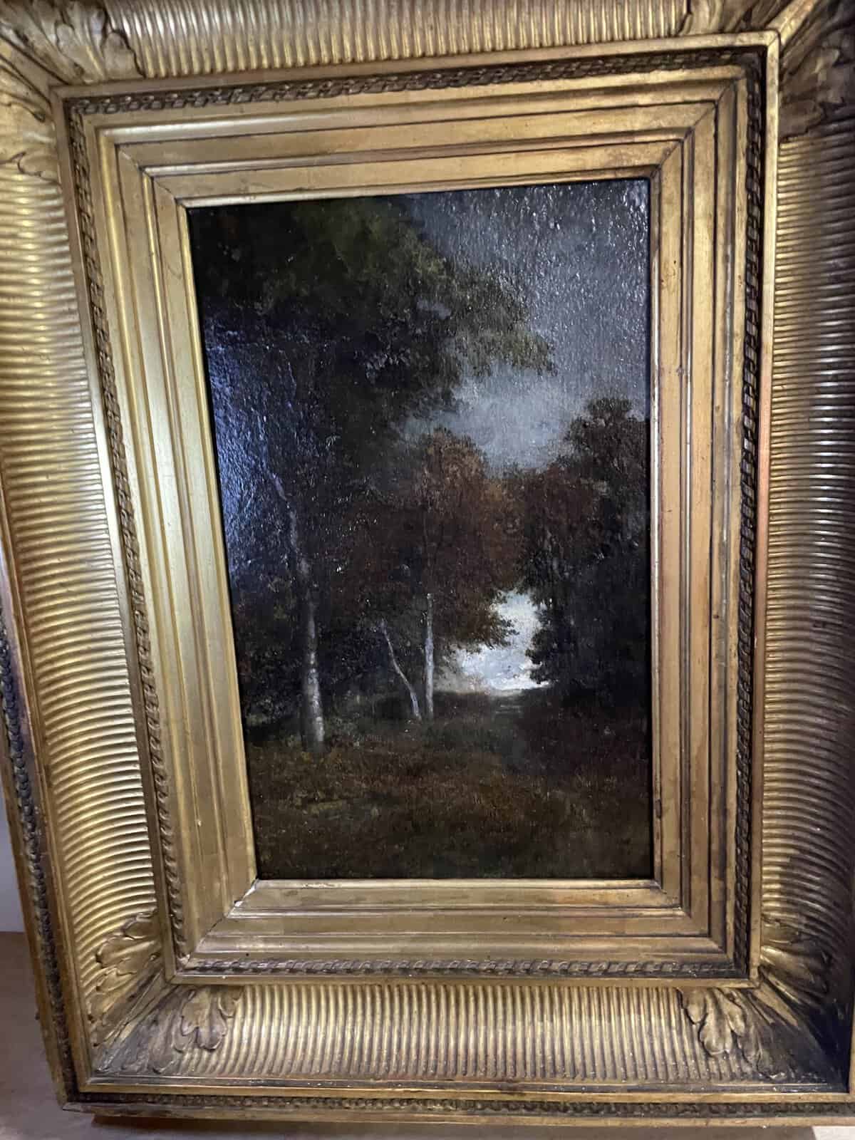 Sous bois ,cachet de la vente en bas à gauche ,et étiquette d’exposition à l’arrière.