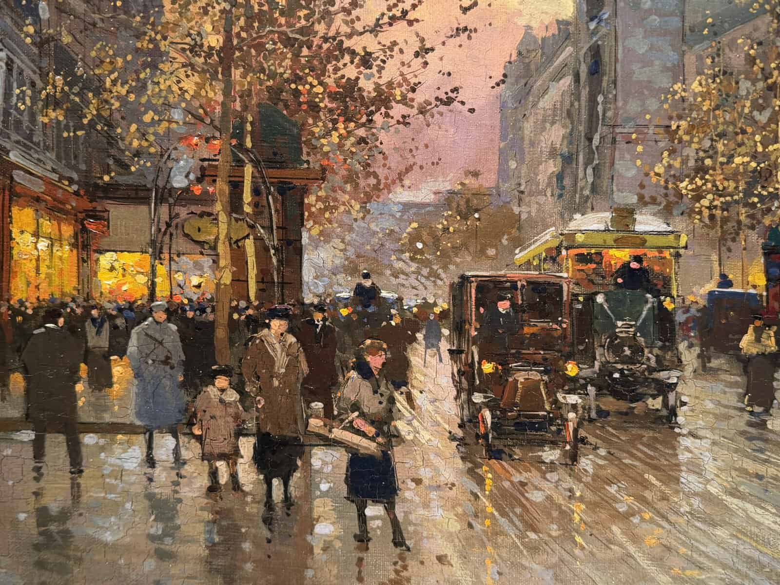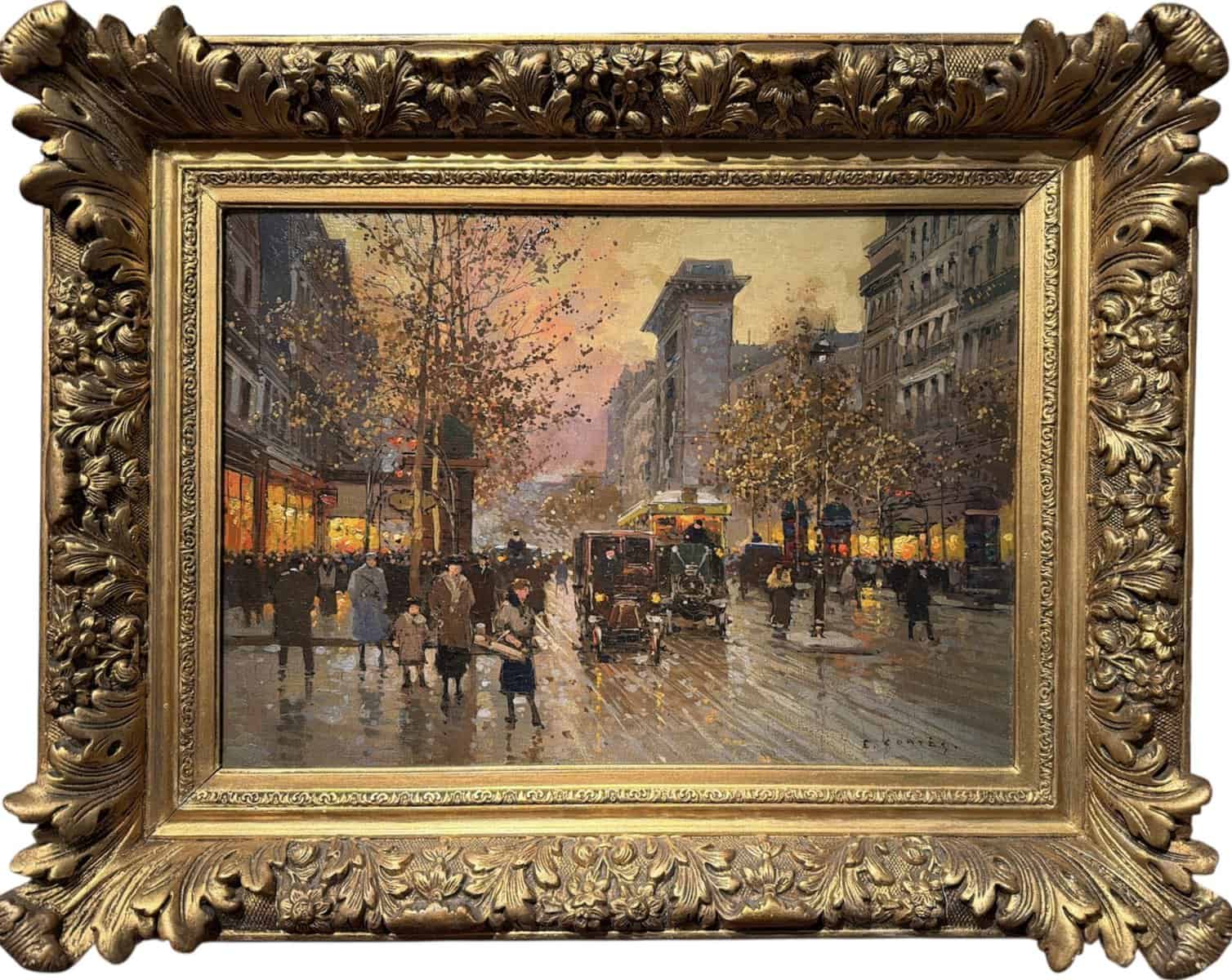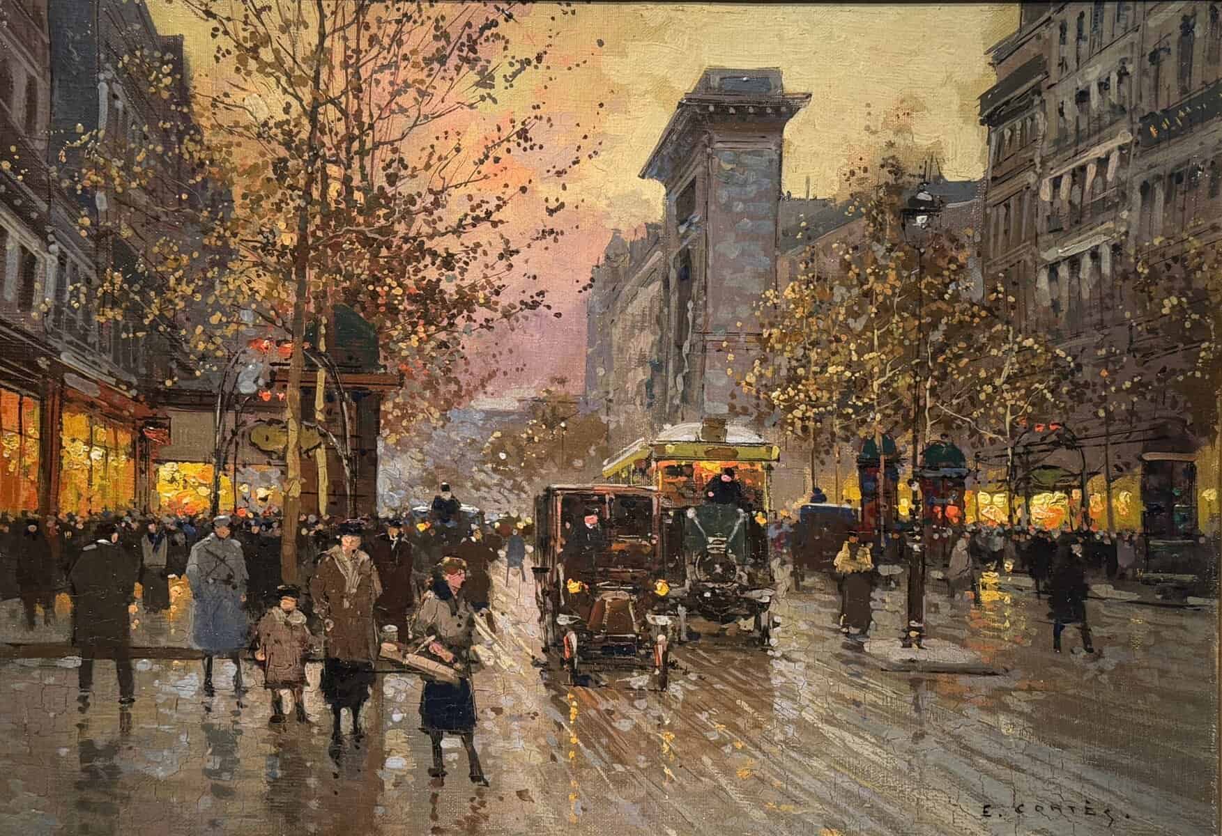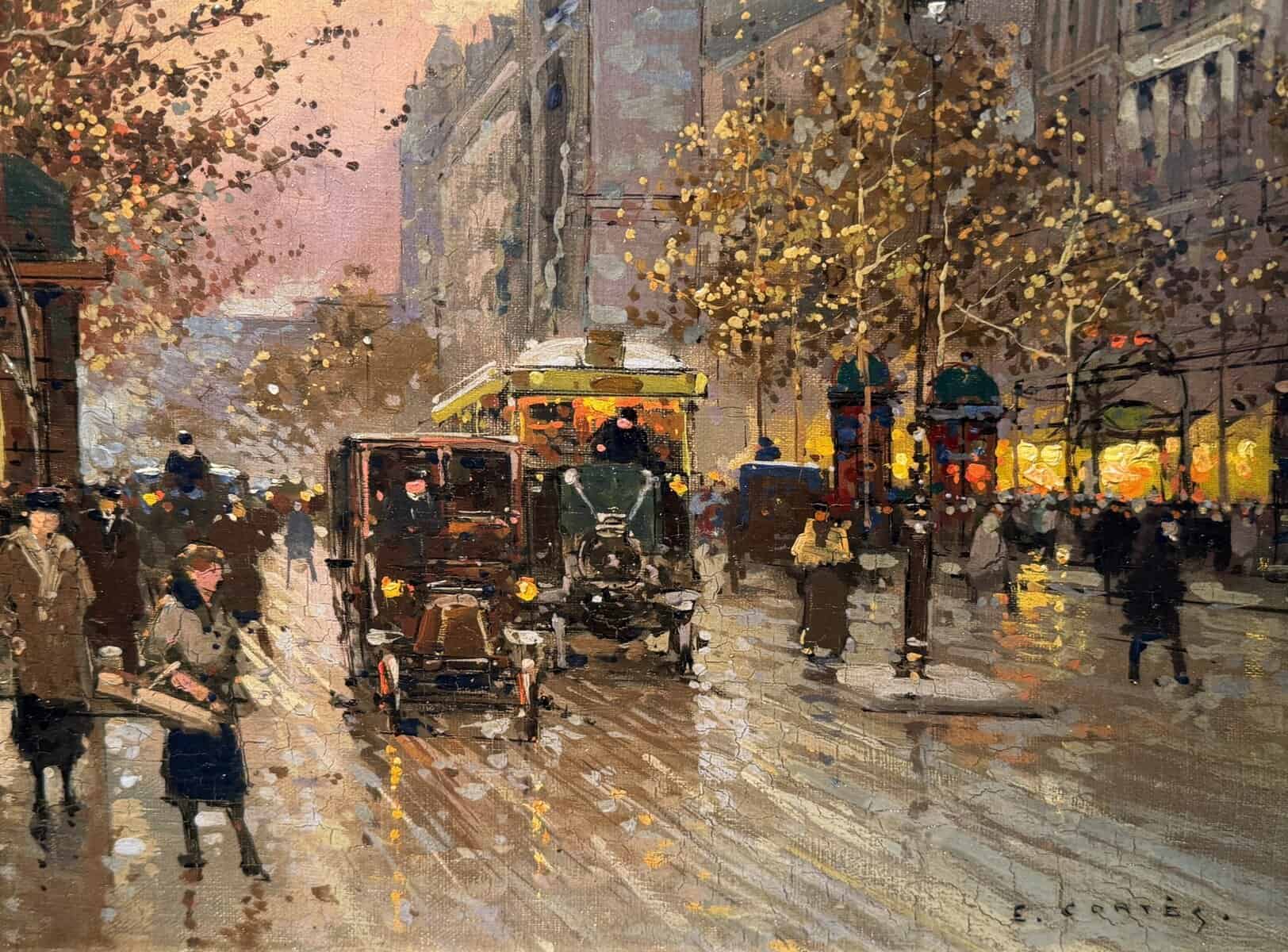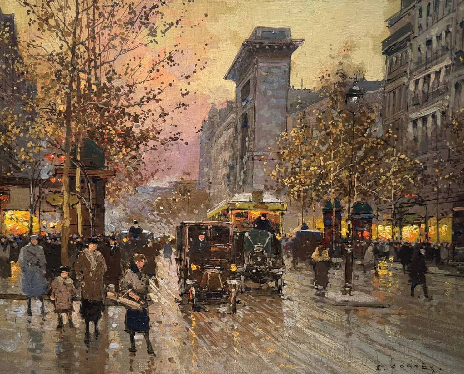 CORTÈS Edouard Edouard Cortès ( Edouard León Cortès ), 1882 / 1969 ( Français d’un père Espagnol ). Peintre postimpressionniste et fils d’un peintre réputé de la cour espagnole ( Antonio Cortés y Aguilar ), il est diplômé de l’École nationale supérieure des Beaux-Arts, et réalise sa première exposition en 1902 au Salon des artistes français, y devenant un membre permanent et pour laquelle il expose tous les ans. Cortès se spécialise très vite dans les paysages urbains et en particulier les représentations de Paris. En 1907, il organise une vente aux enchères de ses Vues de Paris à l’Hôtel Drouot, évènement qui lui vaudra un succès éternel. En 1915, il reçoit une médaille d’argent au Salon des artistes français et une médaille d’or au Salon des indépendants. Cortès utilise des couleurs teintées comme le rouge ou le jaune afin de représenter les appartements pleins de vie ou les enseignes de magasins illuminées la nuit. Il joue sur les effets météorologiques et montre ainsi Paris sous toutes ses coutures ; enneigée, ensoleillée, en hiver, en été, à l’aube, au crépuscule, le jour, la nuit.
