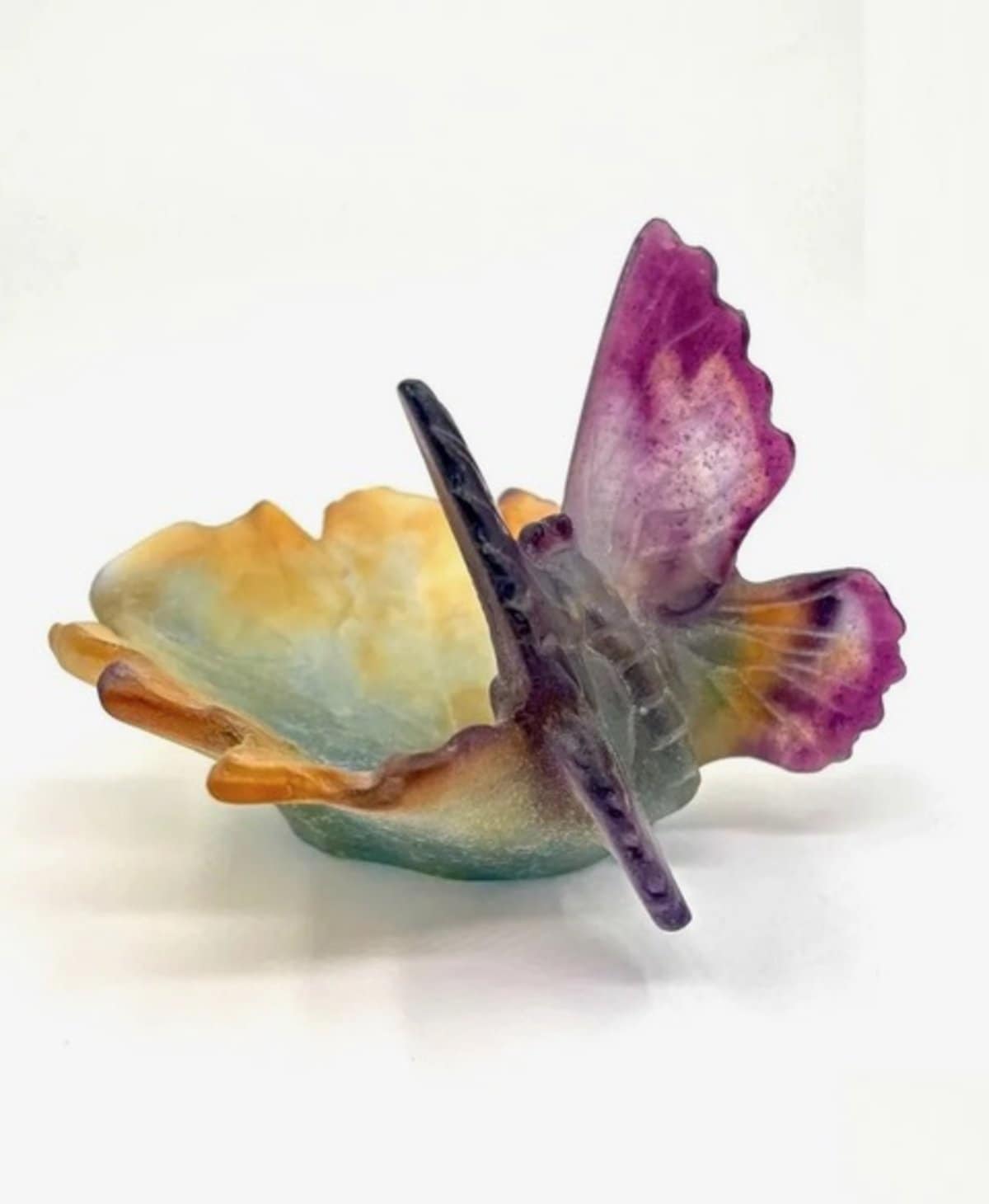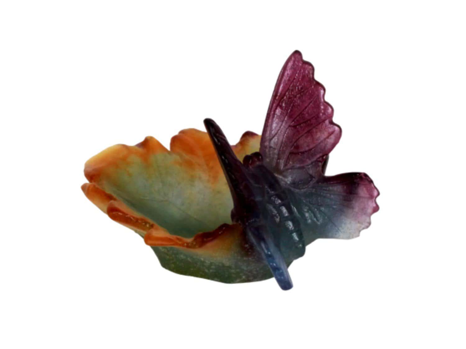 DAUM France Petit vide poches en pâte de verre nuancée violet, bleu et jaune figurant un papillon posé sur une feuille de platane .
