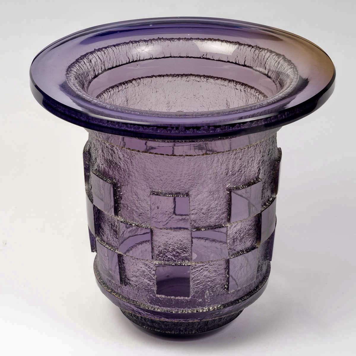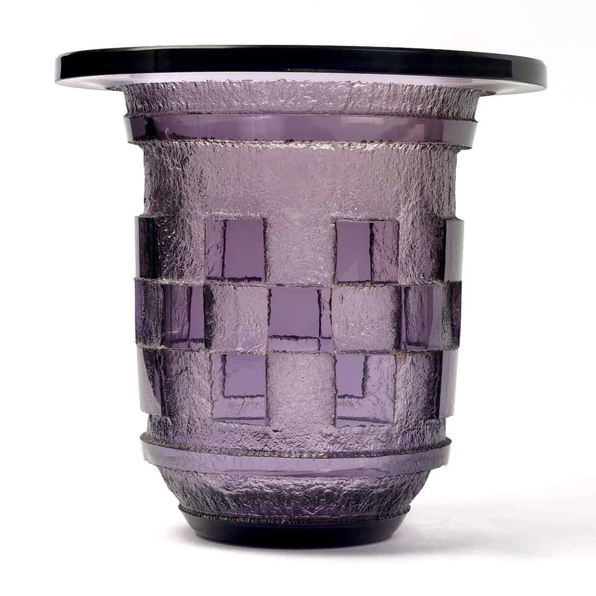 Vase Art Déco à décor géométrique en verre améthyste profondément dégagé à l’acide de Daum Nancy créé dans les années 1930.