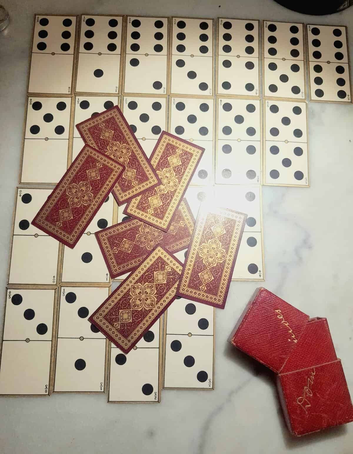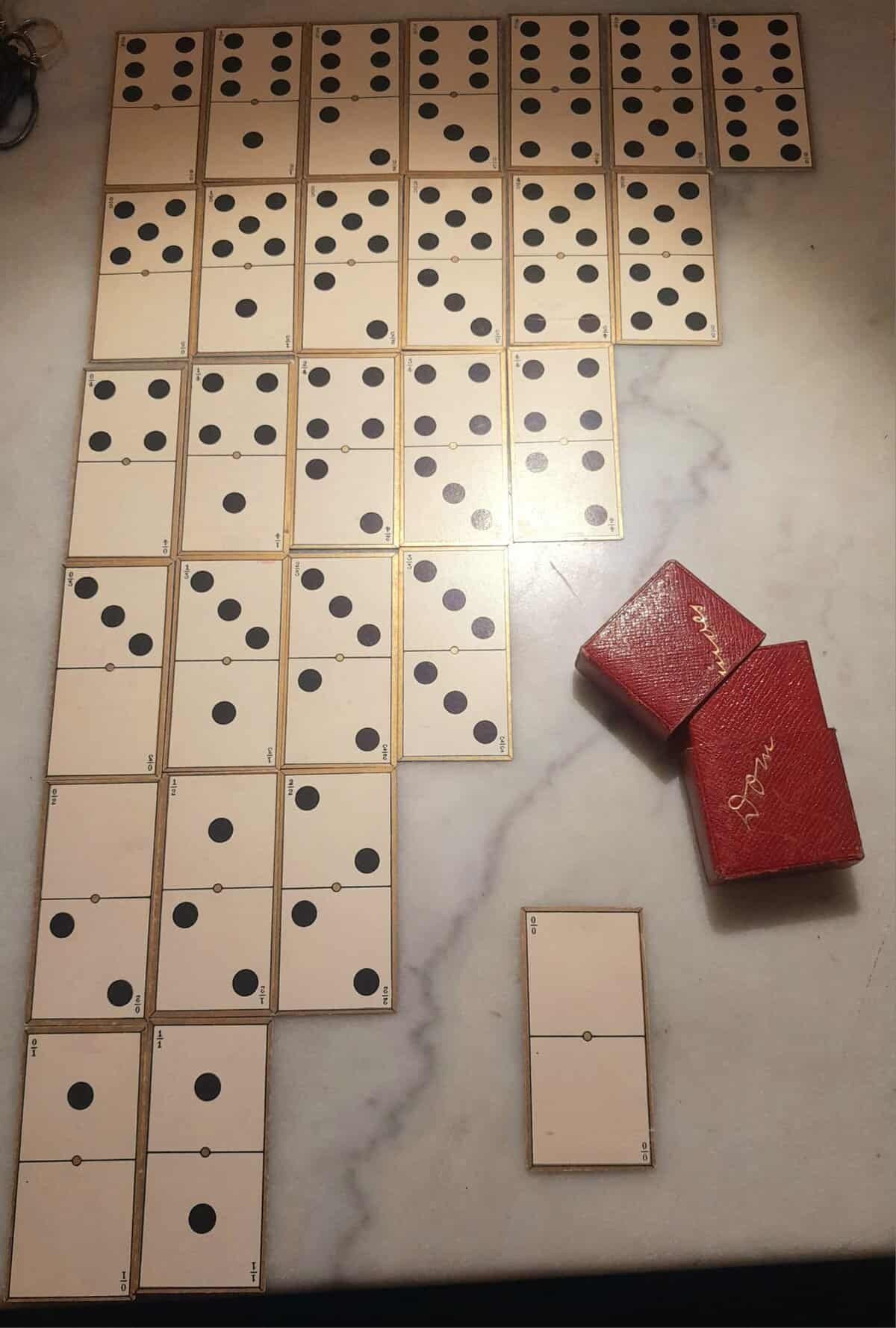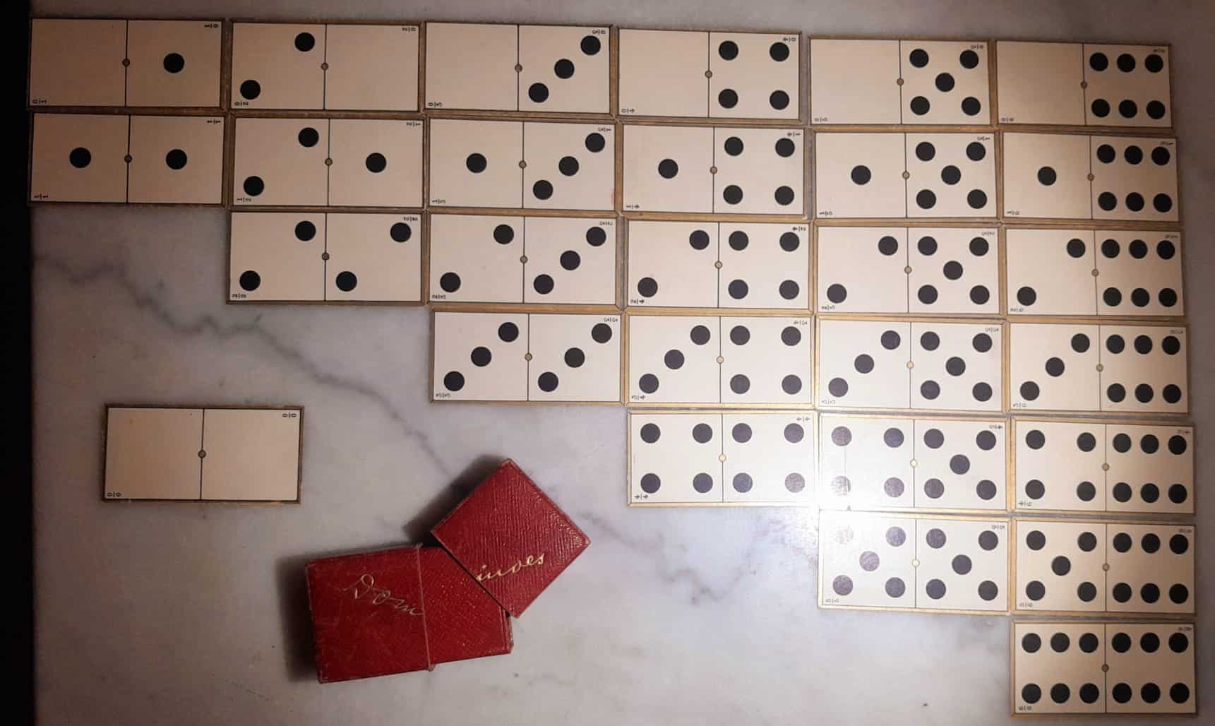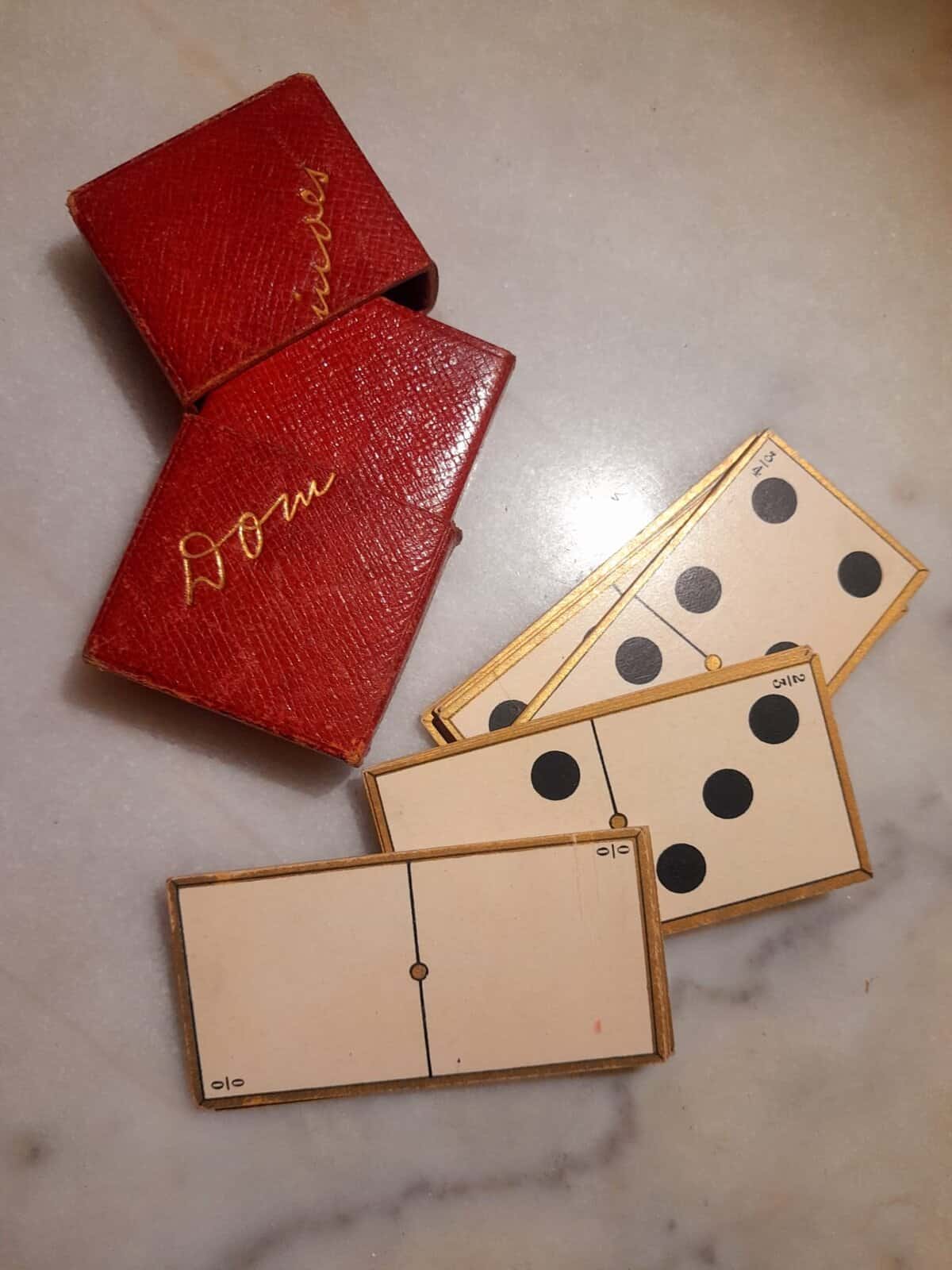 Dominos de voyage en papier, dans son étui rouge gauffré or. Vers 1900, édités à Paris