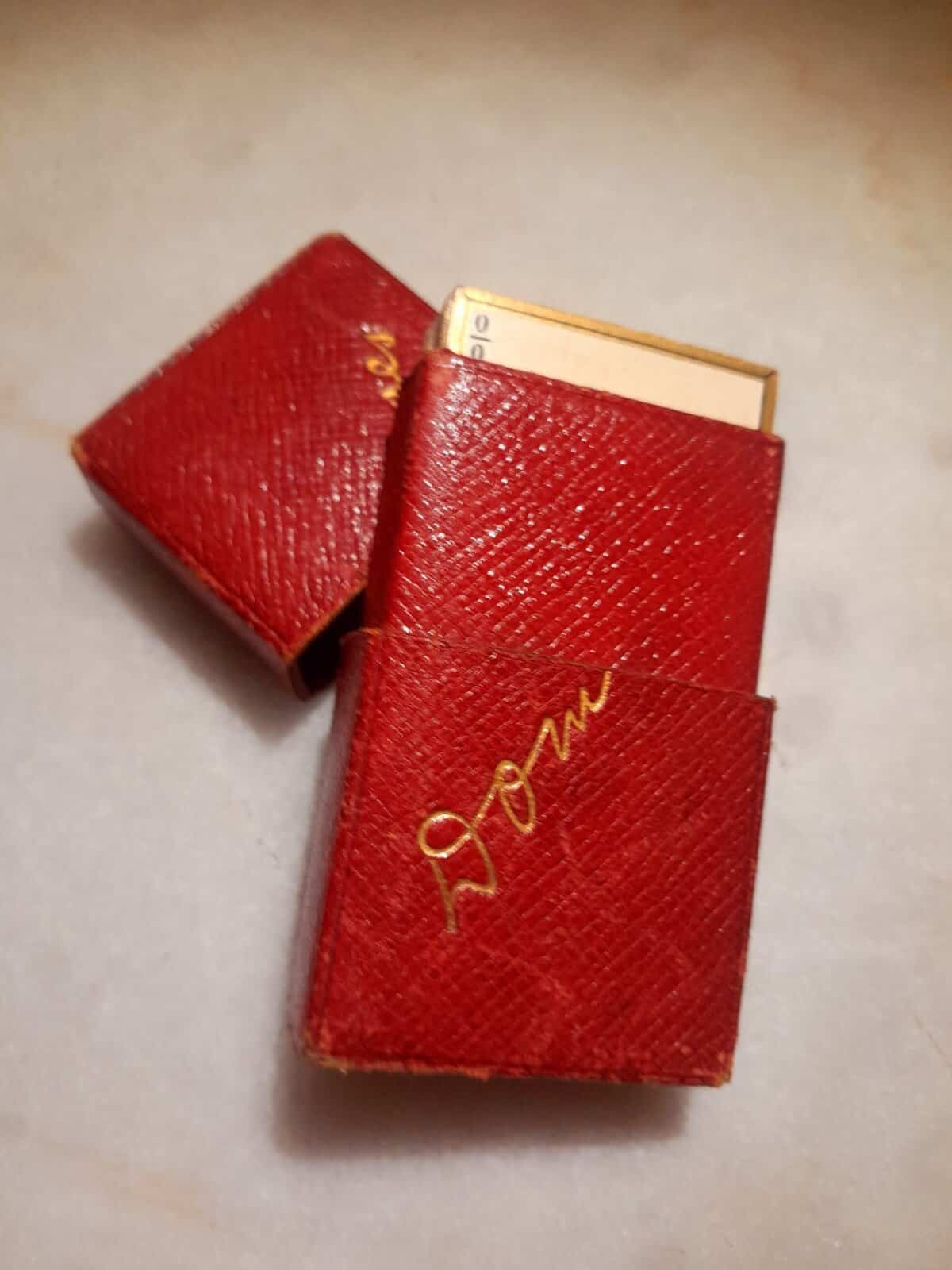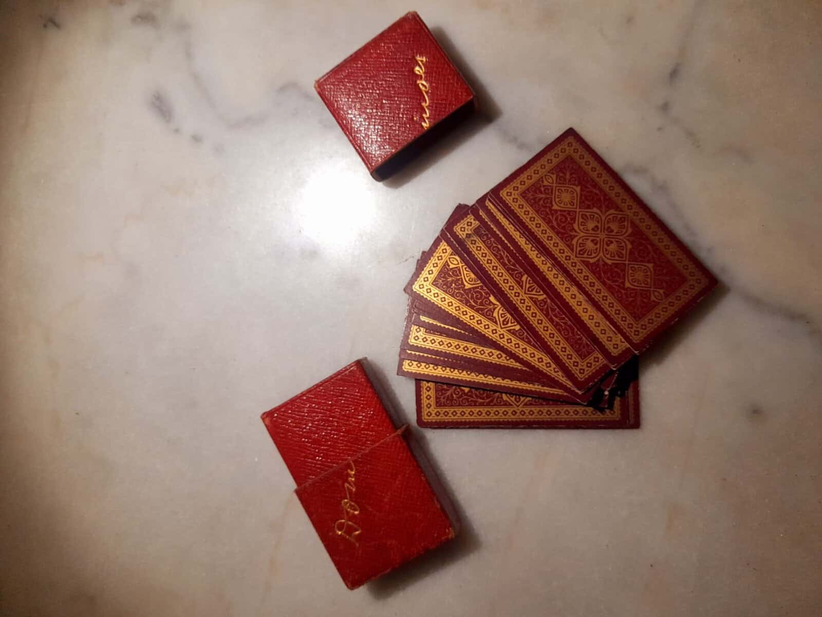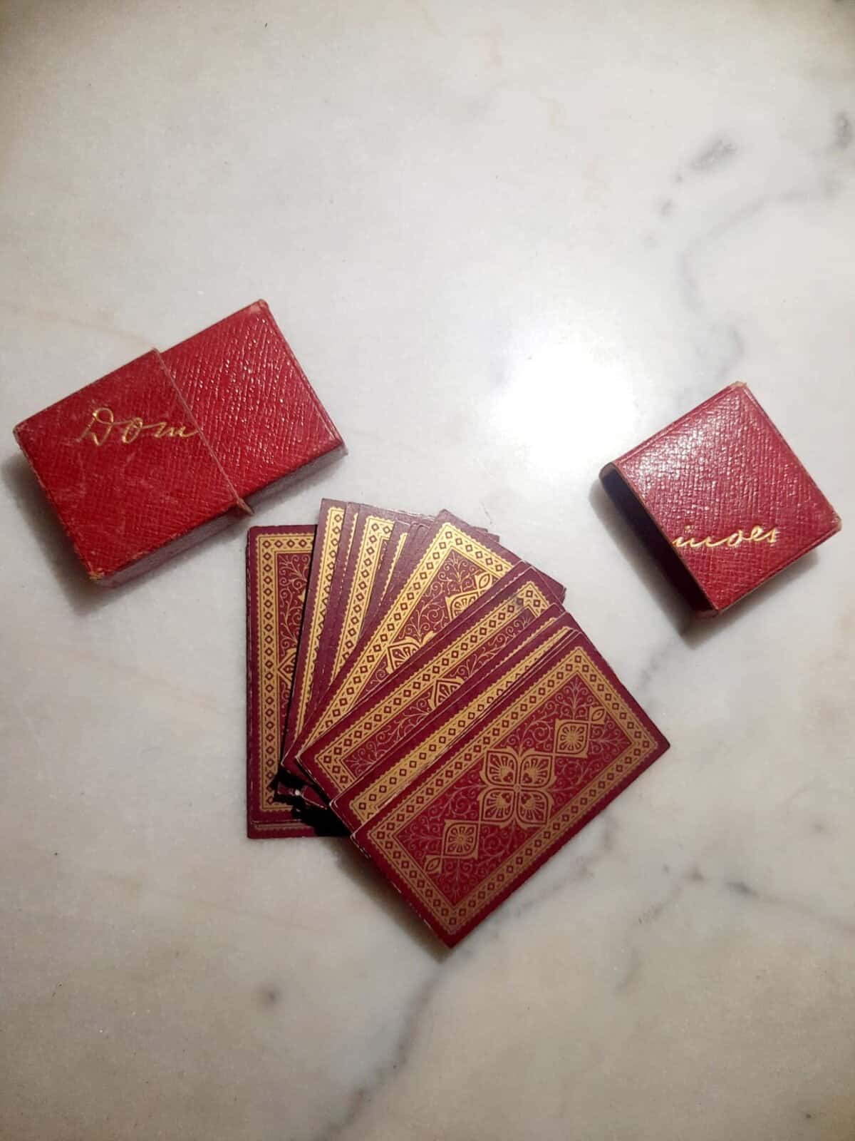Élégant jeu de dominos de voyage en papier, dans son étui rouge gauffré or.