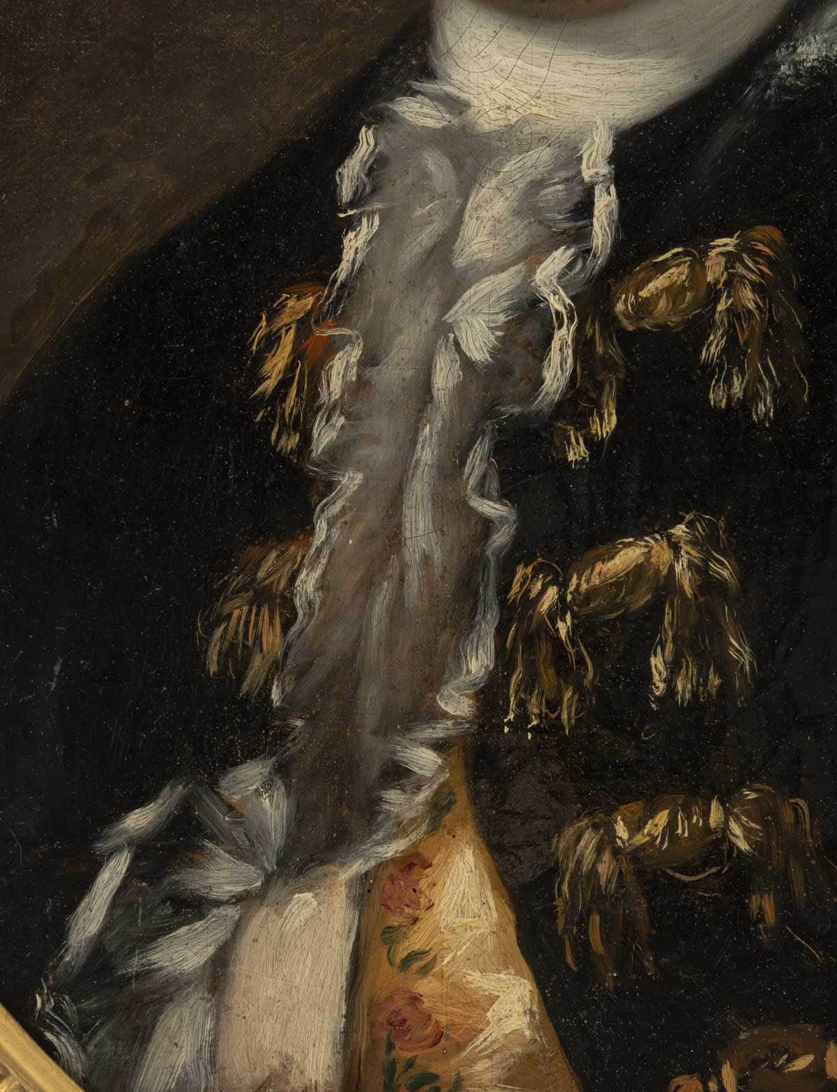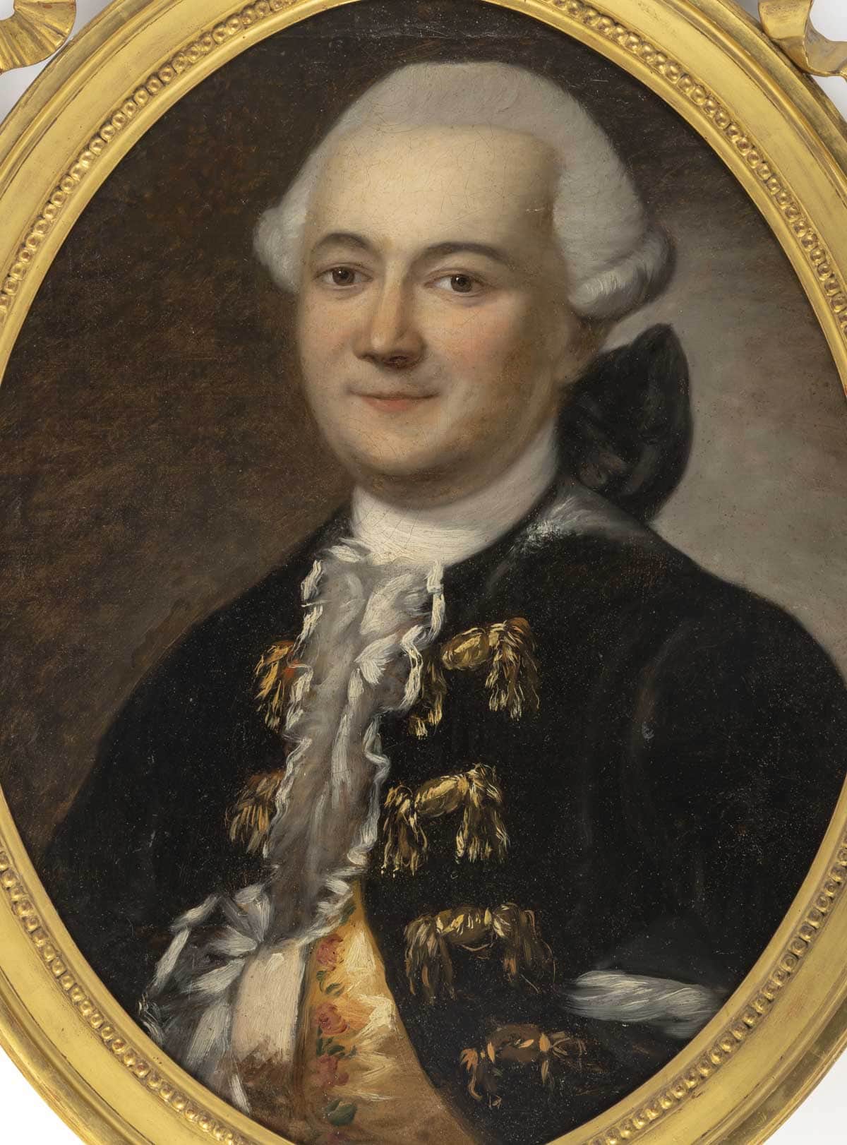 C’est un portrait raffiné d’un homme de qualité en redingote noire brodée et d’un gilet en soie de couleur orange que nous vous présentons.
