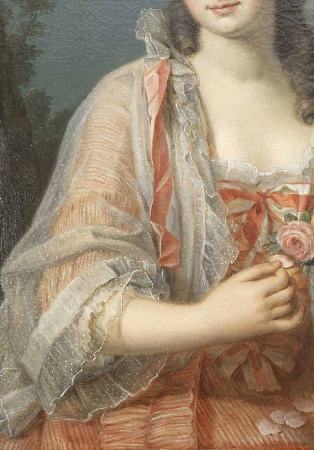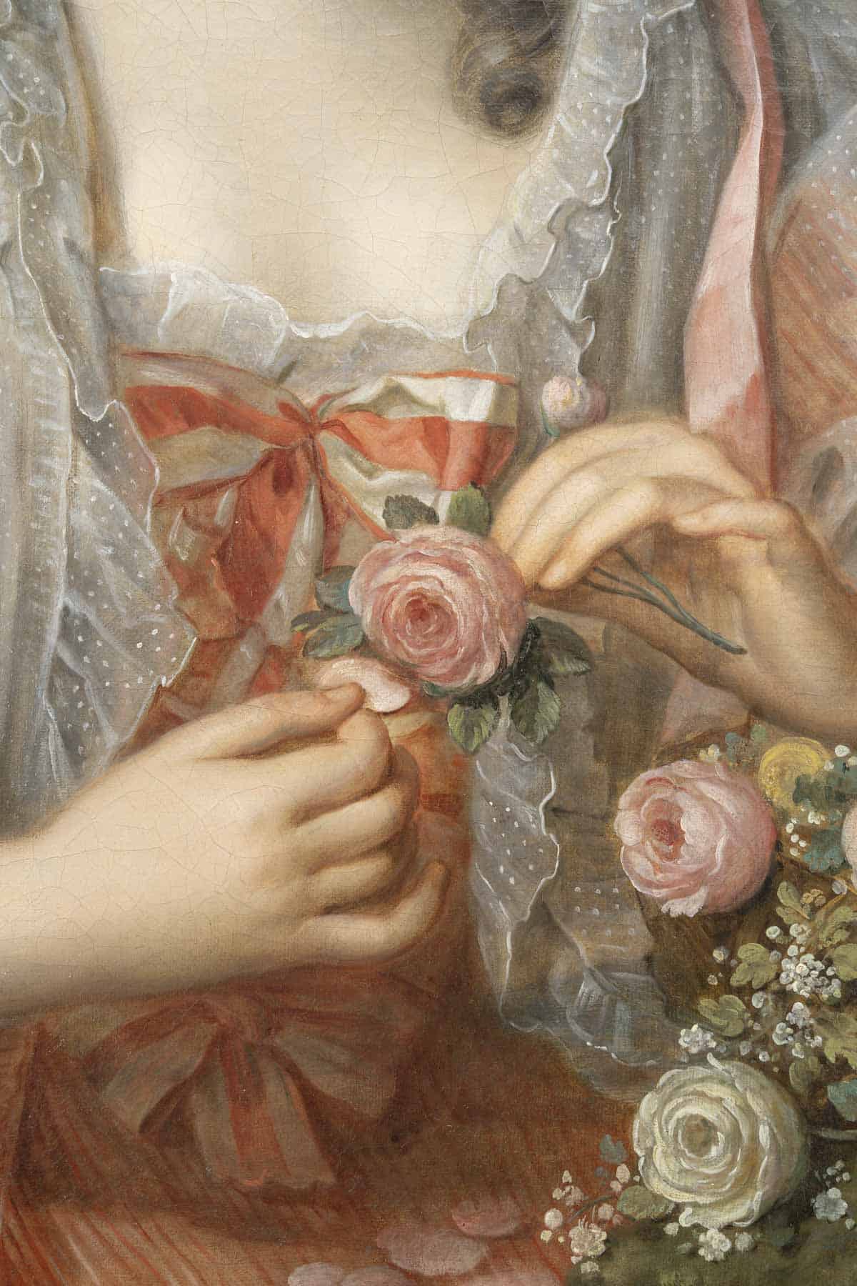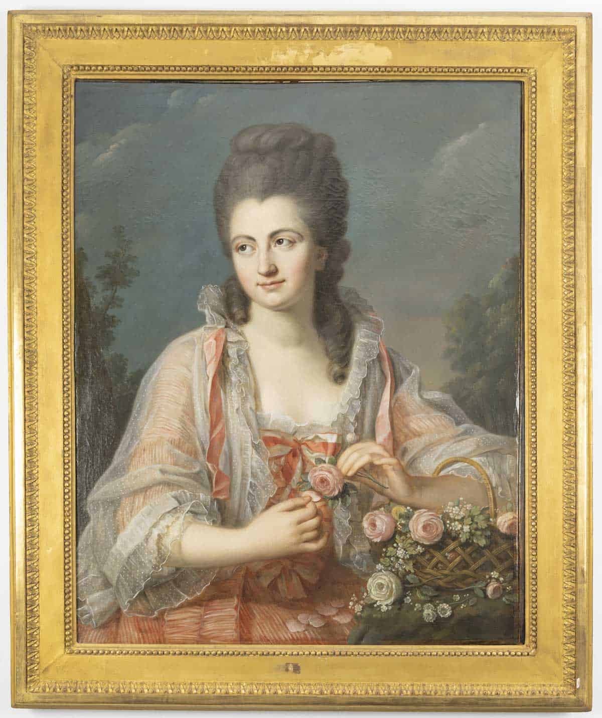 Ce très beau portrait du XVIIIème siècle attribué à Nicolas-Guy Brenet (1728-1792) nous présente une jeune dame de qualité vêtue d’une magnifique robe de mouseline rose sur un corsage en voile blanc transparent laissant deviner ses bras. Elle tient un panier de roses, entre ses mains une rose semble être destinée à quelqu’un. Le regard pensif, un léger sourire, son port de tête est d’une grande élégance. Ce portrait nous rappelle l’influence des écrits de Rousseau sur les arts au XVIIIème siècle.