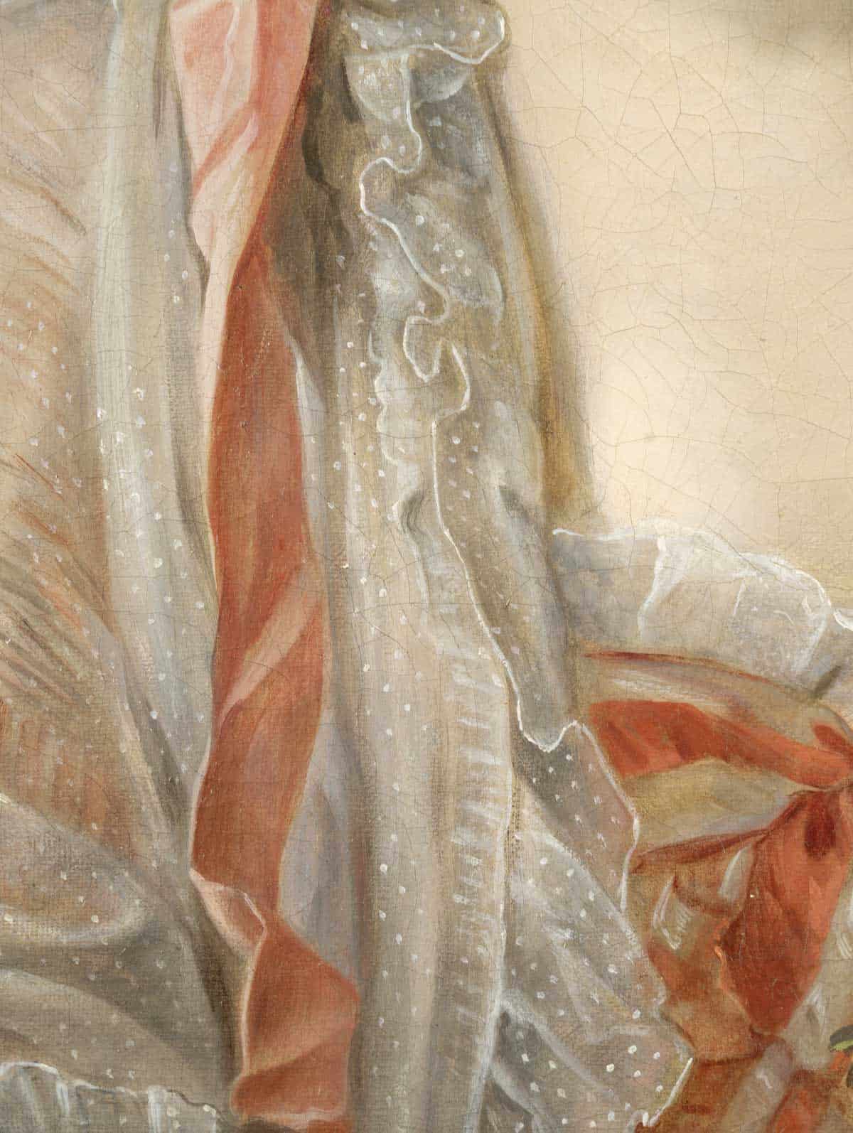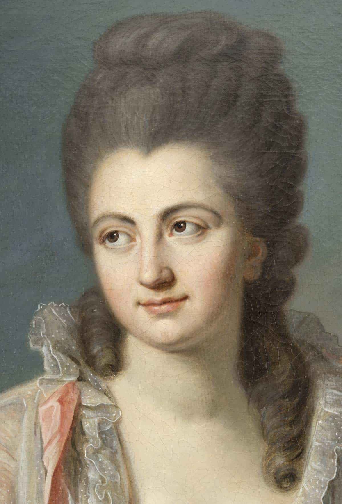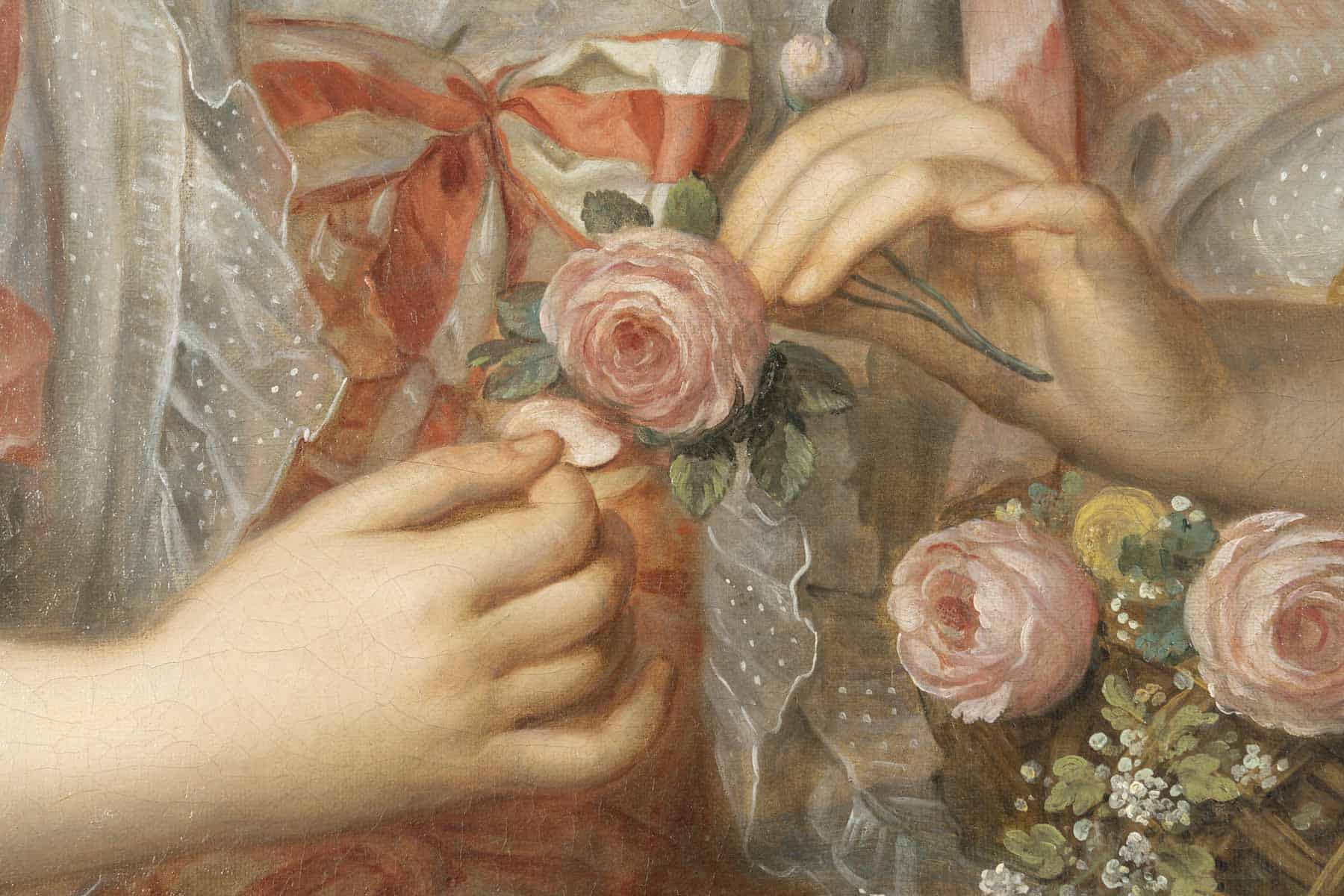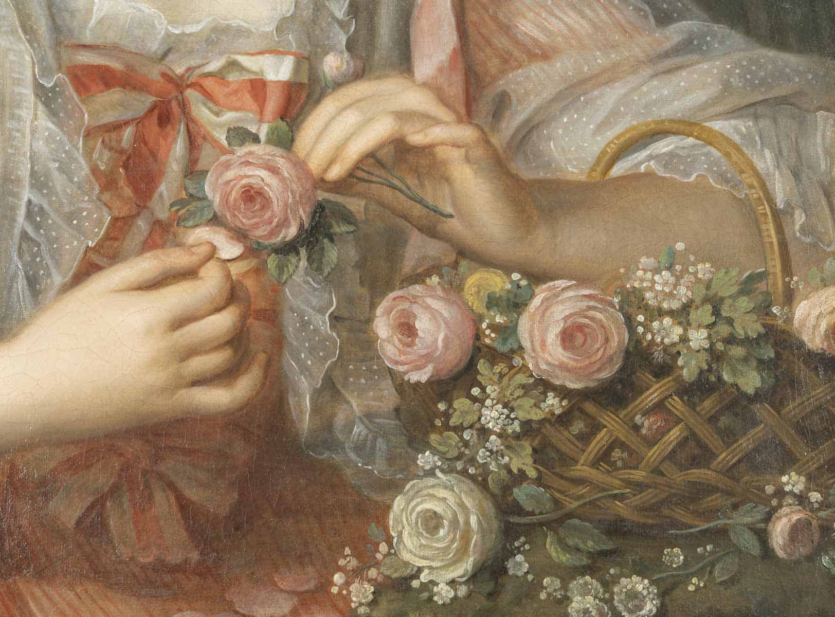 Ce très beau portrait du XVIIIème siècle attribué à Nicolas-Guy Brenet (1728-1792) nous présente une jeune dame de qualité vêtue d’une magnifique robe de mouseline rose sur un corsage en voile blanc transparent laissant deviner ses bras. Elle tient un panier de roses, entre ses mains une rose semble être destinée à quelqu’un. Le regard pensif, un léger sourire, son port de tête est d’une grande élégance. Ce portrait nous rappelle l’influence des écrits de Rousseau sur les arts au XVIIIème siècle.