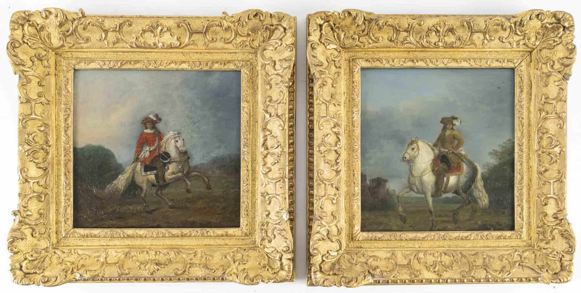 Paire de portraits de cavaliers sur leur monture. Vêtus avec élégance l’un est au galop et l’autre à l’arrêt. Les portraits équestres ont été très en vogue au XVIIème siècle, des peintres comme Van der Meulen, Parrocel et Velasquez entre autres ont représenté les Rois sur leur magnifique monture. On peut admirer celles de Joseph Parrocel au Château de Versailles et à l’Hôtel des invalides. Juste d’Egmont, peintre flamand qui séjourne en France de 1625 à 1628 et élève de Rubens a peint le portrait équestre du jeune Louis XIV partEcole Hollandaise du XVIIème siècle