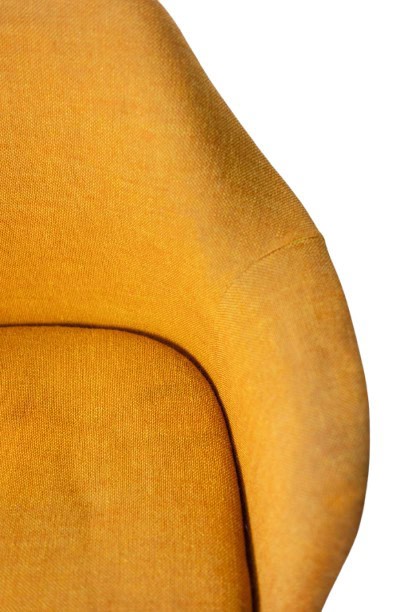 Fauteuil modèle « Tulipe », pied en aluminium laqué, assise en tissu chiné de couleur jaune safran (hauteur d’assise : 46 cm).