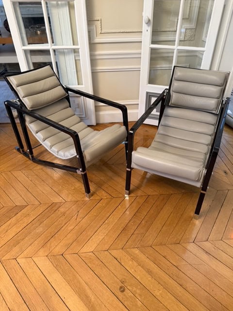 Paire de fauteuils « Transat »,modèle original créé circa 1926, en bois laqué noir à dossier inclinable et accotoirs détachés formant piètement avant à jambes de section carrée terminées par de petits sabots en métal chromé. Piètement arrière à jambes doubles reliées par une entretoise. Dossier et assise gainés de cuir gris matelassé .