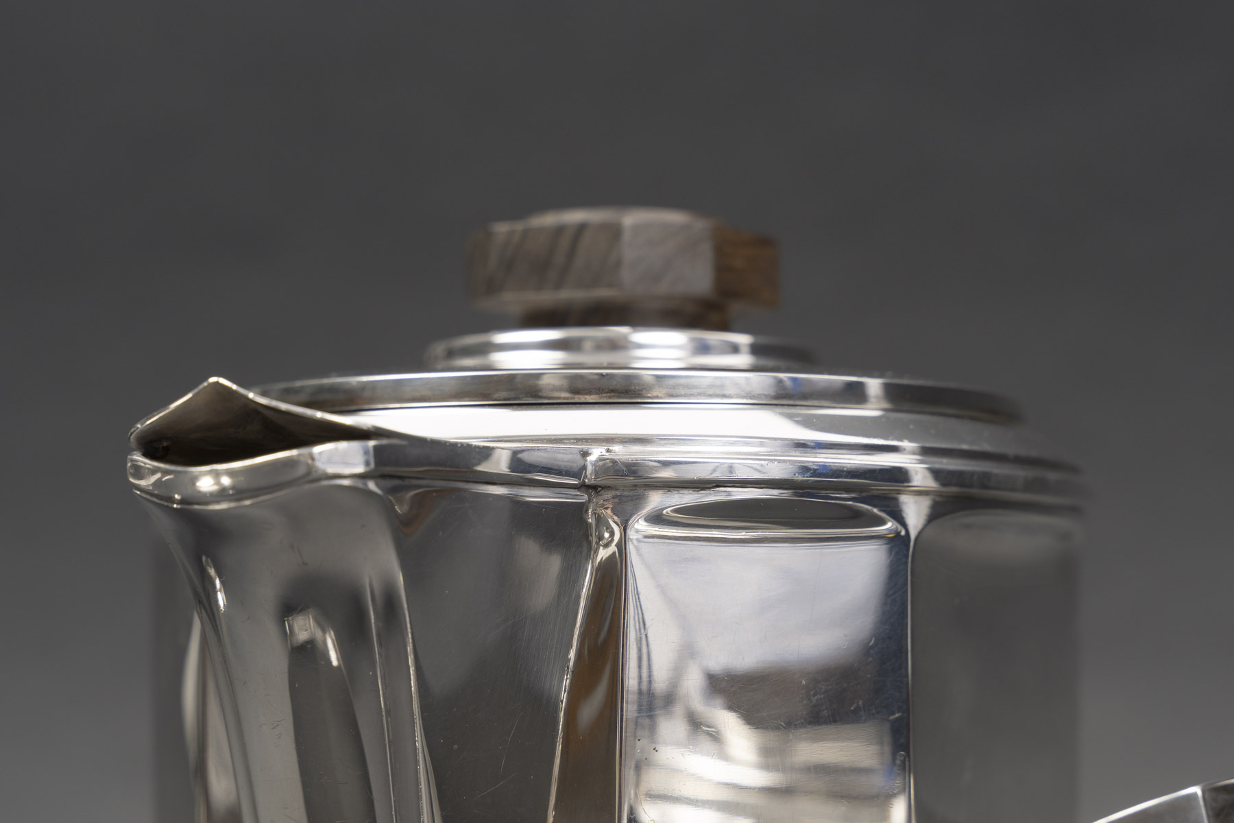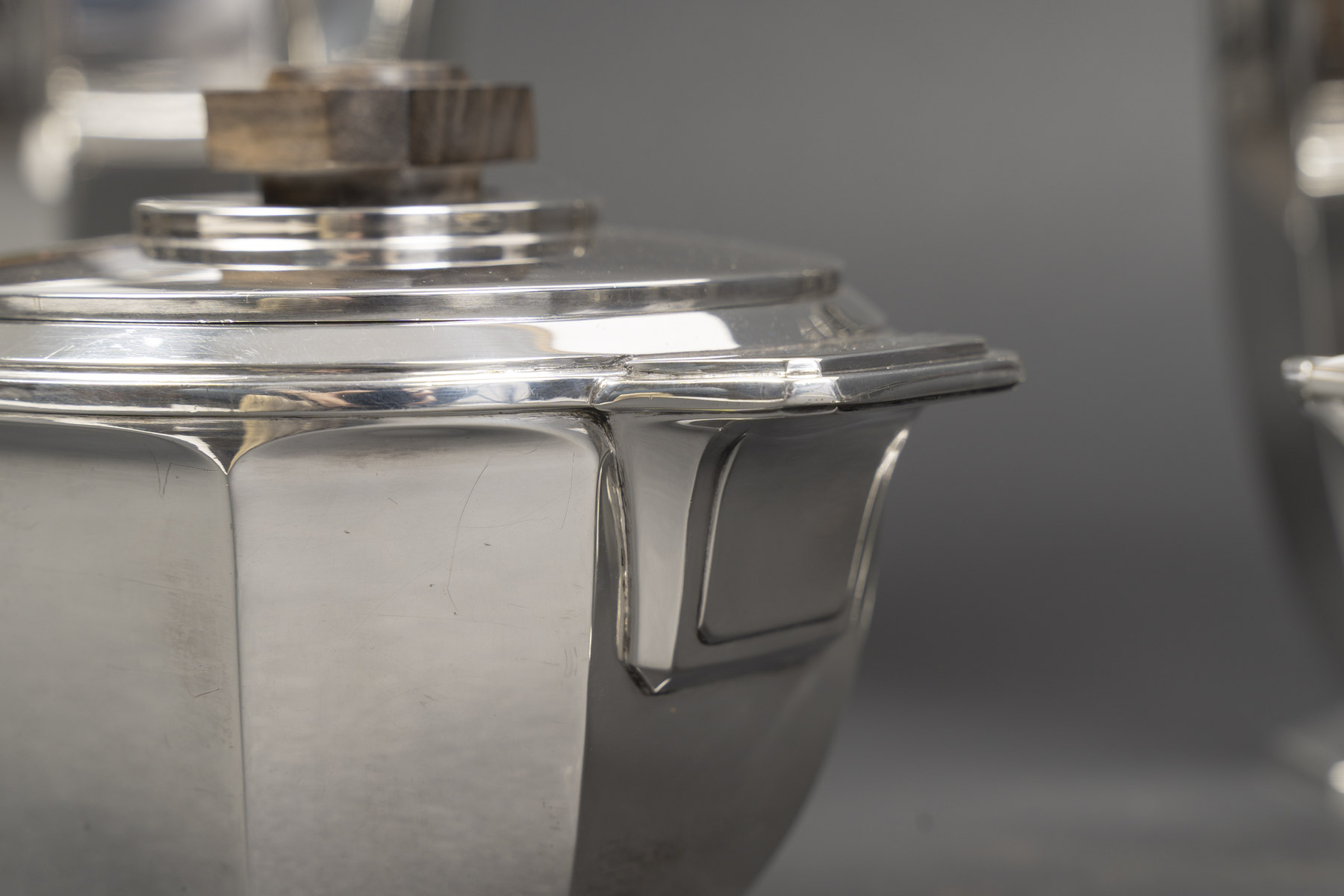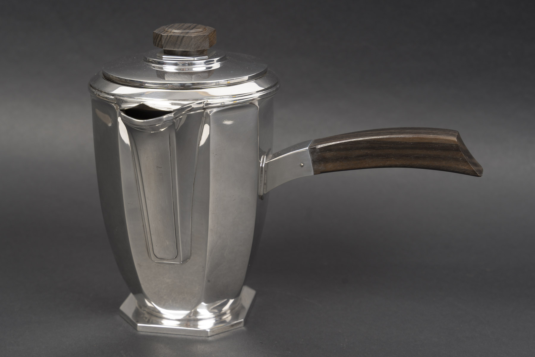 Service complet à thé, café et chocolat en argent massif de forme hexagonale à pans coupés, typique du style Art Déco. Chaque pièce repose sur une base à gradins et présente un couvercle à doucine surmonté d’un bouton en bois assorti aux anses anguleuses. Intérieur du pot à lait et du sucrier vermeillé.
