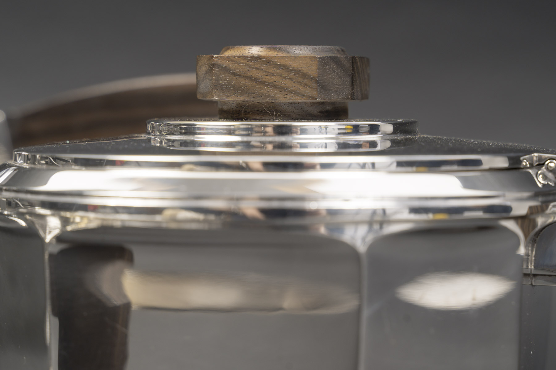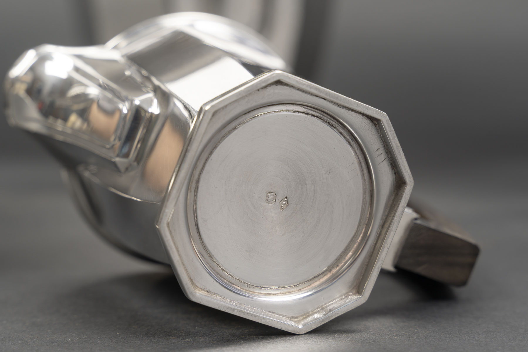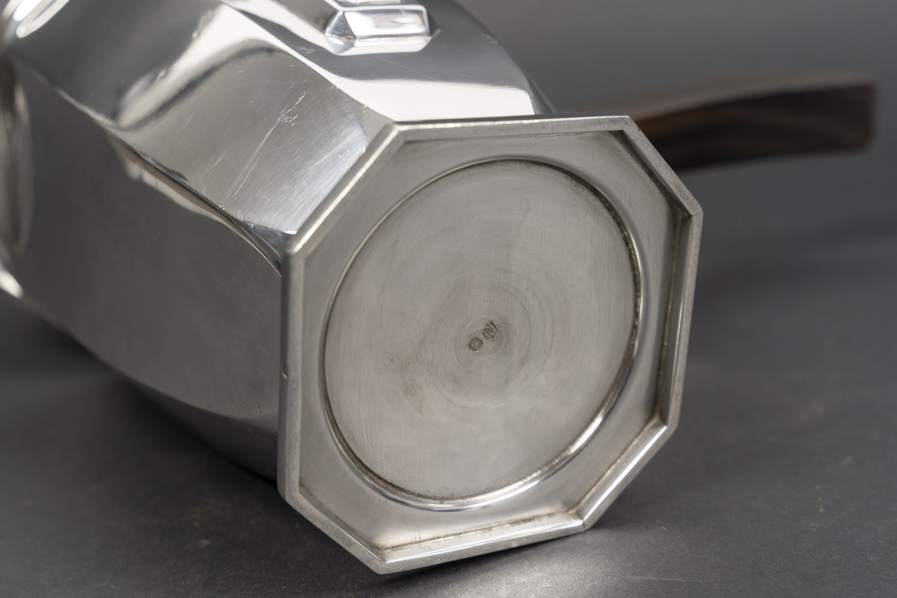 Service complet à thé, café et chocolat en argent massif de forme hexagonale à pans coupés, typique du style Art Déco. Chaque pièce repose sur une base à gradins et présente un couvercle à doucine surmonté d’un bouton en bois assorti aux anses anguleuses. Intérieur du pot à lait et du sucrier vermeillé.