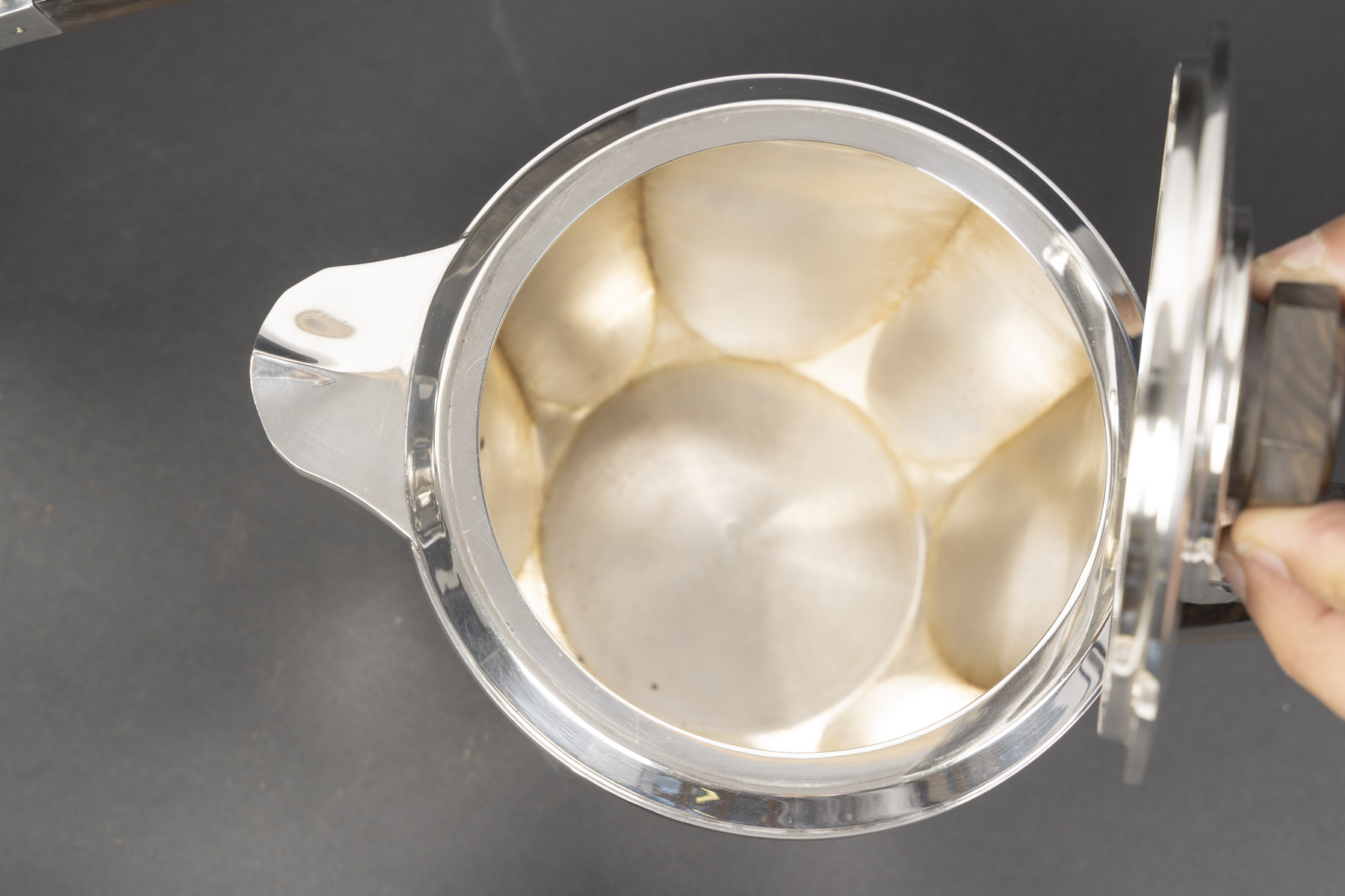 La rigueur géométrique, la pureté des volumes et le contraste entre l’argent poli et le bois sombre illustrent parfaitement le goût Art Déco français des années 1930. Le travail d’Ernest Prost, orfèvre actif à Paris, se distingue par la qualité d’exécution et la sobriété élégante des formes, adaptées à la modernité de l’époque.