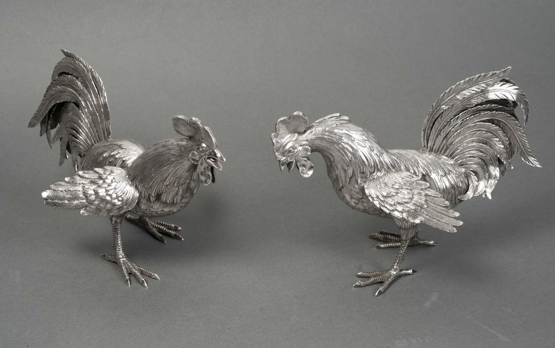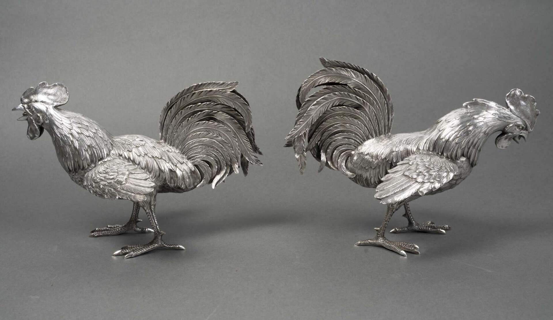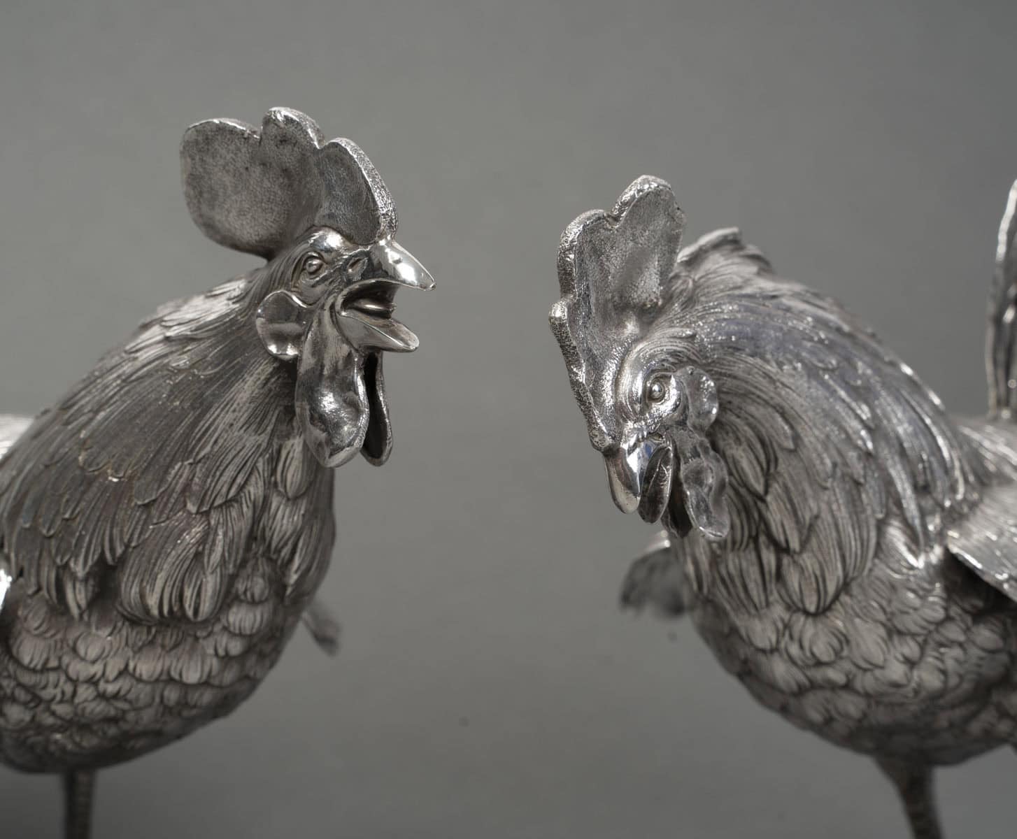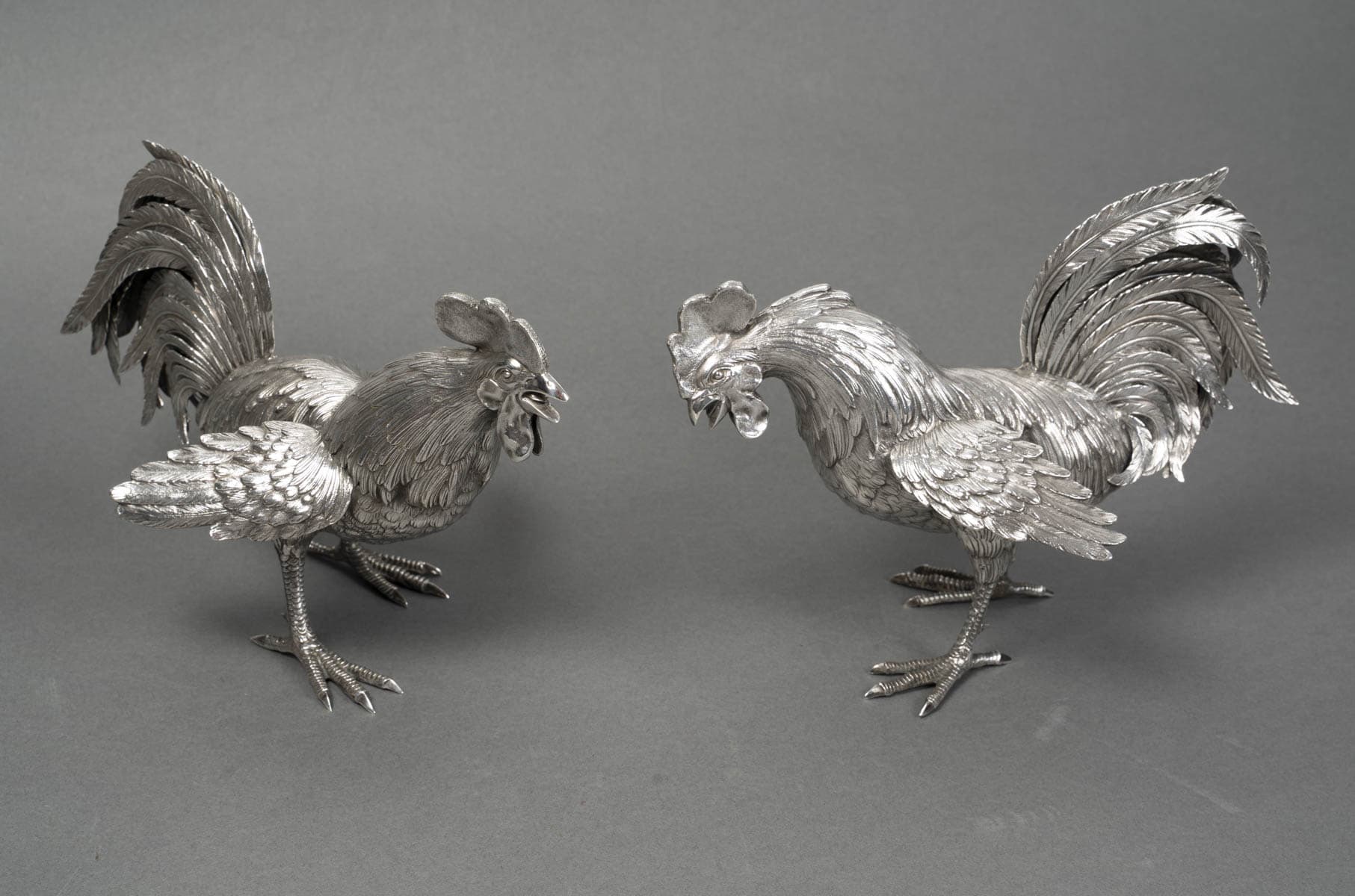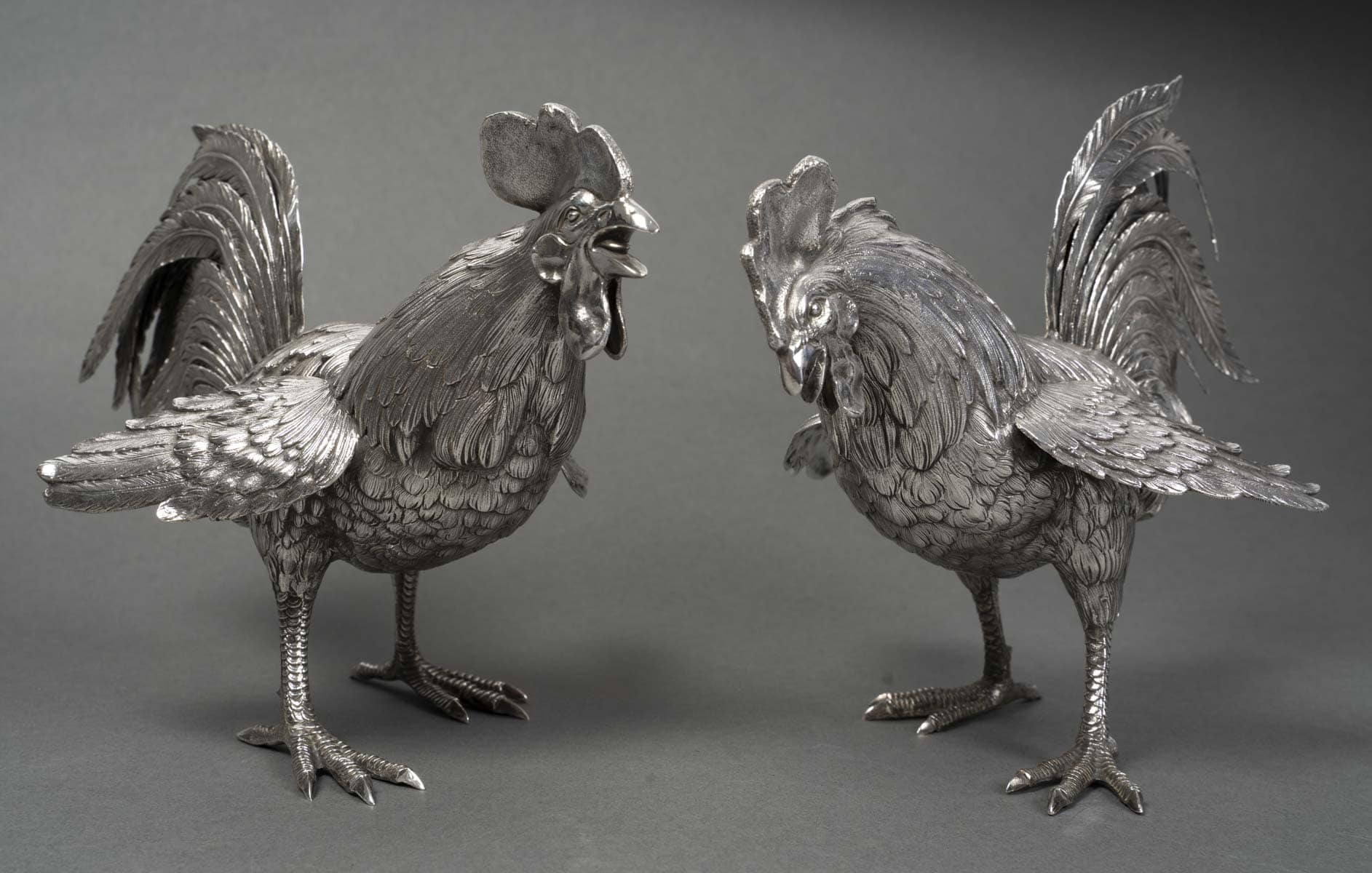 ESCHWEGE Paire de coqs combattant, argent massif circa 1950