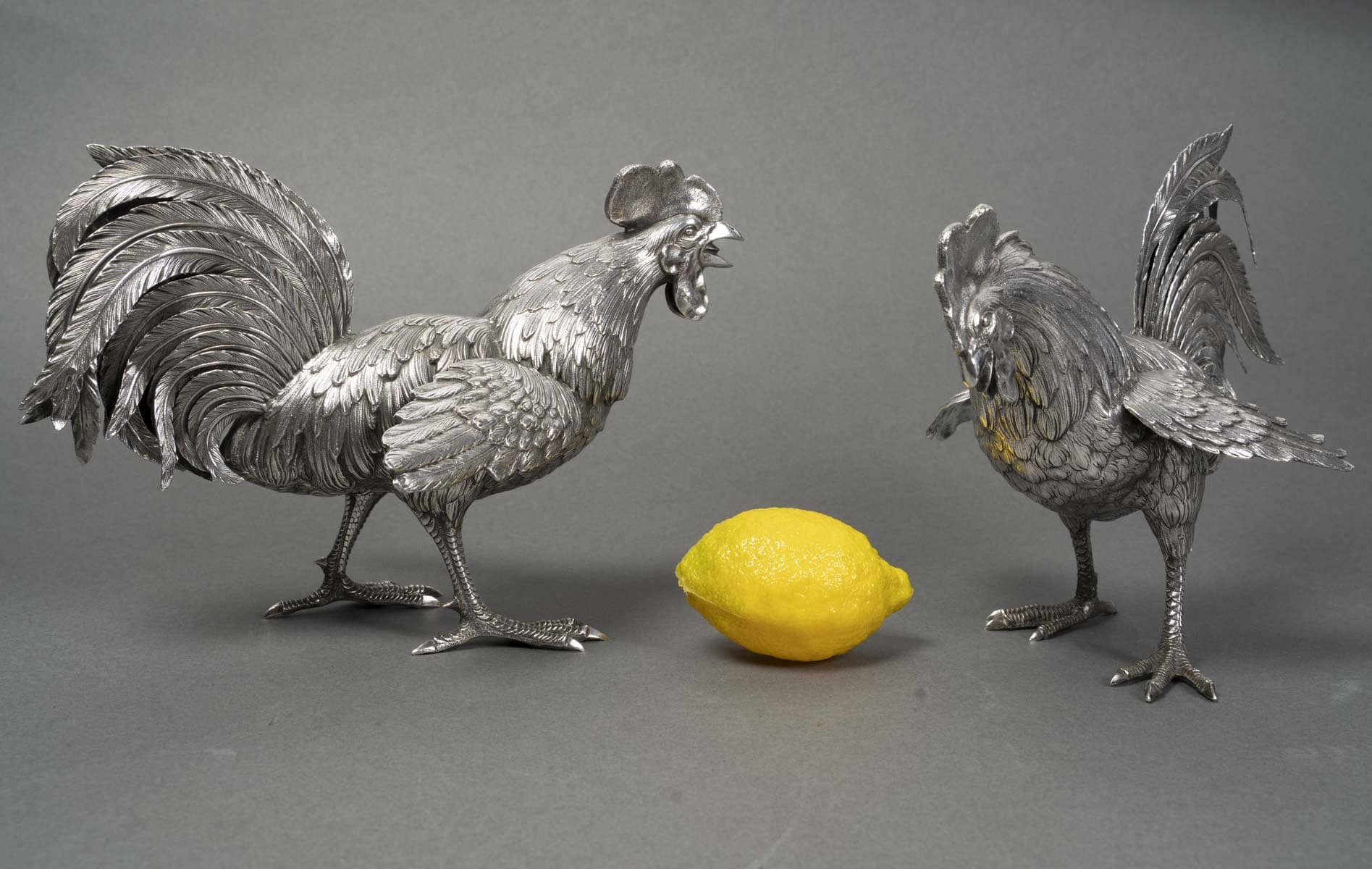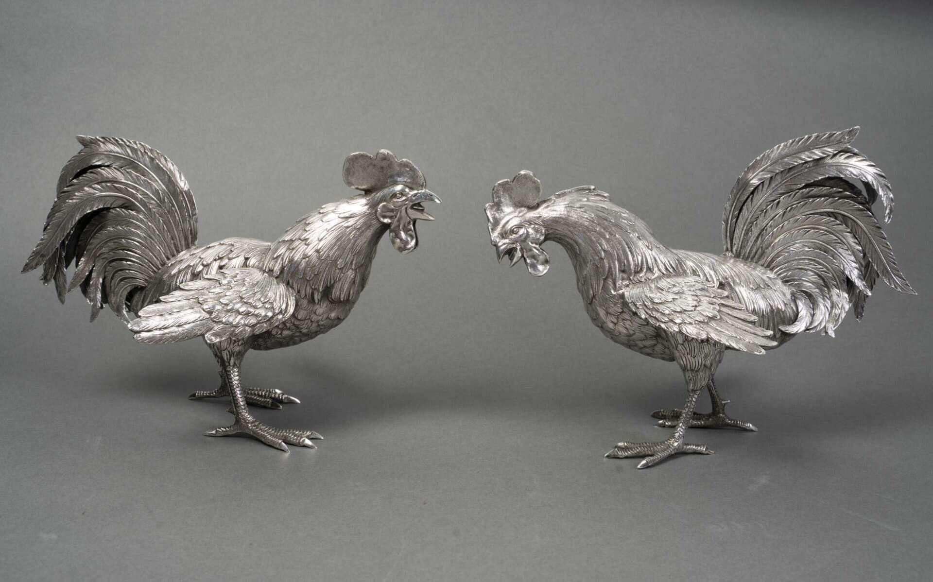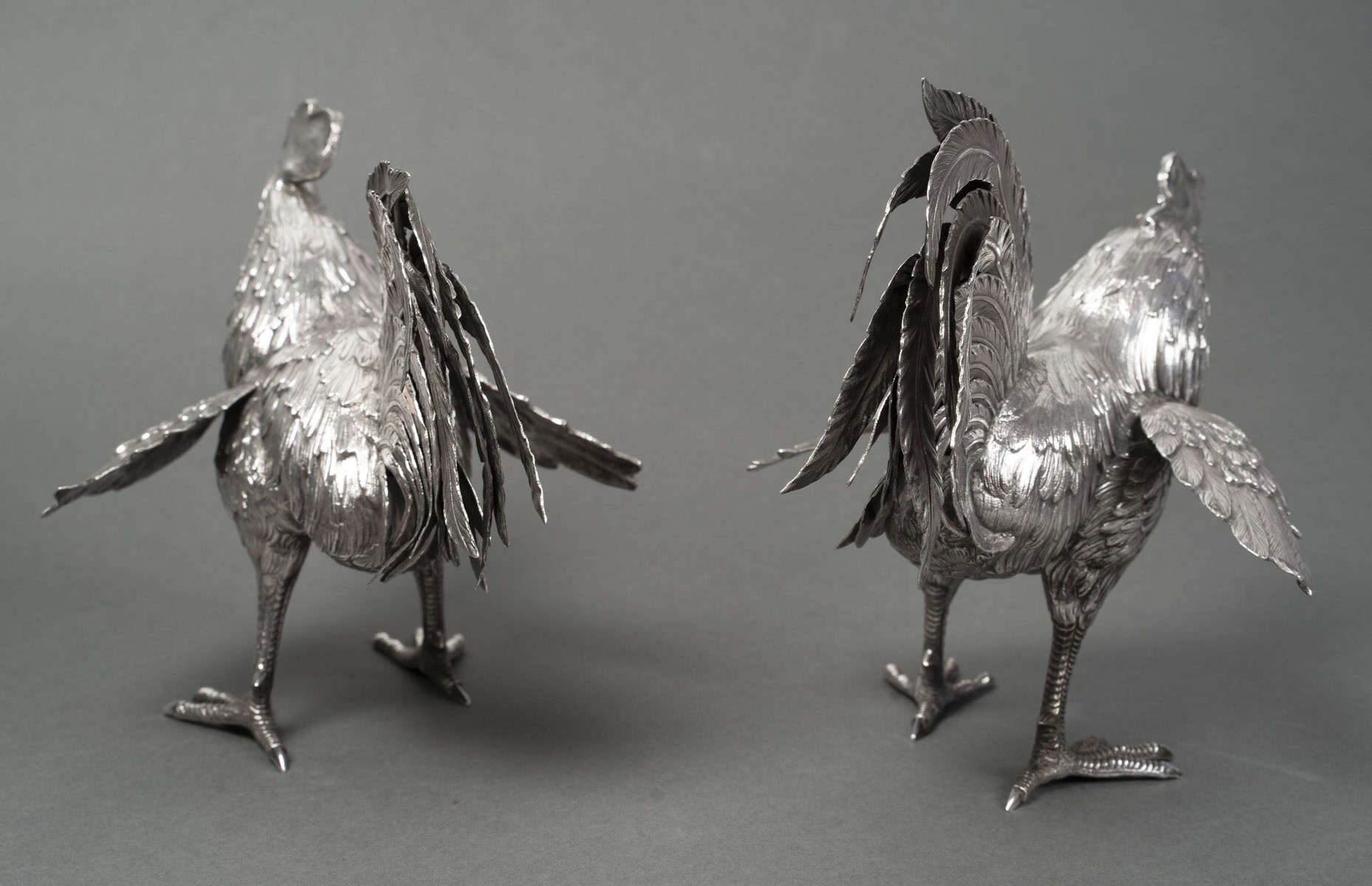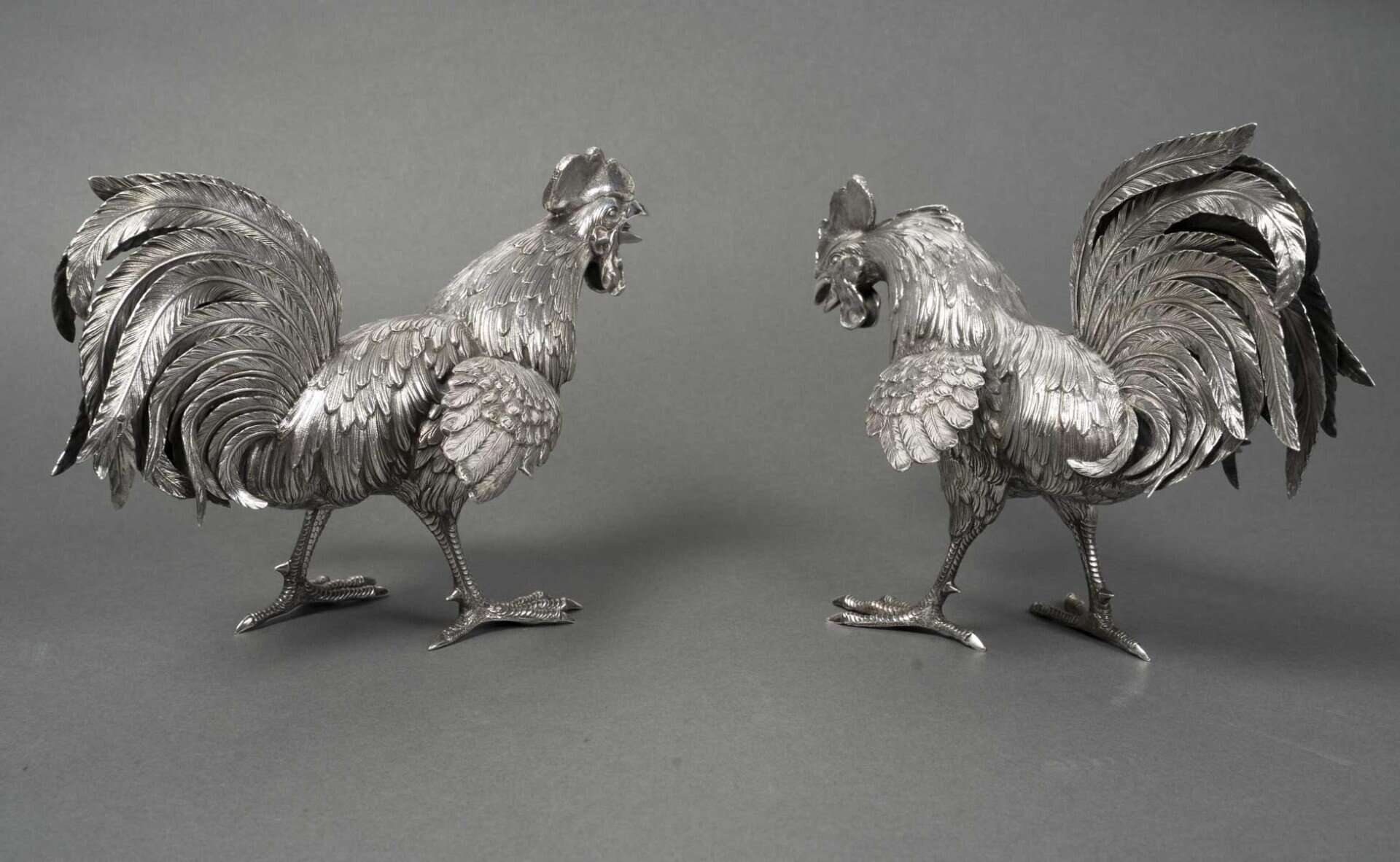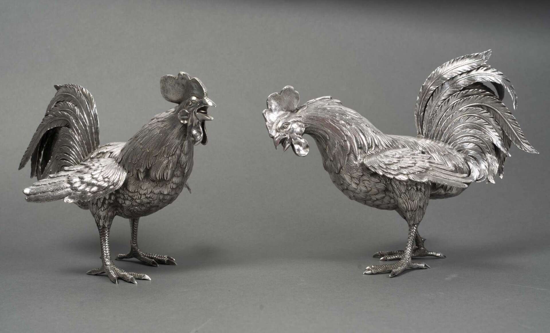 ESCHWEGE Paire de coqs combattant, argent massif circa 1950