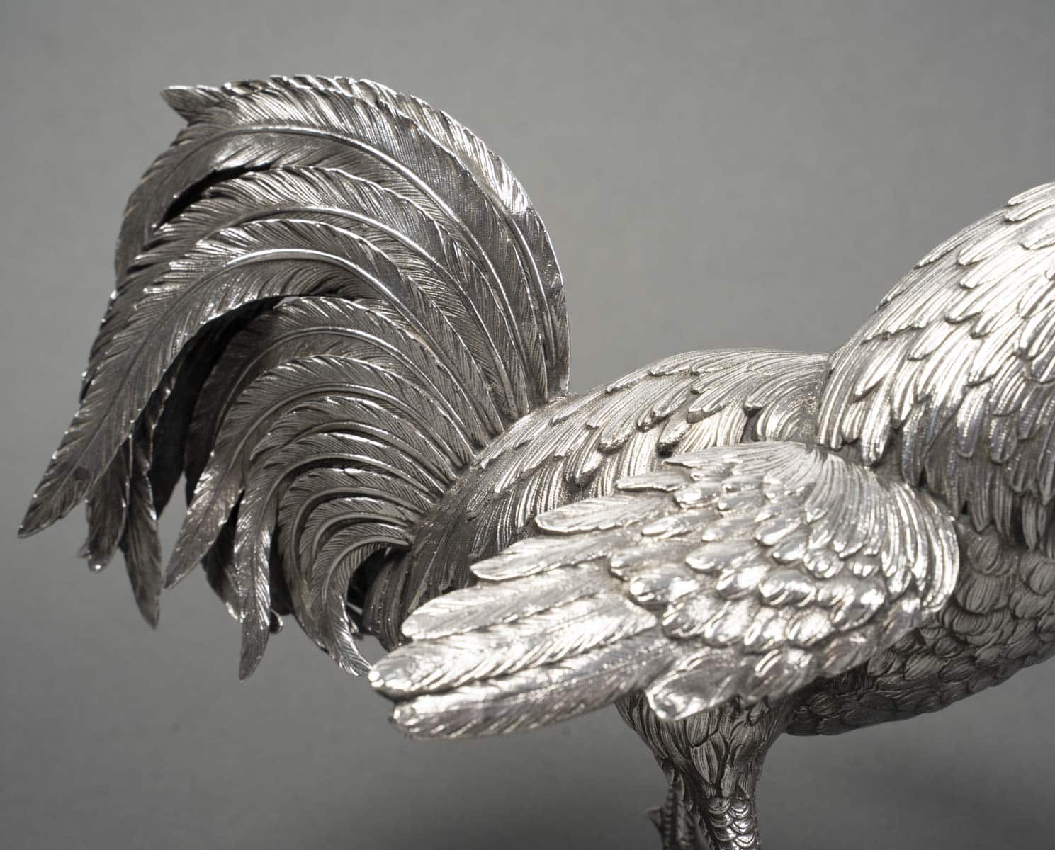 Chaque coq, au plumage finement ciselé, est représenté en pleine attaque aux ailes déployées, le corps en torsion . Cette paire de coq se distingue par la tension du mouvement et la précision du modelé. Les surfaces alternent poli et ciselé pour mieux souligner la lumière sur le plumage.