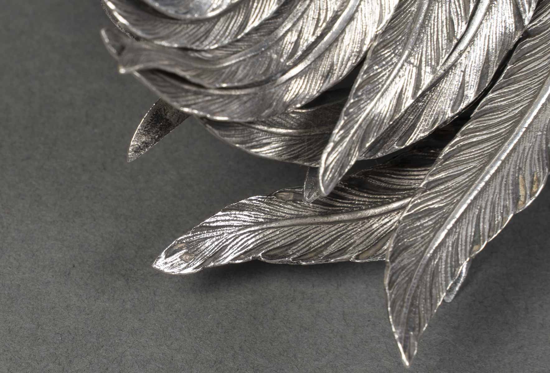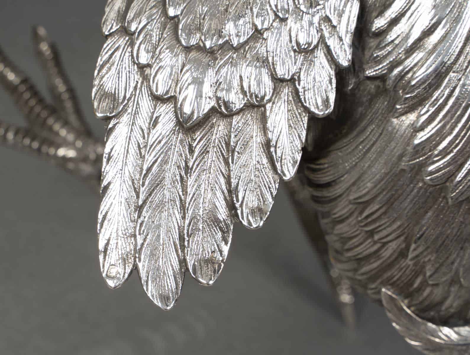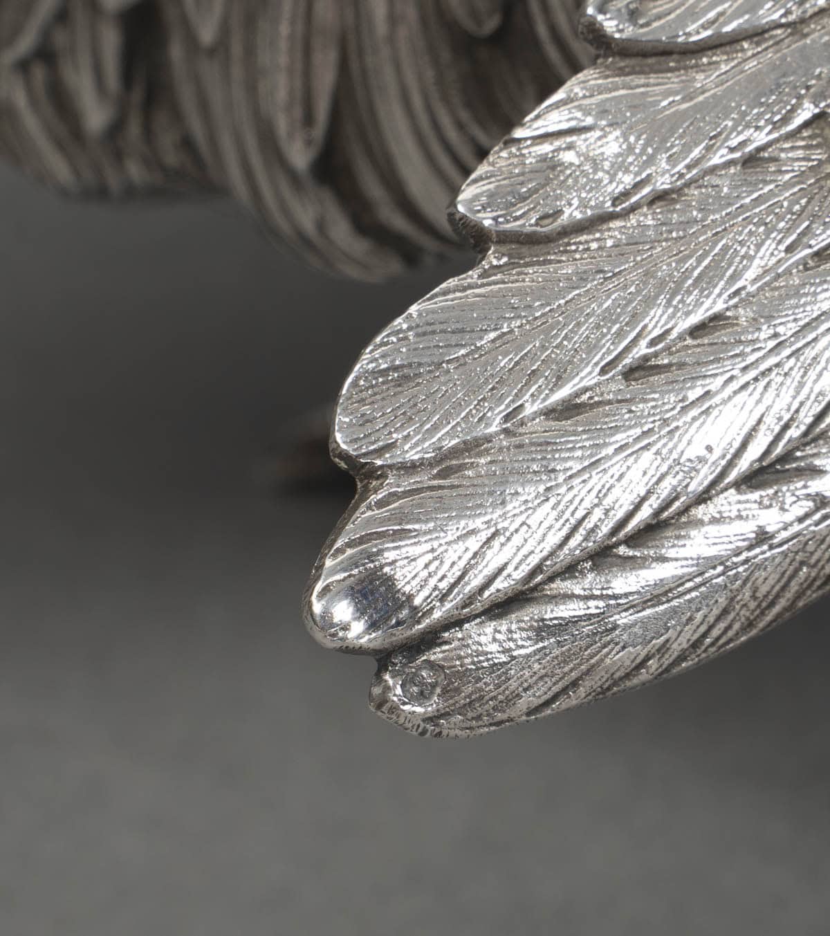 Travail d’une grande virtuosité, typique de la Maison Eschwege, orfèvrerie parisienne réputée de l’après-guerre pour ses sculptures animalières au naturalisme expressif. Ces sculptures étaient destinées au décor de la table lors des grands diners de chasse.