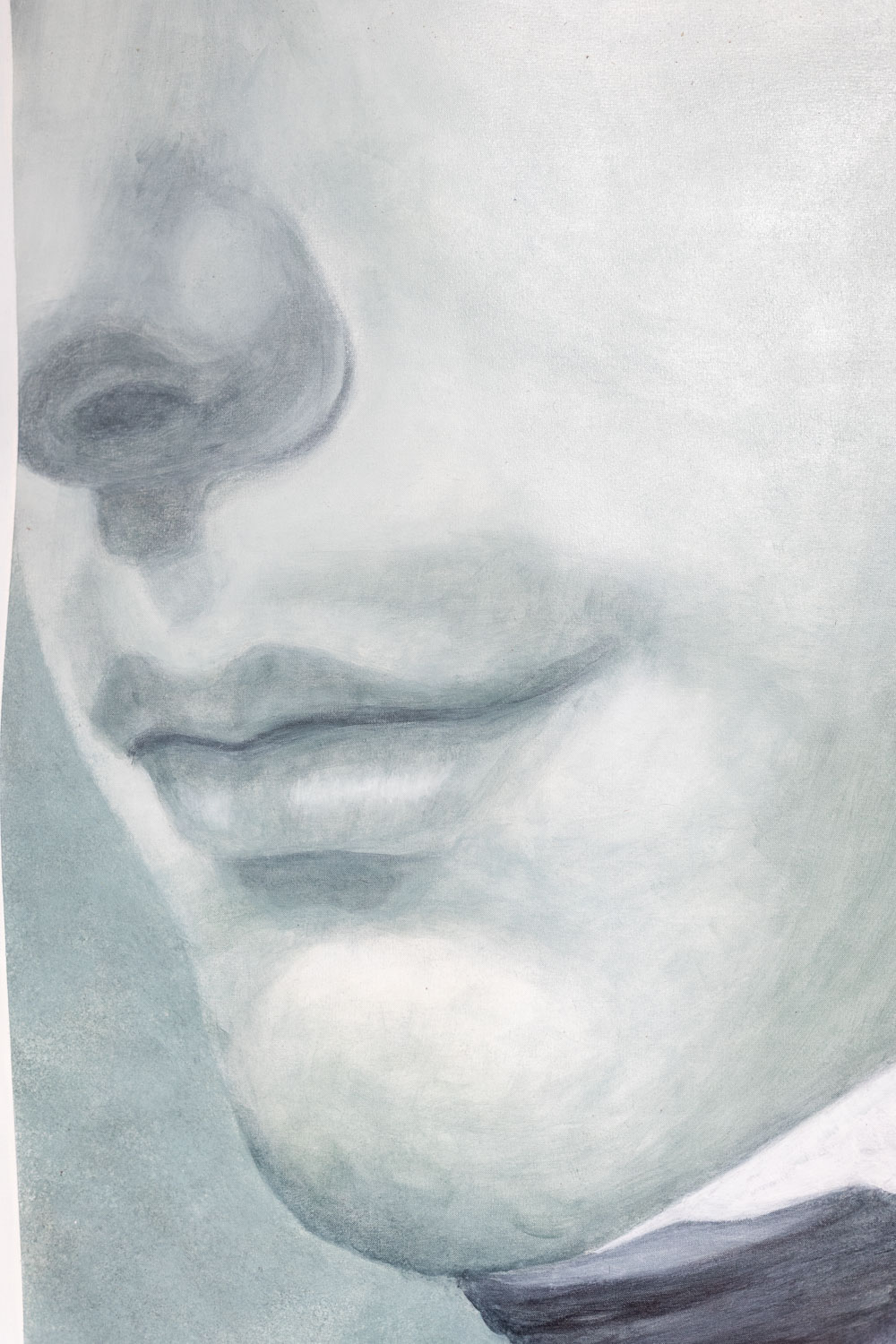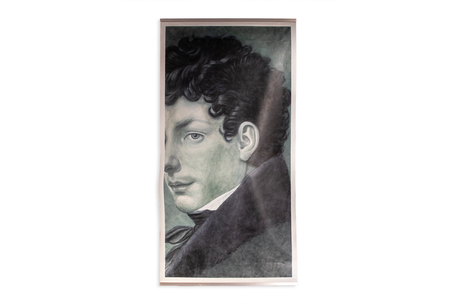Monumental détail d’un portrait de jeune homme d’après un tableau de Girodet. Peint à la main sur toile et signé en bas à droite.