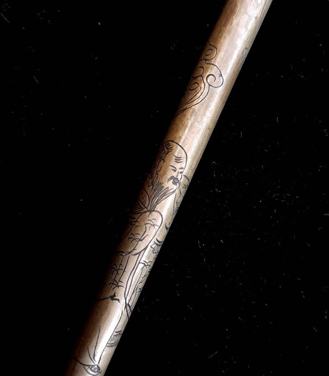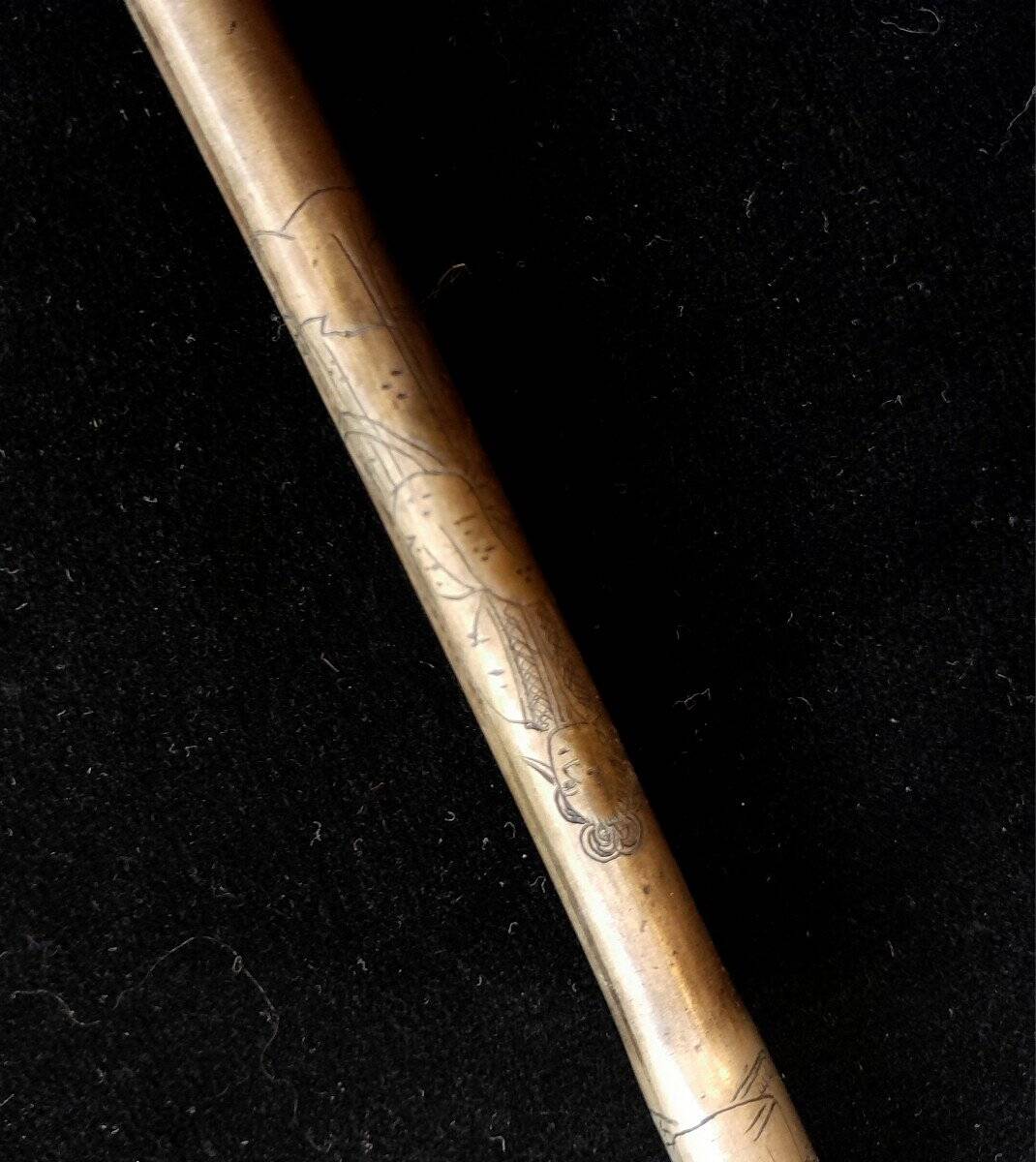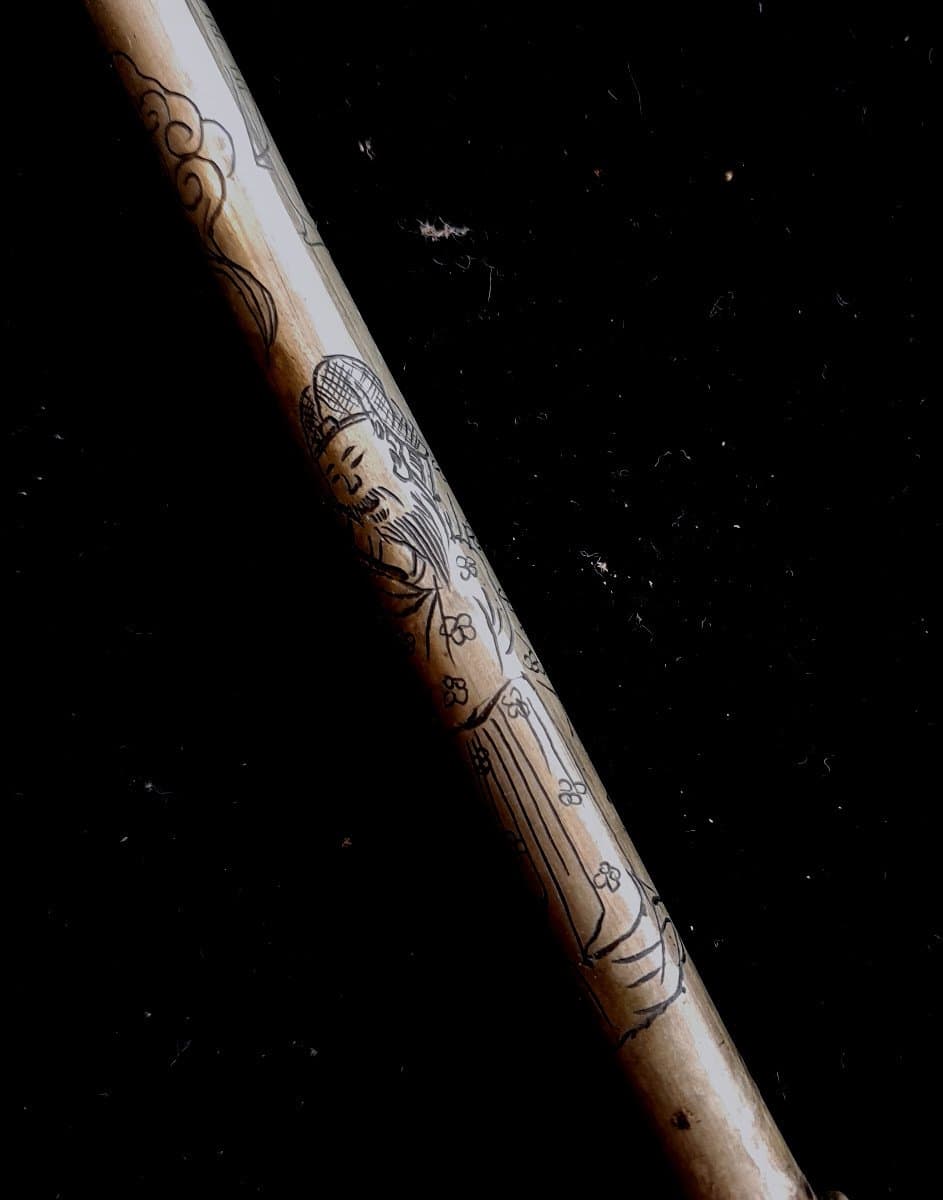 Pipe à opium. Très fine et élégante, ciselée de motifs de personnages femmes, hommes, et volutes de fumée. Fourneau en bambou.