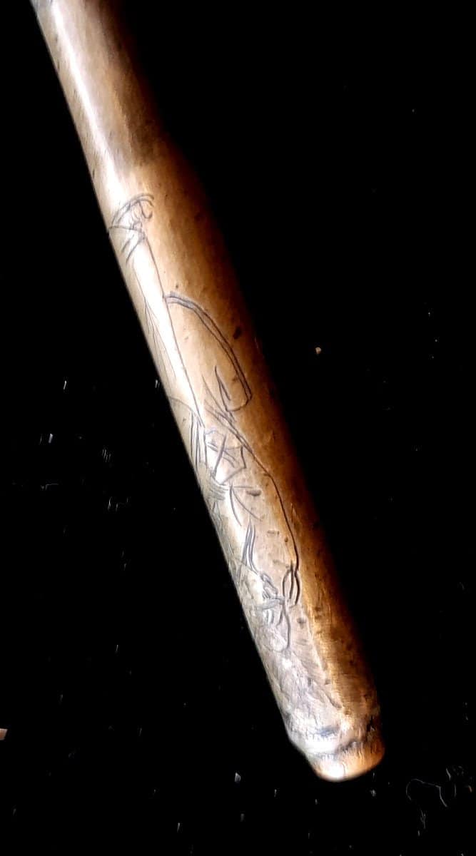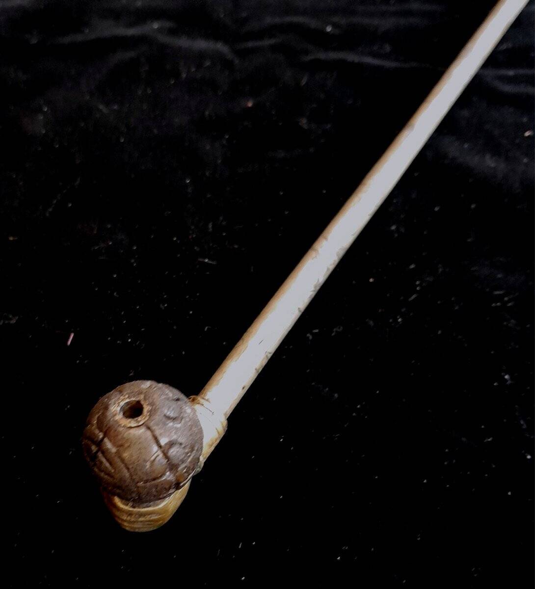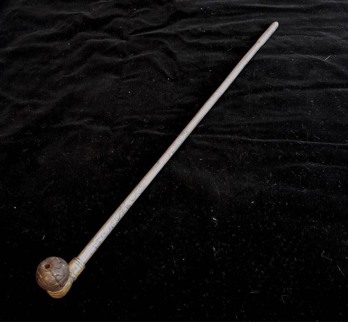 Pipe à opium. Très fine et élégante, ciselée de motifs de personnages femmes, hommes, et volutes de fumée. Fourneau en bambou.