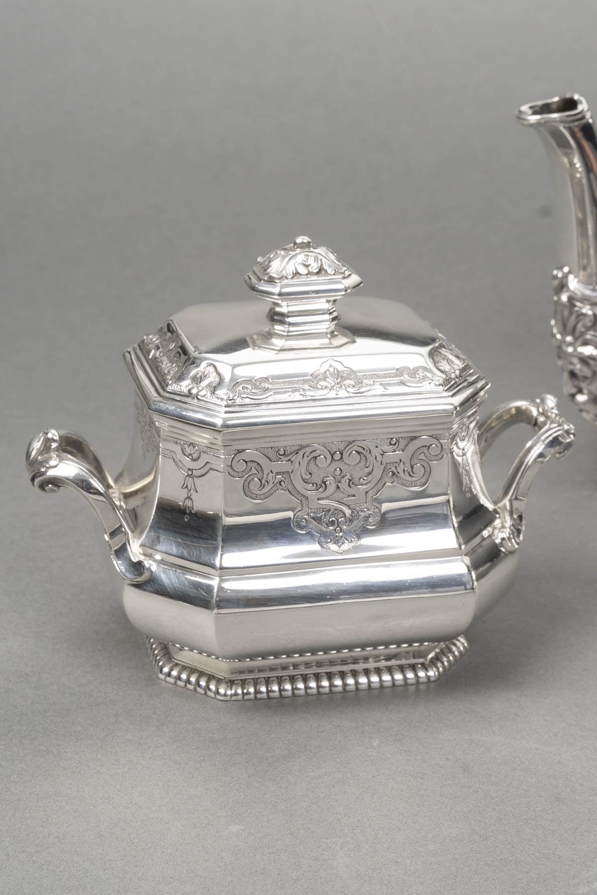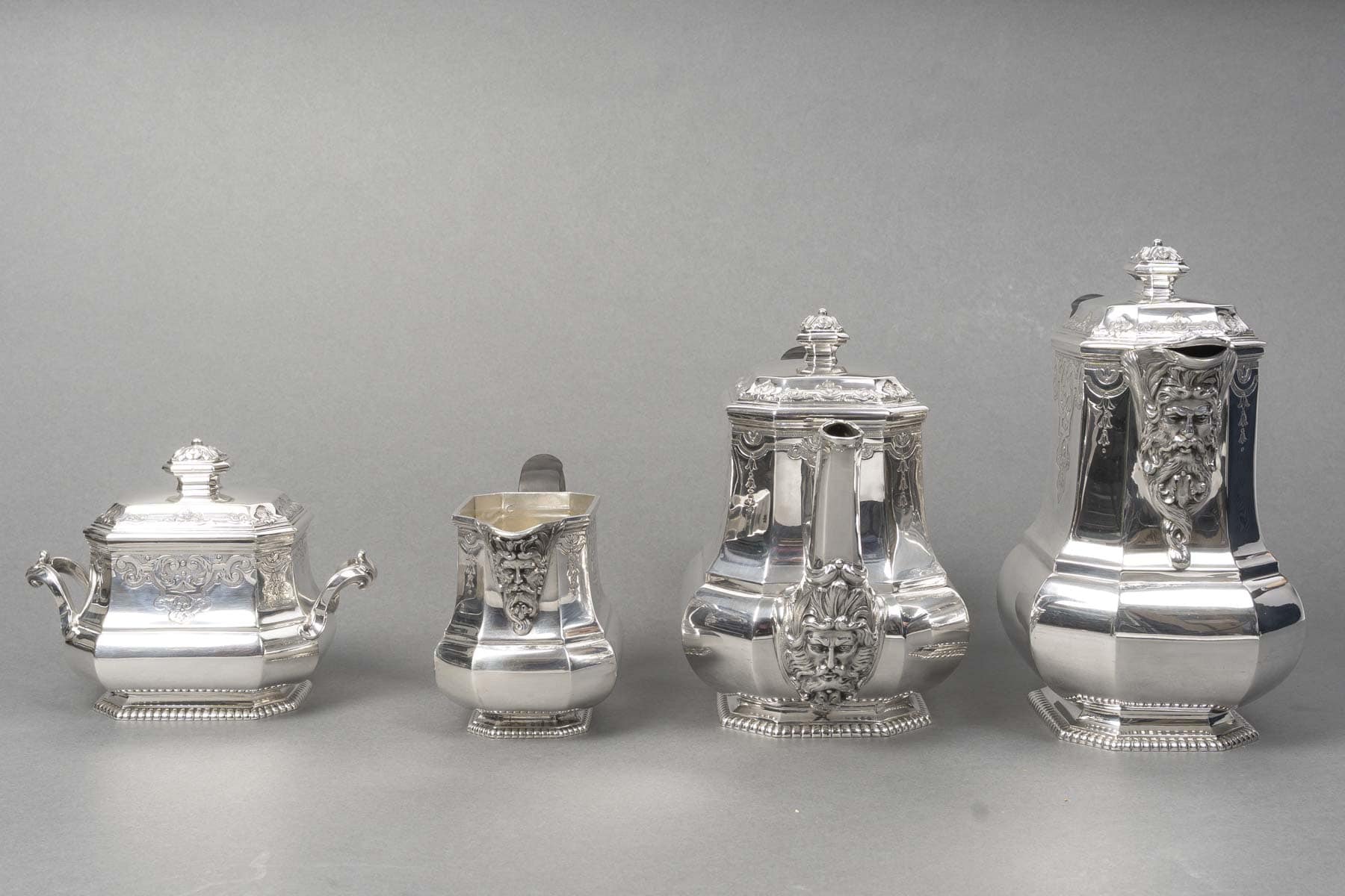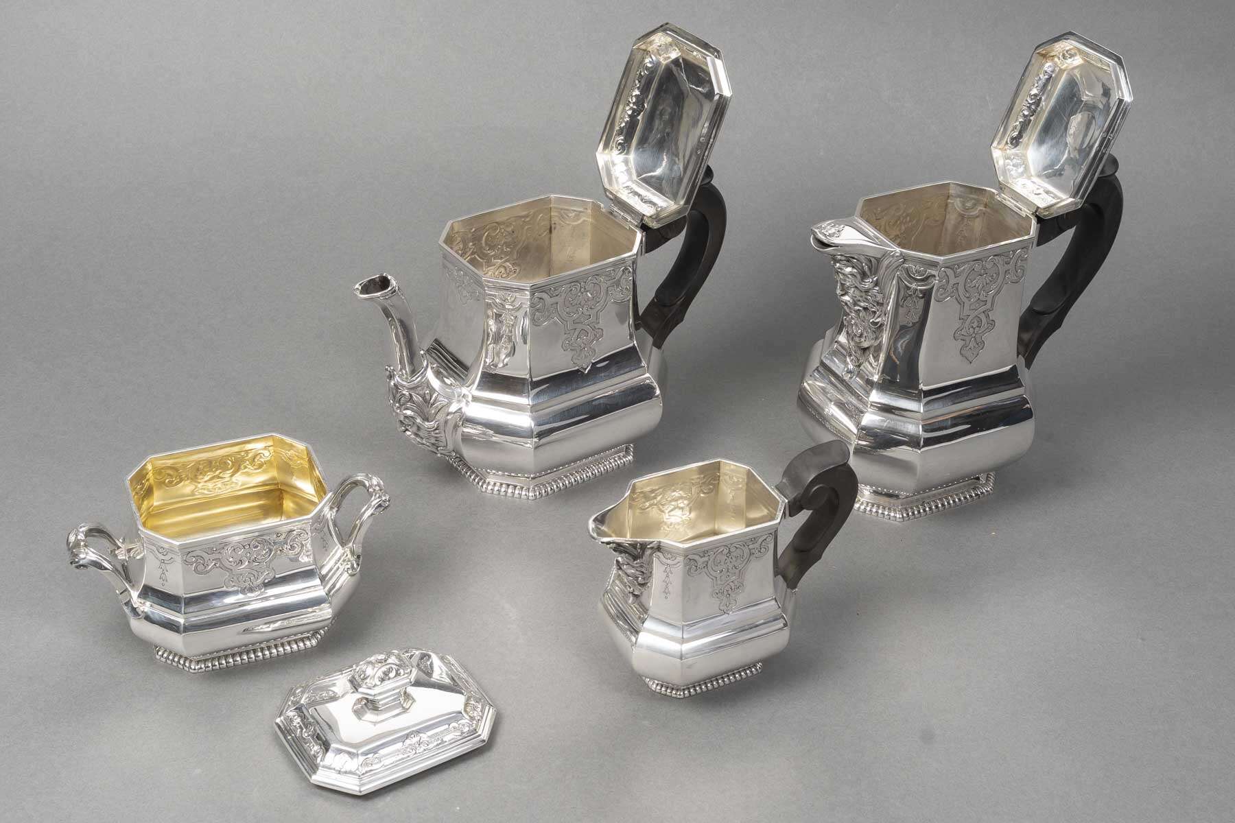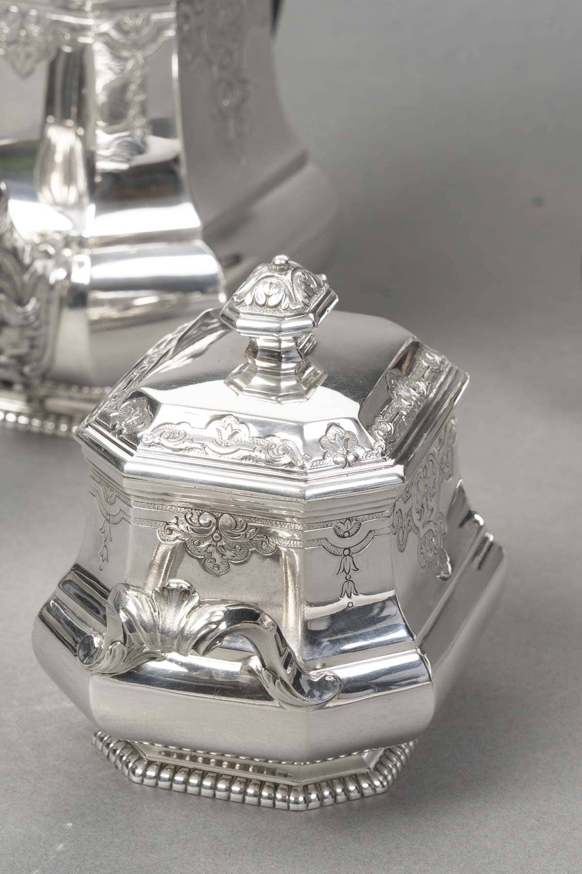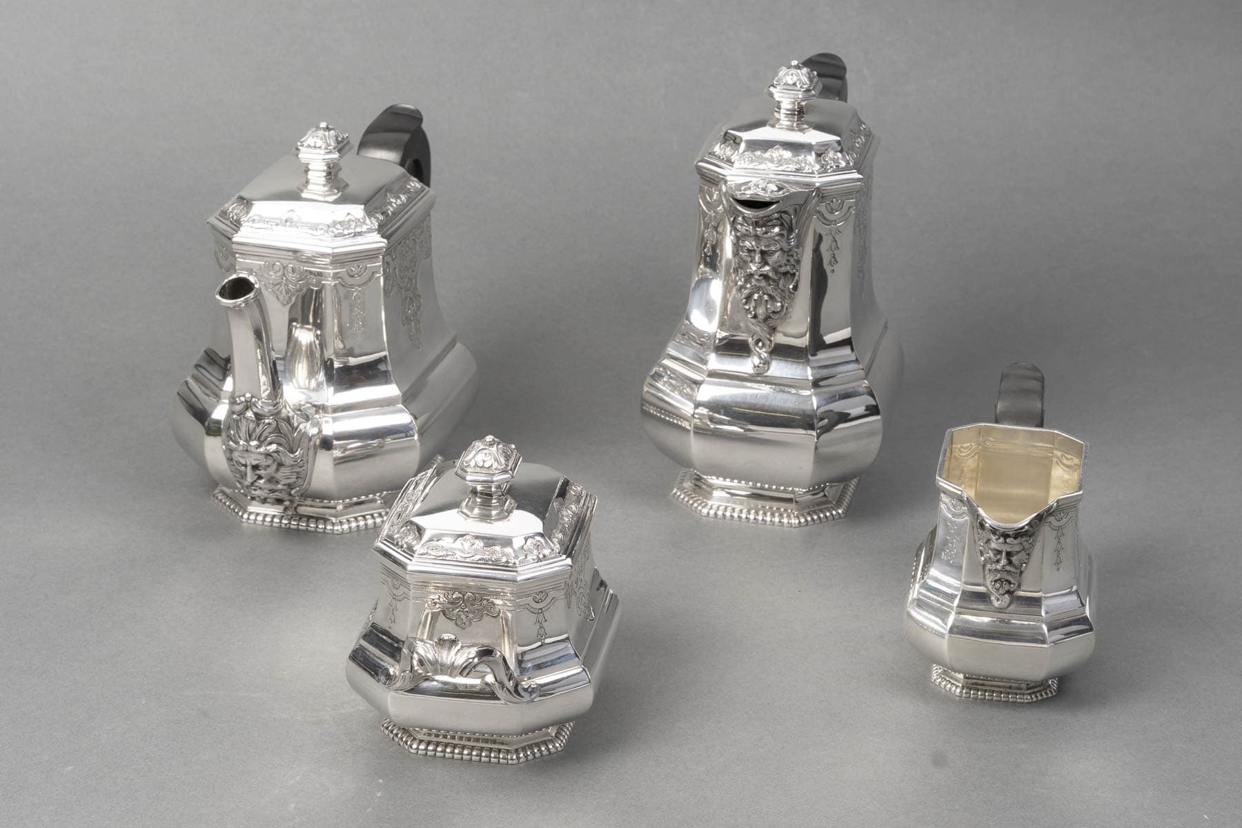 Raffiné service à thé et café en argent massif composé d’une théière, d’une cafetière, d’un sucrier couvert et d’un pot à lait. Chaque pièce présente une forme balustre octogonale à pans coupés, soulignée par un piédouche à frise de perles.