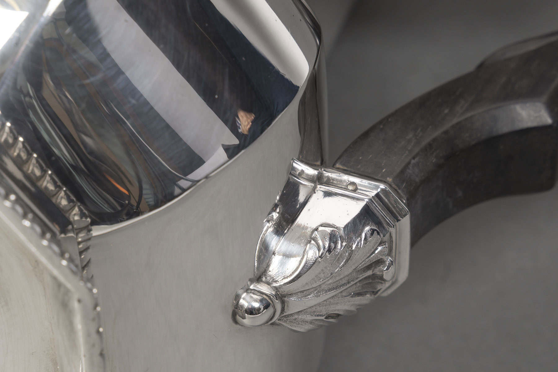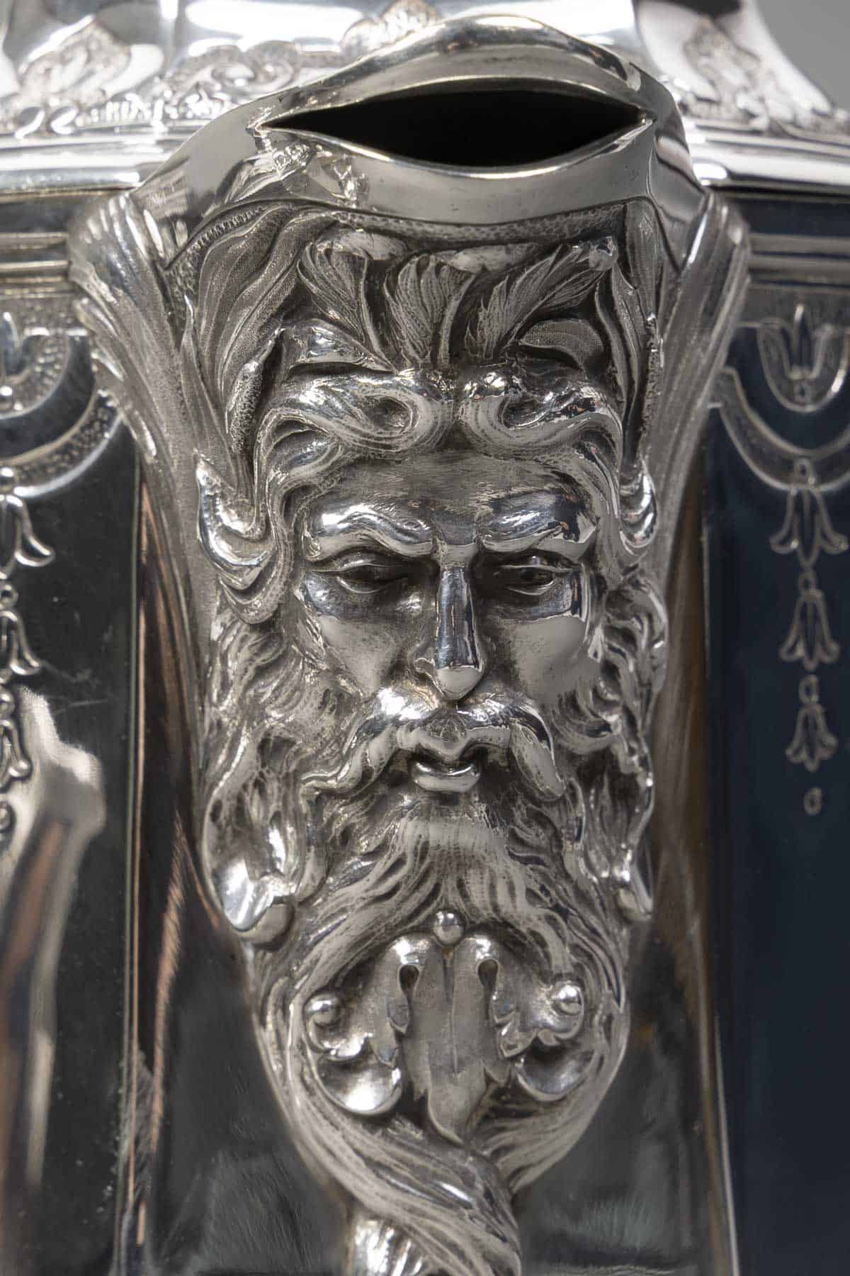 Les becs verseurs sont moulurés de mascarons et d’enroulements feuillagés, tandis que les anses en bois noirci (probablement ébène) contrastent élégamment avec l’éclat du métal. Les couvercles, à charnières, sont sommés de prises en forme de boutons stylisés.