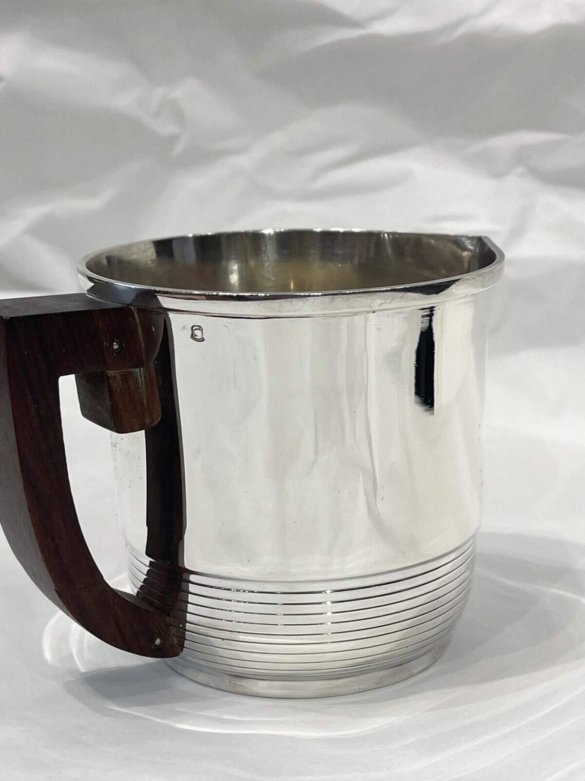 Service en argent massif, composé d’une Théière, d’une cafetière, et d’un sucrier couvert intérieur en vermeil et d’un crémier de forme cylindrique à décor fileté, couvercle à charnière pour les pots à thé et café. Les anses et prises sont en palissandre.
