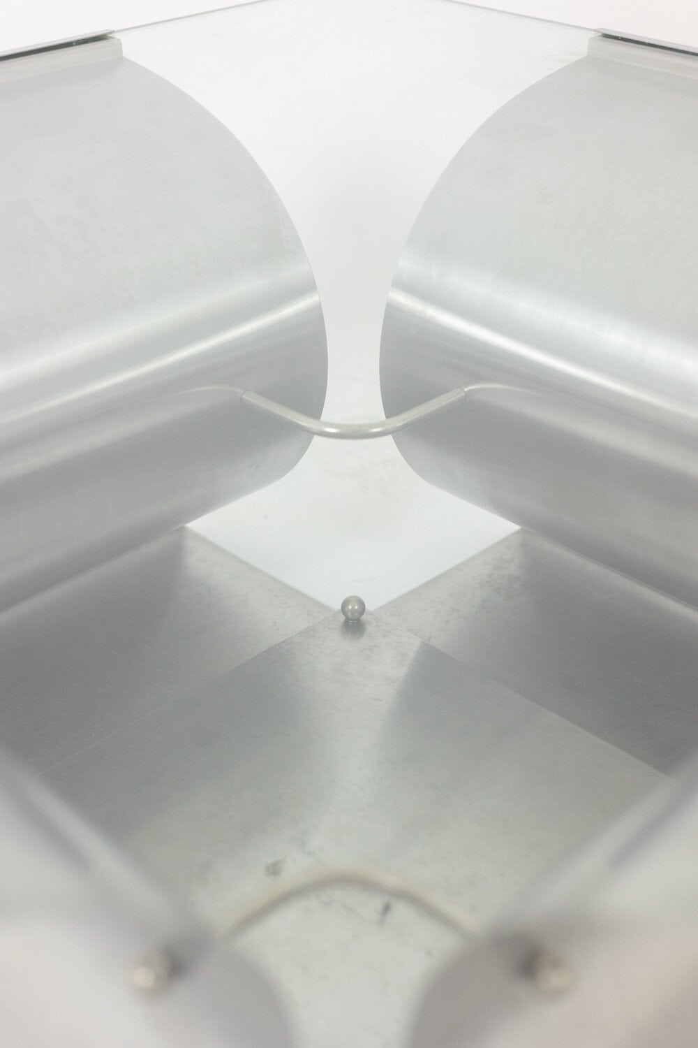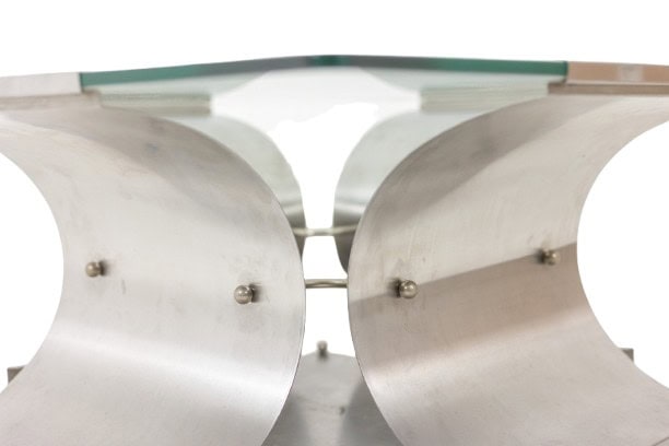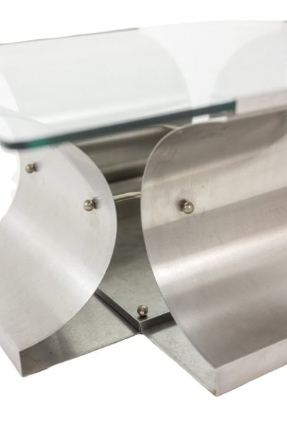 Table basse sculpturale, de forme carrée, en acier brossé et plateau de verre.