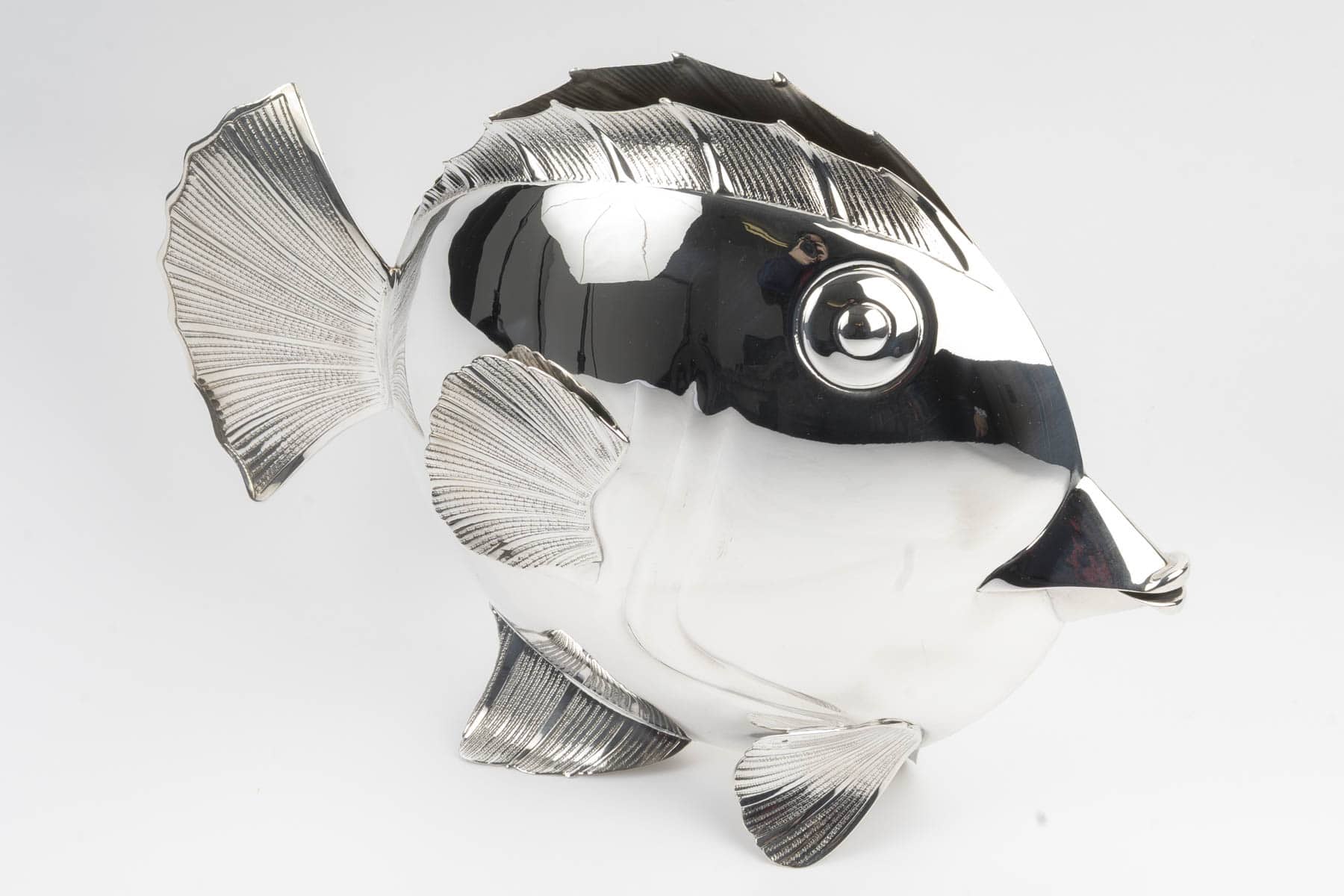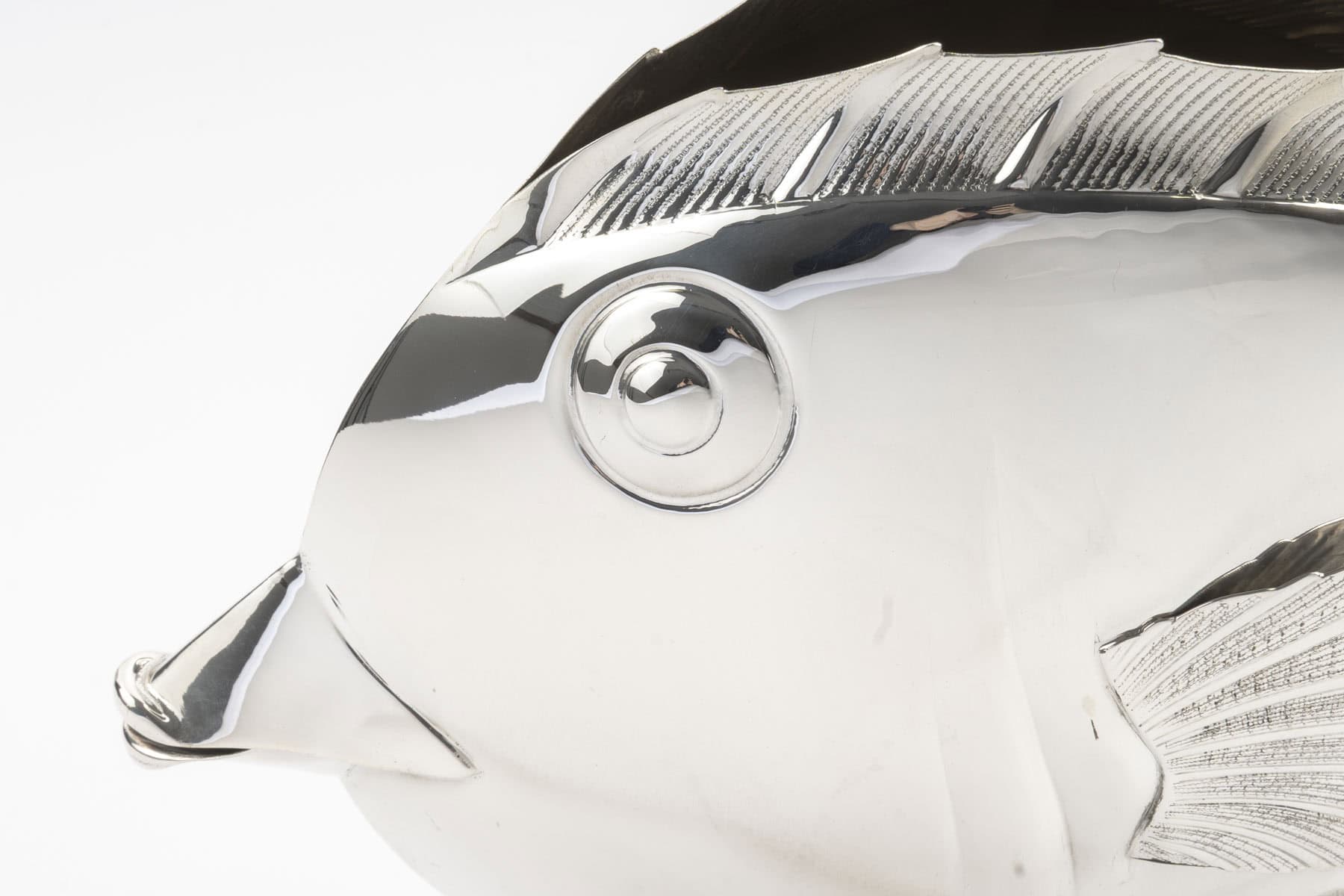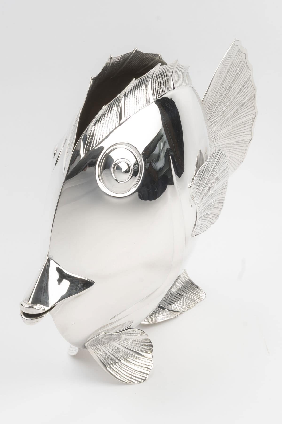 Élégant vase zoomorphe figurant un poisson stylisé. Le corps sphérique en argent poli miroir est rythmé par des nageoires, et une queue, finement ciselées à effet nervuré, apportant contraste et mouvement à la surface. L’œil, en léger relief, accentue l’aspect sculptural et humoristique de l’ensemble.