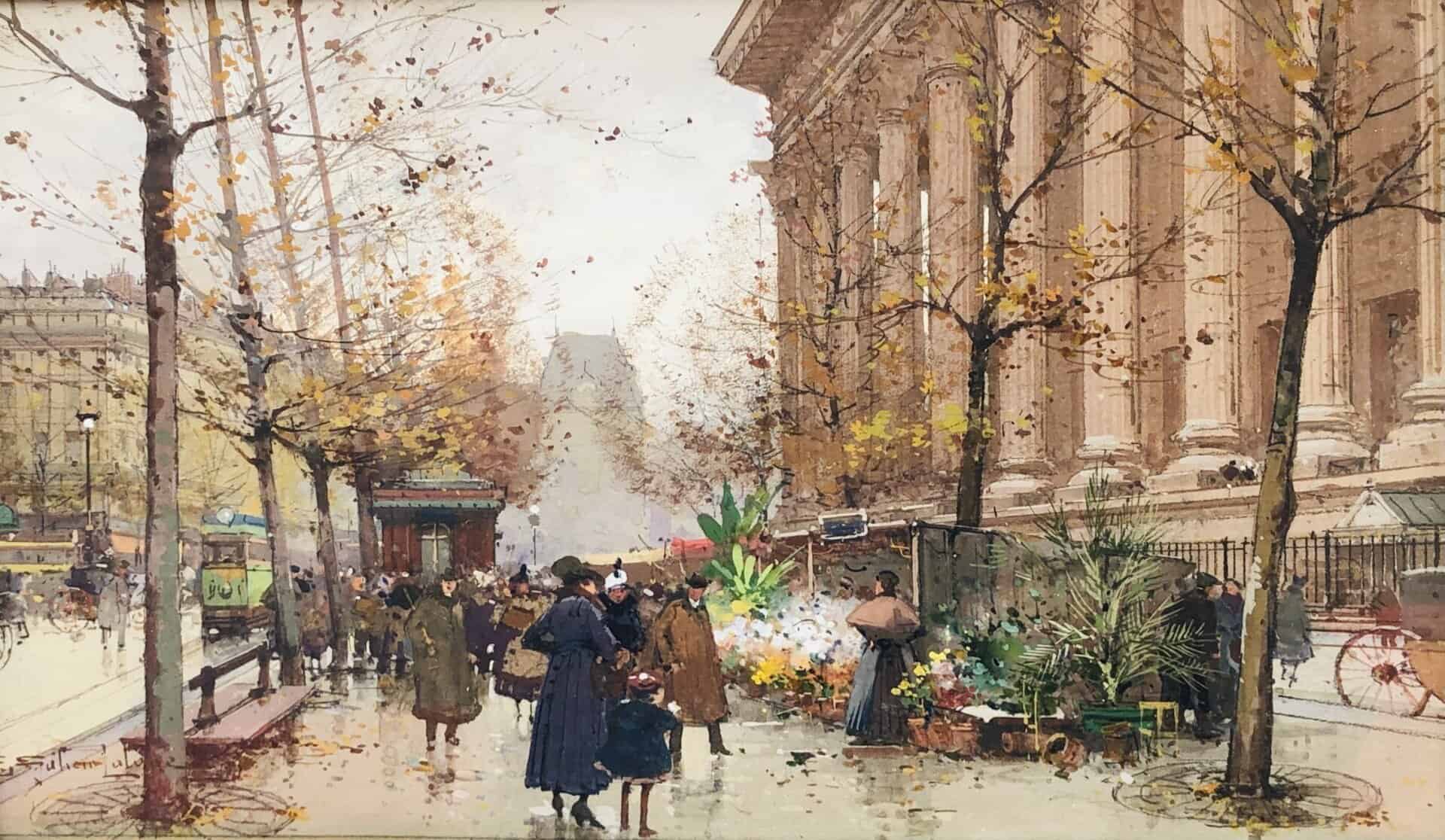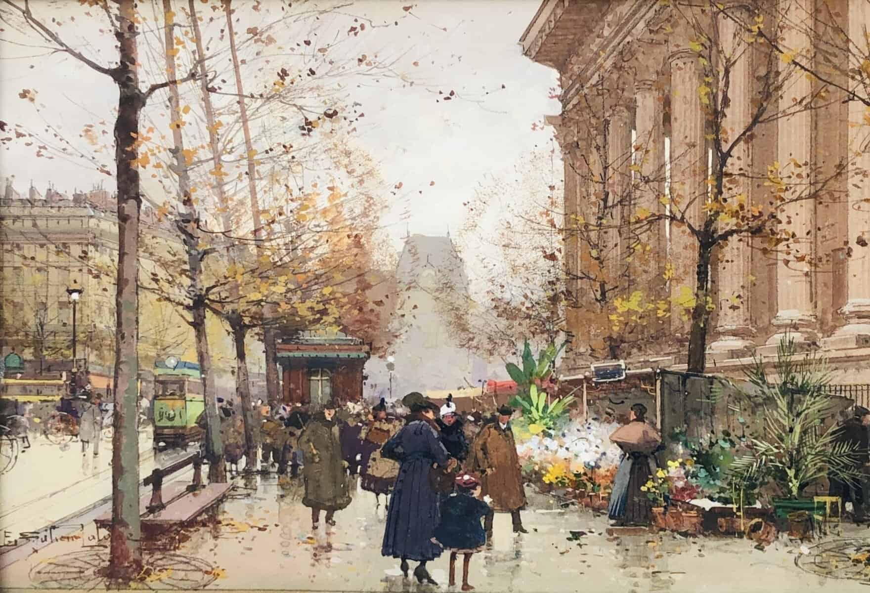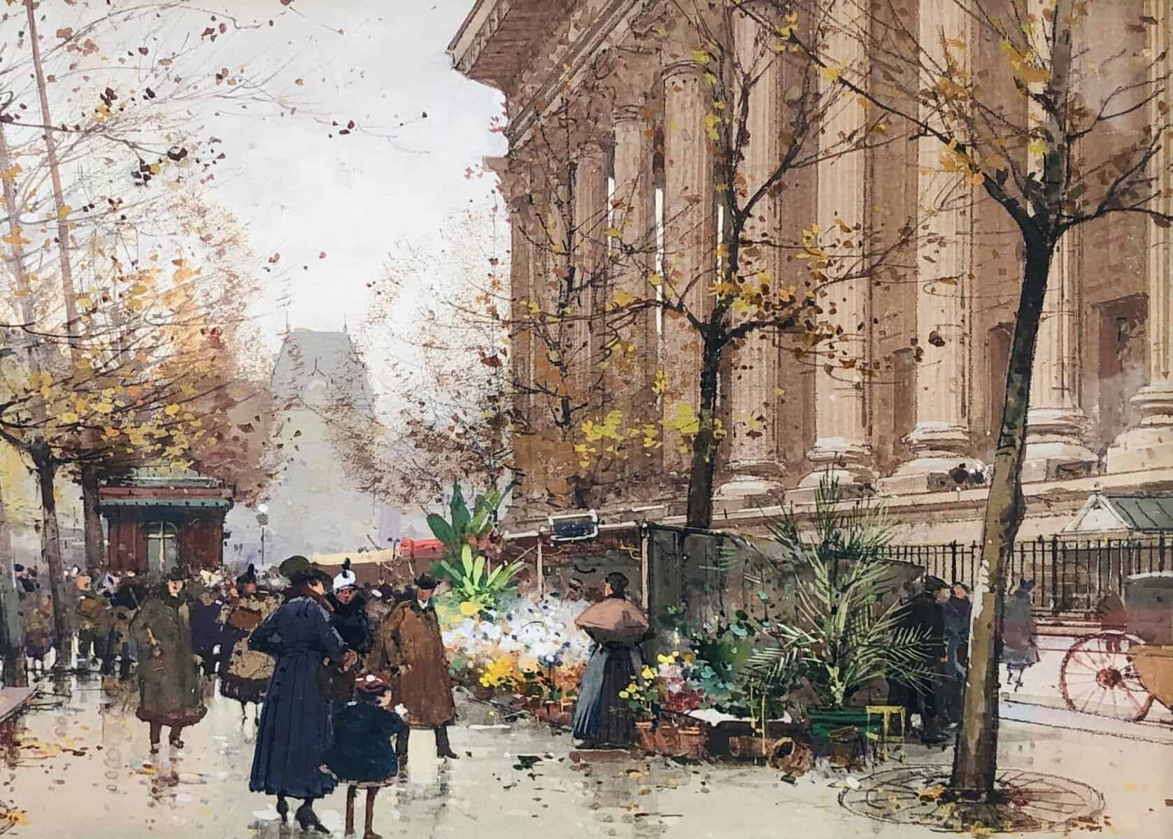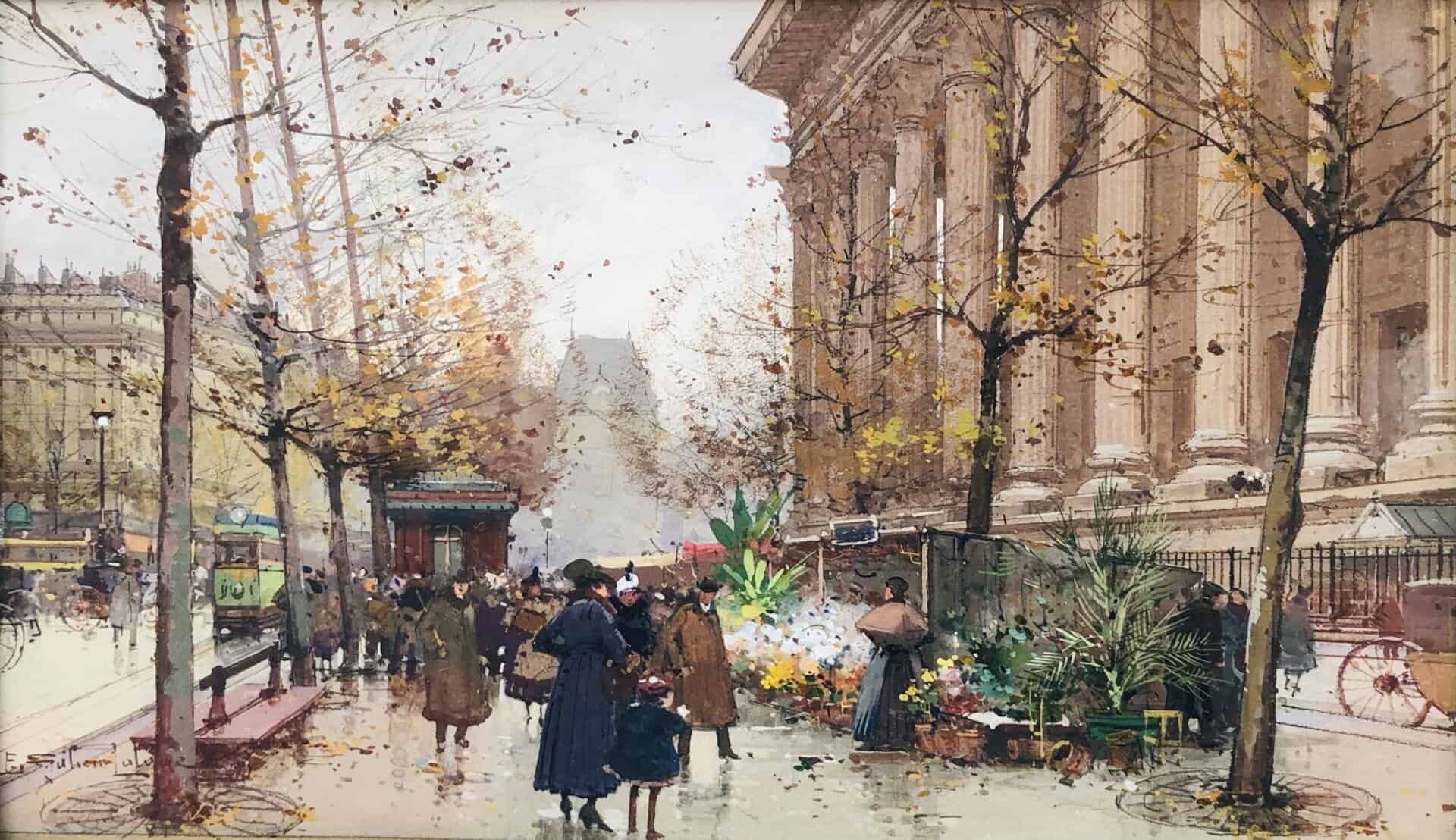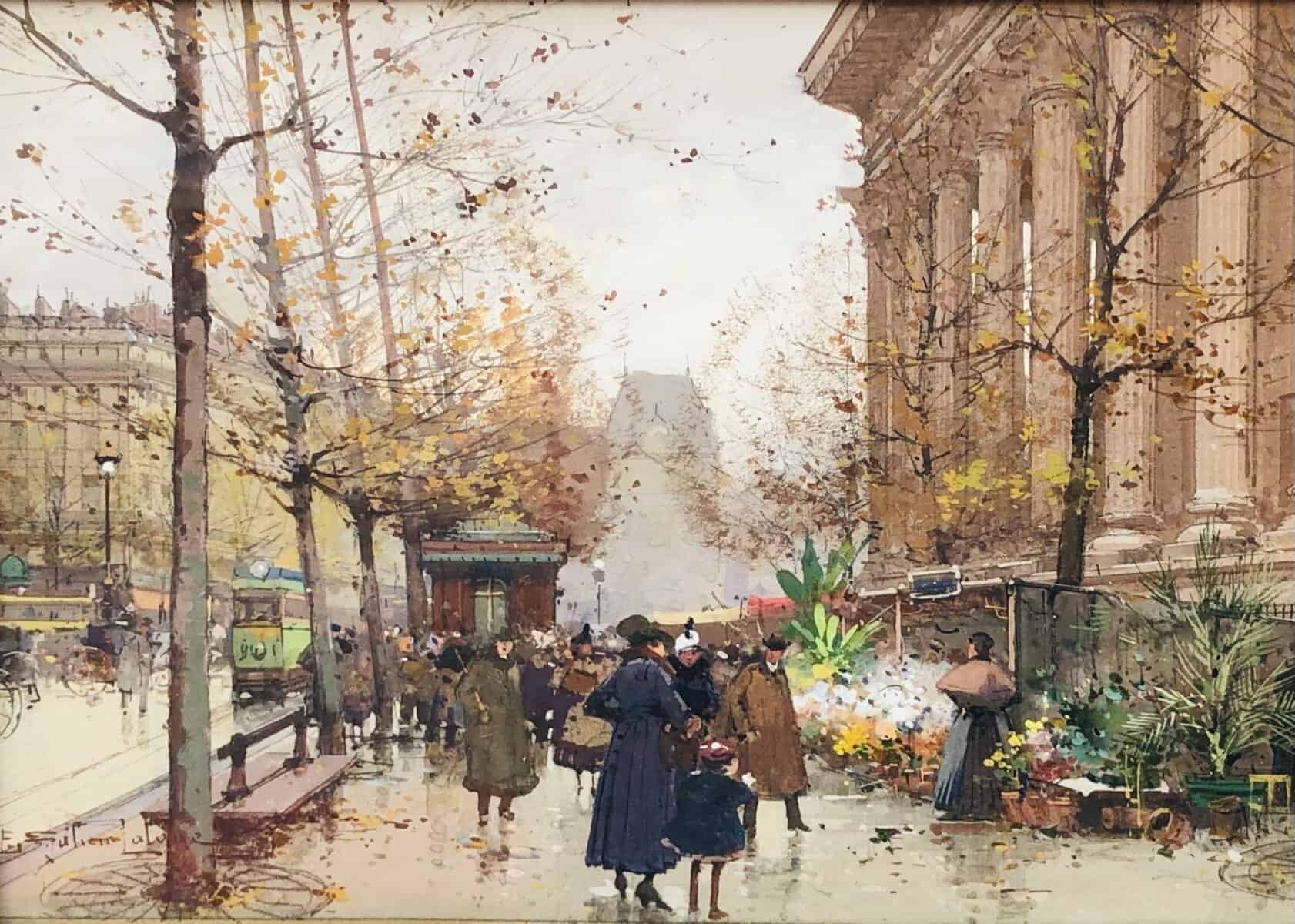 Peintre de scènes de genre , sujets militaires , paysages animés , paysages urbains , peintre à la gouache , aquarelliste . Elève de son père Charles Laloue , Eugène Galien-Laloue expose au Salon à partir de 1879 et se fait une spécialité des vues de Paris à La Belle Epoque . Doué d’une grande facilité , Eugène Galien-Laloue a eu une très grande production , principalement à la gouache et des oeuvres de petites tailles . Eugène Galien-Laloue représente souvent les endroits les plus pittoresques de Paris : Les Grands Boulevards , Les marchés aux fleurs de La Madeleine ou de La Conciergerie , Les quais de La Seine . Au début du 20ème siècle Eugène Galien-Laloue a une belle réputation en évoquant l’atmosphère de Paris en 1900 avec ses omnibus et ses fiacres de La Belle Epoque .L’oeuvre de Eugène Galien-Laloue a également une valeur de témoignage de son époque . Cet artiste raffiné et délicat a peint aussi des paysages de Normandie , de Seine et Marne , de Marseille , d’Italie et de Venise et en 1914 des représentations de vues militaires . Les PEINTRES de PARIS Paris est l’une des villes au monde qui a le plus attiré les peintres. Mais la nature et les raisons de cet intérêt ont évolué avec l’histoire de la ville. Paris est une mosaïque de quartiers. Les peintres en ont représenté les sites les plus séduisants et les monuments prestigieux en s’appropriant les lieux pour en nourrir leur imaginaire – de l’Ile de la Cité à l’Arc de Triomphe – de la place Clichy à l’Opéra – du Quartier Latin aux Tuileries – des Grands Boulevards à Montmartre ou aux quais de Seine – Le XIXème siècle a profondément modifié l’aspect de la ville et le peintre réaliste s’attachera à représenter les hommes dans leur vie quotidienne. Sous Napoléon III, la modernisation de la capitale, dirigée par le baron Haussmann, avec le percement de grandes artères, la construction de nouveaux quartiers comme autour du Parc Monceau ou l’Etoile, des monuments comme l’Opéra ou l’Eglise St-Augustin, l’aménagement des Bois de Boulogne et Vincennes – autant de sujets que les peintres voudront fixer sur la toile. Après les épreuves de 1870, Paris se libère et vit une période de plaisirs de joie de vivre. De nombreux peintres, Français et Etrangers, ont illustré avec bonheur cette société dite de « La Belle Epoque » – Parmi les plus célèbres : Auguste Renoir et « Le Bal du Moulin de la Galette » Claude Monet et « la Gare St-Lazare » – Raoul Dufy au « Palais Royal » – Edouard Manet « La Musique aux Tuileries » – Henri de Toulouse Lautrec « Au Moulin Rouge » Certains peintres sont devenus « les spécialistes de Paris » représentant l’animation des rues et jardins, les marchés aux fleurs de la cité ou le long de l’Eglise de la Madeleine, les « bouquinistes » sur les quais de Seine avec Notre Dame… Tout est prétexte à croquer sur le vif cette vie trépidante et mondaine à toute heure du jour ou de la nuit, et en toute saison. Tels : Jean Béraud et ses élégantes – Edouard Cortès – Georges Stein – Eugène Galien Laloue – et beaucoup d’autres peut-être moins célèbres mais tout aussi talentueux.