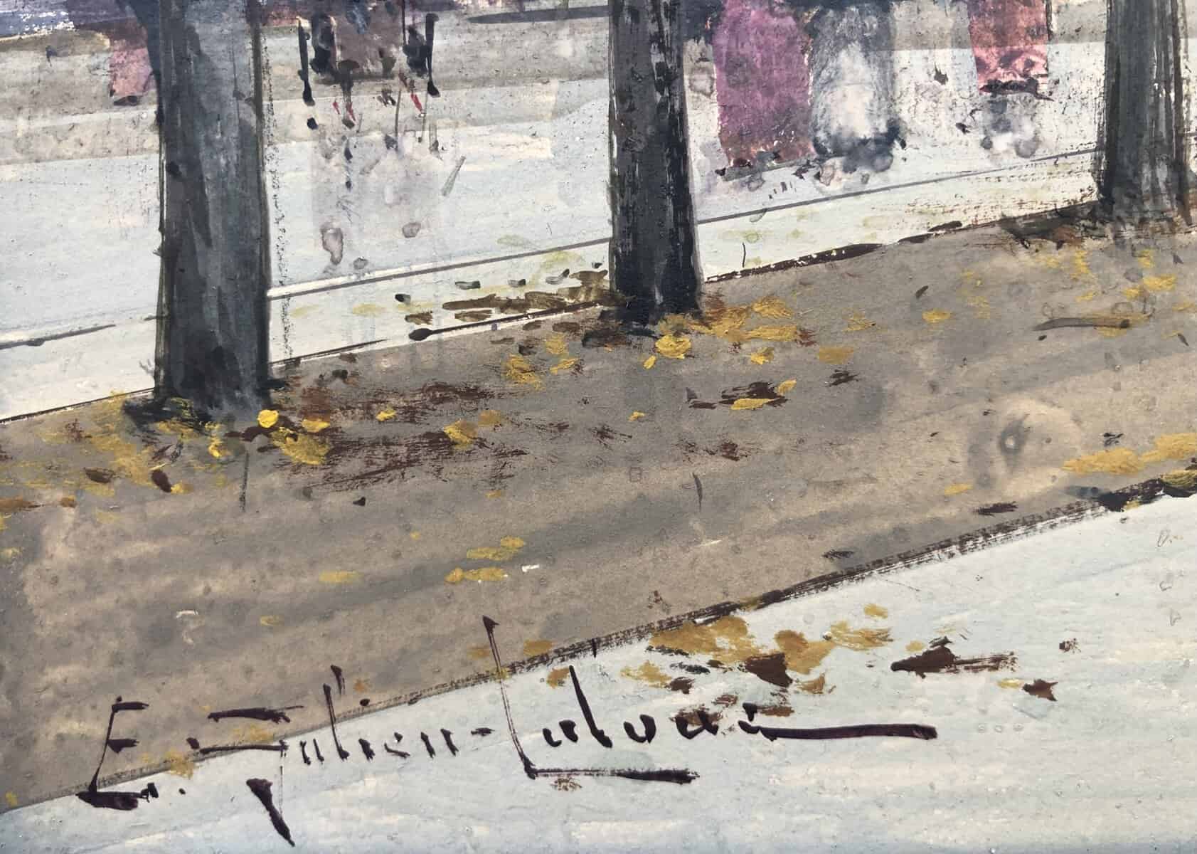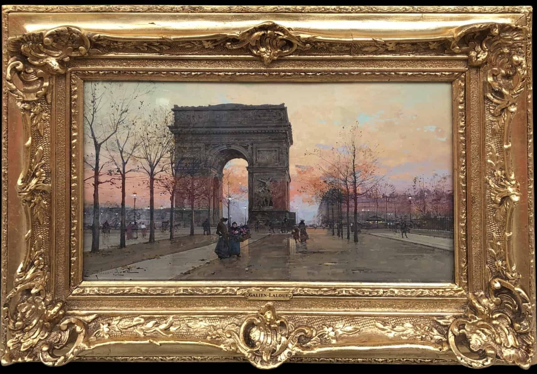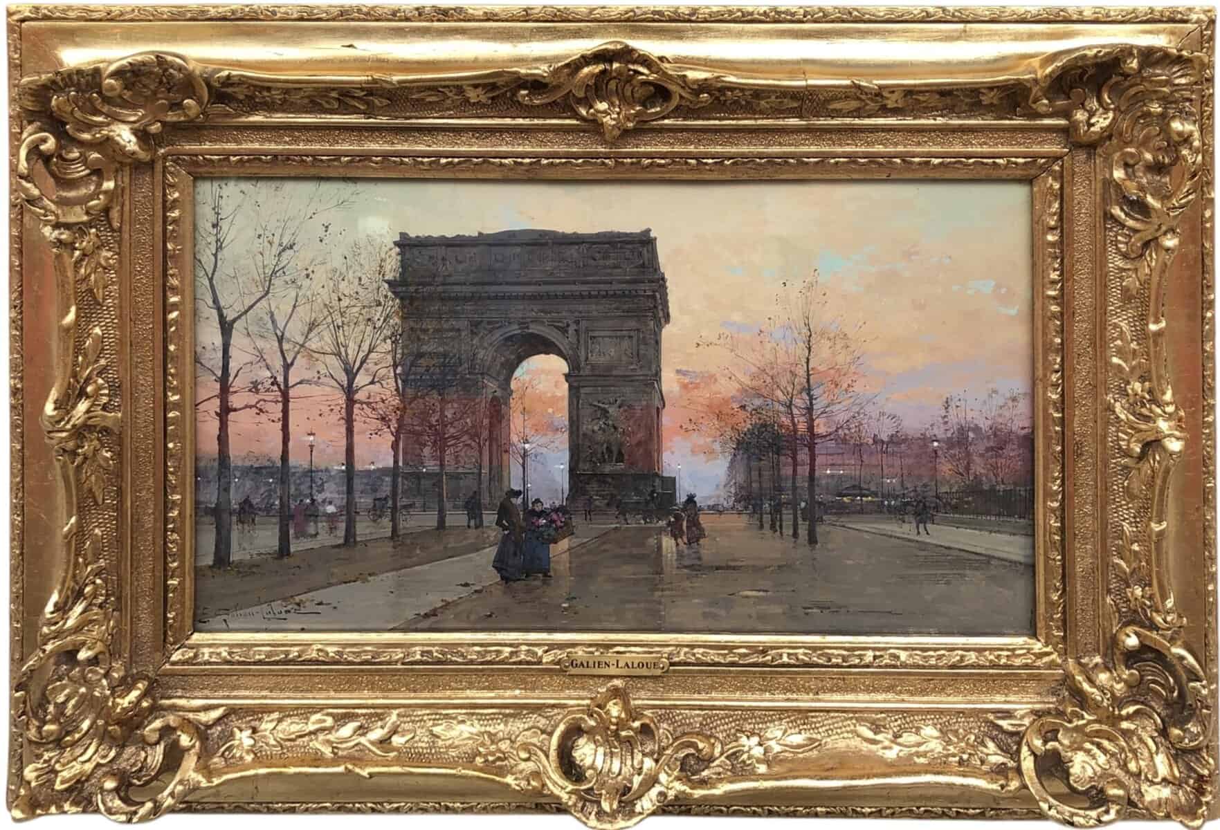 Peintre de scènes de genre , sujets militaires , paysages animés , paysages urbains , peintre à la gouache , aquarelliste . Elève de son père Charles Laloue , Eugène Galien-Laloue expose au Salon à partir de 1879 et se fait une spécialité des vues de Paris à La Belle Epoque . Doué d’une grande facilité , Eugène Galien-Laloue a eu une très grande production , principalement à la gouache et des oeuvres de petites tailles . Eugène Galien-Laloue représente souvent les endroits les plus pittoresques de Paris : Les Grands Boulevards , Les marchés aux fleurs de La Madeleine ou de La Conciergerie , Les quais de La Seine . Au début du 20ème siècle Eugène Galien-Laloue a une belle réputation en évoquant l’atmosphère de Paris en 1900 avec ses omnibus et ses fiacres de La Belle Epoque .L’oeuvre de Eugène Galien-Laloue a également une valeur de témoignage de son époque . Cet artiste raffiné et délicat a peint aussi des paysages de Normandie , de Seine et Marne , de Marseille , d’Italie et de Venise et en 1914 des représentations de vues militaires . Les PEINTRES de PARIS Paris est l’une des villes au monde qui a le plus attiré les peintres. Mais la nature et les raisons de cet intérêt ont évolué avec l’histoire de la ville. Paris est une mosaïque de quartiers. Les peintres en ont représenté les sites les plus séduisants et les monuments prestigieux en s’appropriant les lieux pour en nourrir leur imaginaire – de l’Ile de la Cité à l’Arc de Triomphe – de la place Clichy à l’Opéra – du Quartier Latin aux Tuileries – des Grands Boulevards à Montmartre ou aux quais de Seine – Le XIXème siècle a profondément modifié l’aspect de la ville et le peintre réaliste s’attachera à représenter les hommes dans leur vie quotidienne. Sous Napoléon III, la modernisation de la capitale, dirigée par le baron Haussmann, avec le percement de grandes artères, la construction de nouveaux quartiers comme autour du Parc Monceau ou l’Etoile, des monuments comme l’Opéra ou l’Eglise St-Augustin, l’aménagement des Bois de Boulogne et Vincennes – autant de sujets que les peintres voudront fixer sur la toile. Après les épreuves de 1870, Paris se libère et vit une période de plaisirs de joie de vivre. De nombreux peintres, Français et Etrangers, ont illustré avec bonheur cette société dite de « La Belle Epoque » – Parmi les plus célèbres : Auguste Renoir et « Le Bal du Moulin de la Galette » Claude Monet et « la Gare St-Lazare » – Raoul Dufy au « Palais Royal » – Edouard Manet « La Musique aux Tuileries » – Henri de Toulouse Lautrec « Au Moulin Rouge » Certains peintres sont devenus « les spécialistes de Paris » représentant l’animation des rues et jardins, les marchés aux fleurs de la cité ou le long de l’Eglise de la Madeleine, les « bouquinistes » sur les quais de Seine avec Notre Dame… Tout est prétexte à croquer sur le vif cette vie trépidante et mondaine à toute heure du jour ou de la nuit, et en toute saison. Tels : Jean Béraud et ses élégantes – Edouard Cortès – Georges Stein – Eugène Galien Laloue – et beaucoup d’autres peut-être moins célèbres mais tout aussi talentueux.