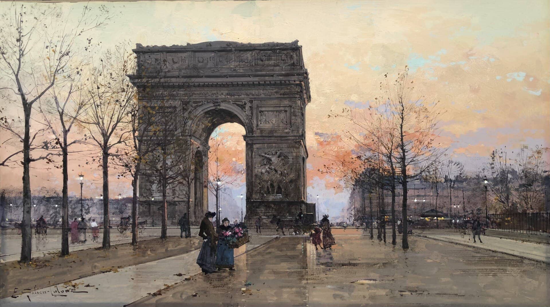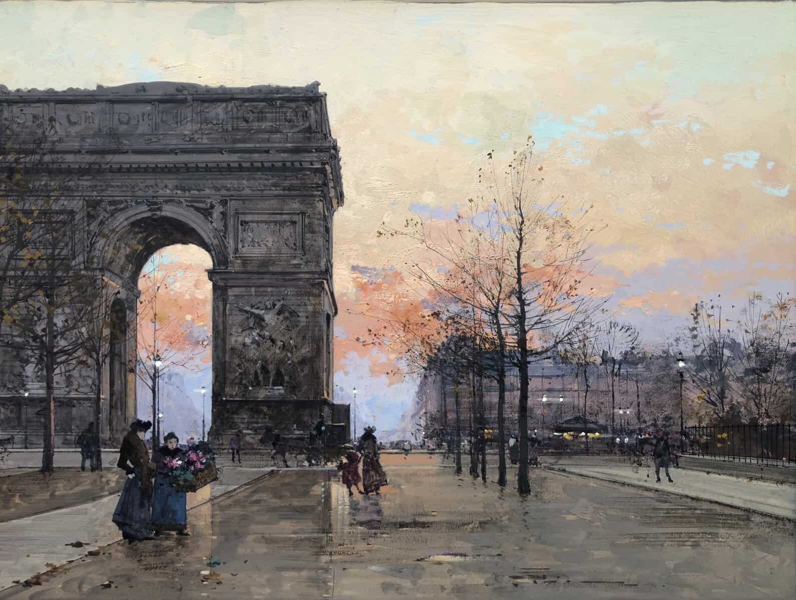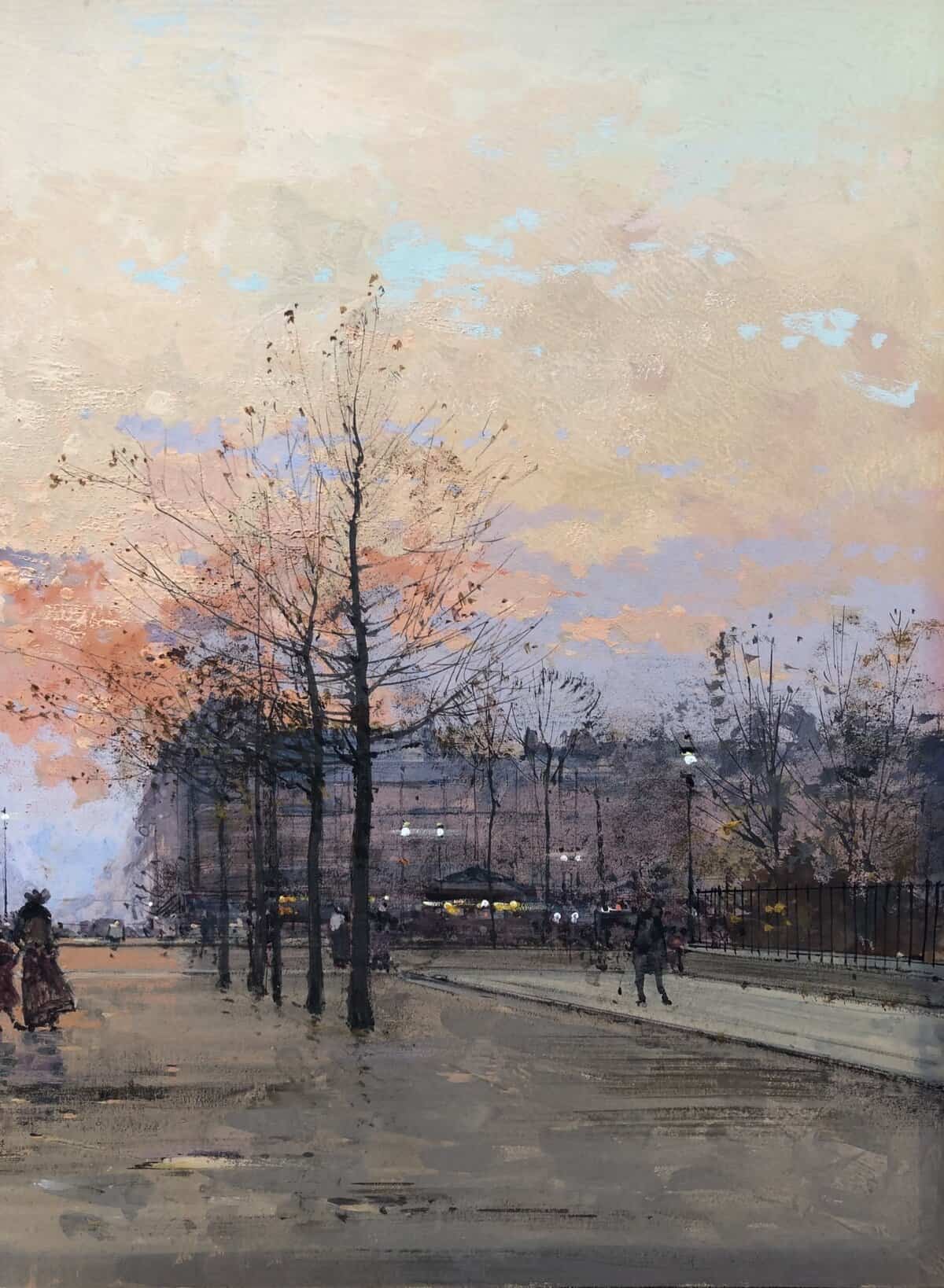 Peintre de scènes de genre , sujets militaires , paysages animés , paysages urbains , peintre à la gouache , aquarelliste . Elève de son père Charles Laloue , Eugène Galien-Laloue expose au Salon à partir de 1879 et se fait une spécialité des vues de Paris à La Belle Epoque . Doué d’une grande facilité , Eugène Galien-Laloue a eu une très grande production , principalement à la gouache et des oeuvres de petites tailles . Eugène Galien-Laloue représente souvent les endroits les plus pittoresques de Paris : Les Grands Boulevards , Les marchés aux fleurs de La Madeleine ou de La Conciergerie , Les quais de La Seine . Au début du 20ème siècle Eugène Galien-Laloue a une belle réputation en évoquant l’atmosphère de Paris en 1900 avec ses omnibus et ses fiacres de La Belle Epoque .L’oeuvre de Eugène Galien-Laloue a également une valeur de témoignage de son époque . Cet artiste raffiné et délicat a peint aussi des paysages de Normandie , de Seine et Marne , de Marseille , d’Italie et de Venise et en 1914 des représentations de vues militaires . Les PEINTRES de PARIS Paris est l’une des villes au monde qui a le plus attiré les peintres. Mais la nature et les raisons de cet intérêt ont évolué avec l’histoire de la ville. Paris est une mosaïque de quartiers. Les peintres en ont représenté les sites les plus séduisants et les monuments prestigieux en s’appropriant les lieux pour en nourrir leur imaginaire – de l’Ile de la Cité à l’Arc de Triomphe – de la place Clichy à l’Opéra – du Quartier Latin aux Tuileries – des Grands Boulevards à Montmartre ou aux quais de Seine – Le XIXème siècle a profondément modifié l’aspect de la ville et le peintre réaliste s’attachera à représenter les hommes dans leur vie quotidienne. Sous Napoléon III, la modernisation de la capitale, dirigée par le baron Haussmann, avec le percement de grandes artères, la construction de nouveaux quartiers comme autour du Parc Monceau ou l’Etoile, des monuments comme l’Opéra ou l’Eglise St-Augustin, l’aménagement des Bois de Boulogne et Vincennes – autant de sujets que les peintres voudront fixer sur la toile. Après les épreuves de 1870, Paris se libère et vit une période de plaisirs de joie de vivre. De nombreux peintres, Français et Etrangers, ont illustré avec bonheur cette société dite de « La Belle Epoque » – Parmi les plus célèbres : Auguste Renoir et « Le Bal du Moulin de la Galette » Claude Monet et « la Gare St-Lazare » – Raoul Dufy au « Palais Royal » – Edouard Manet « La Musique aux Tuileries » – Henri de Toulouse Lautrec « Au Moulin Rouge » Certains peintres sont devenus « les spécialistes de Paris » représentant l’animation des rues et jardins, les marchés aux fleurs de la cité ou le long de l’Eglise de la Madeleine, les « bouquinistes » sur les quais de Seine avec Notre Dame… Tout est prétexte à croquer sur le vif cette vie trépidante et mondaine à toute heure du jour ou de la nuit, et en toute saison. Tels : Jean Béraud et ses élégantes – Edouard Cortès – Georges Stein – Eugène Galien Laloue – et beaucoup d’autres peut-être moins célèbres mais tout aussi talentueux.