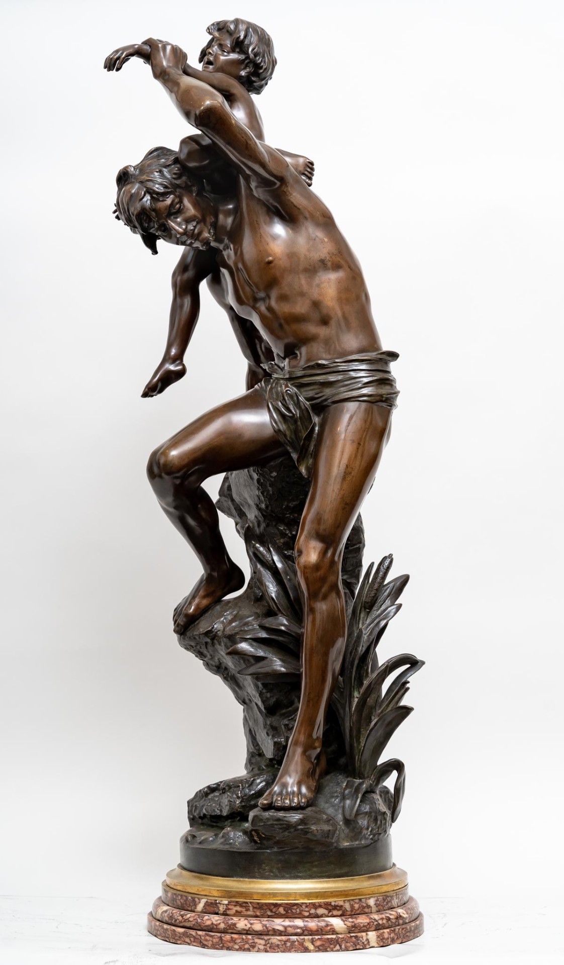 Specatculaire sculpture de l’artiste Gaston Veuvenot LEROUX, représentant un homme, vêtu d’un simple drapé, qui traverse un cours d’eau en portant un jeune enfant sur son épaule. Le mouvement de sa posture, l’inclinaison de son corps et la tension de ses muscles traduisent l’effort de franchissement. L’enfant, accroché à son cou, laisse transparaître sa frayeur. Son visage crispé et ses bras tendus expriment la peur, voire les pleurs.