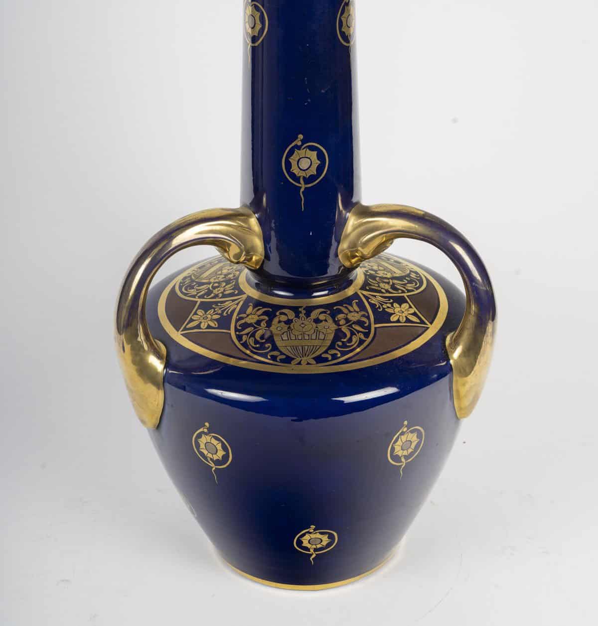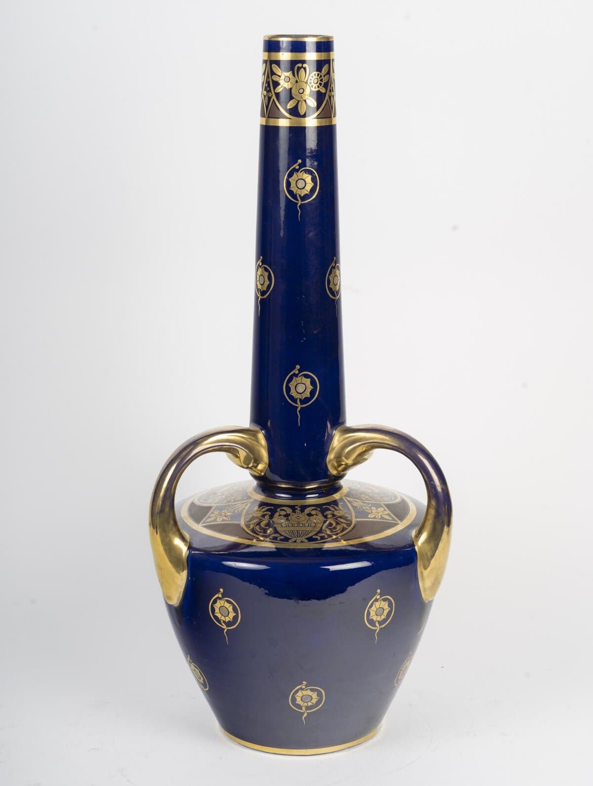 Grand vase en porcelaine bleue de Sèvres à décor floral doré.