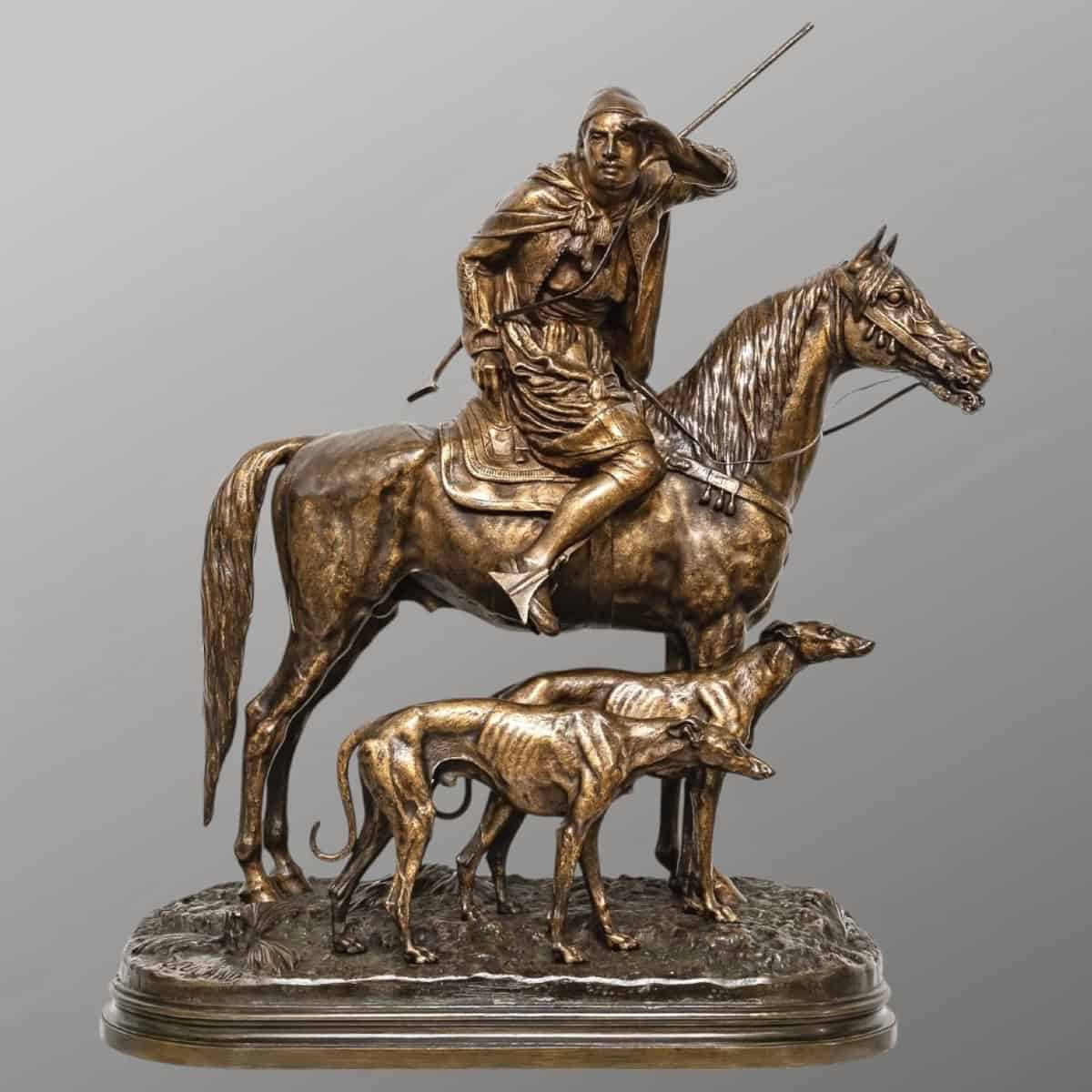 Important groupe en bronze orientaliste , à patine mordorée , représentant un cavalier arabe aux aguets , accompagné de ses deux lévriers , Alfred Dubucand (1828-1894) .