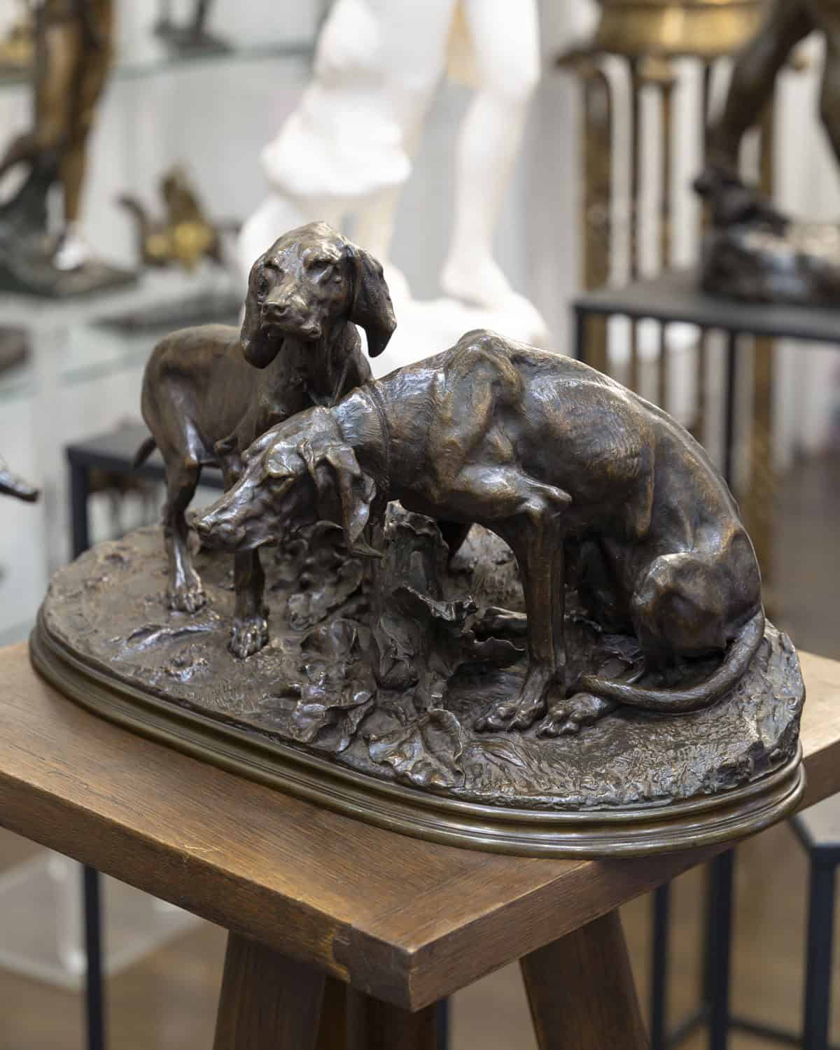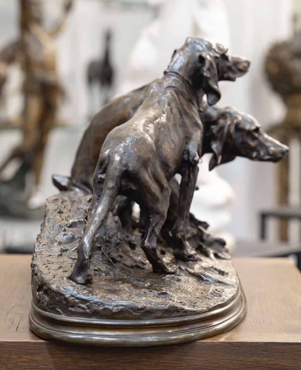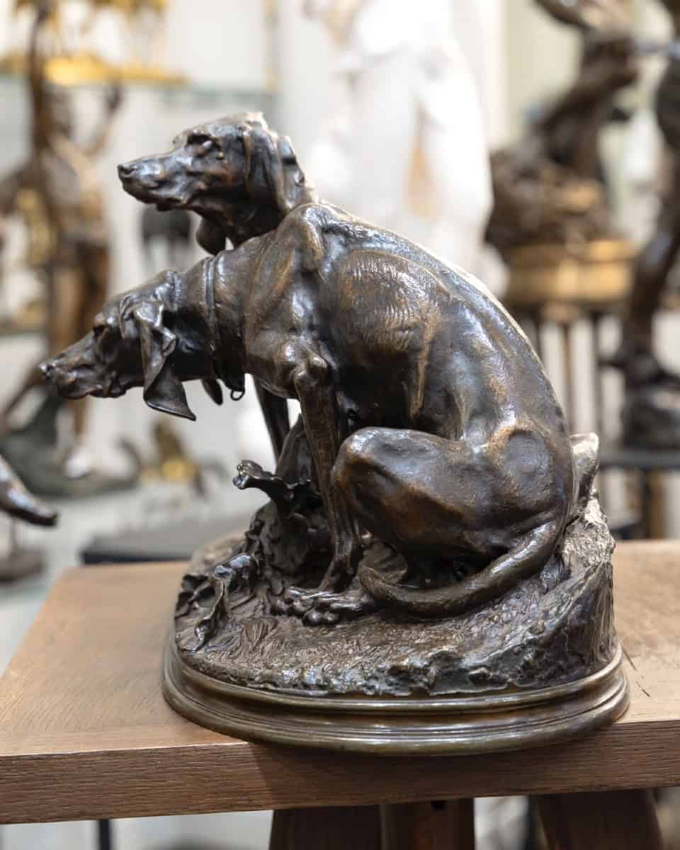 Groupe en bronze représentant deux chiens de chasse au repos , de race « Saintongeoise » , par le sculpteur Pierre-Jules Mêne (1810-1879) .