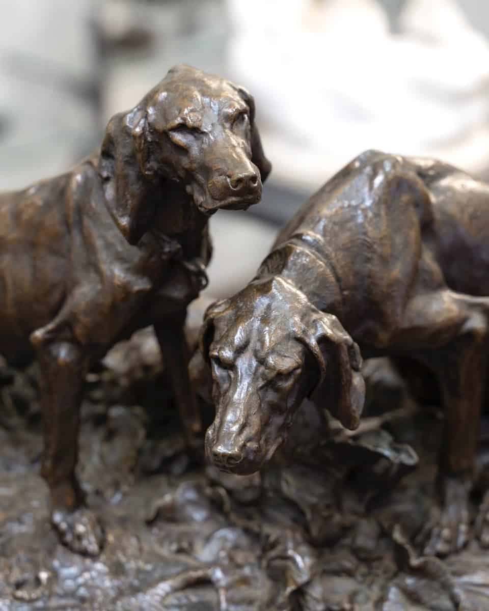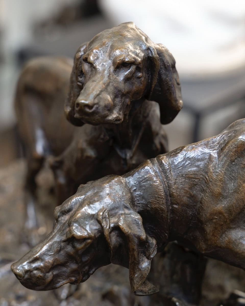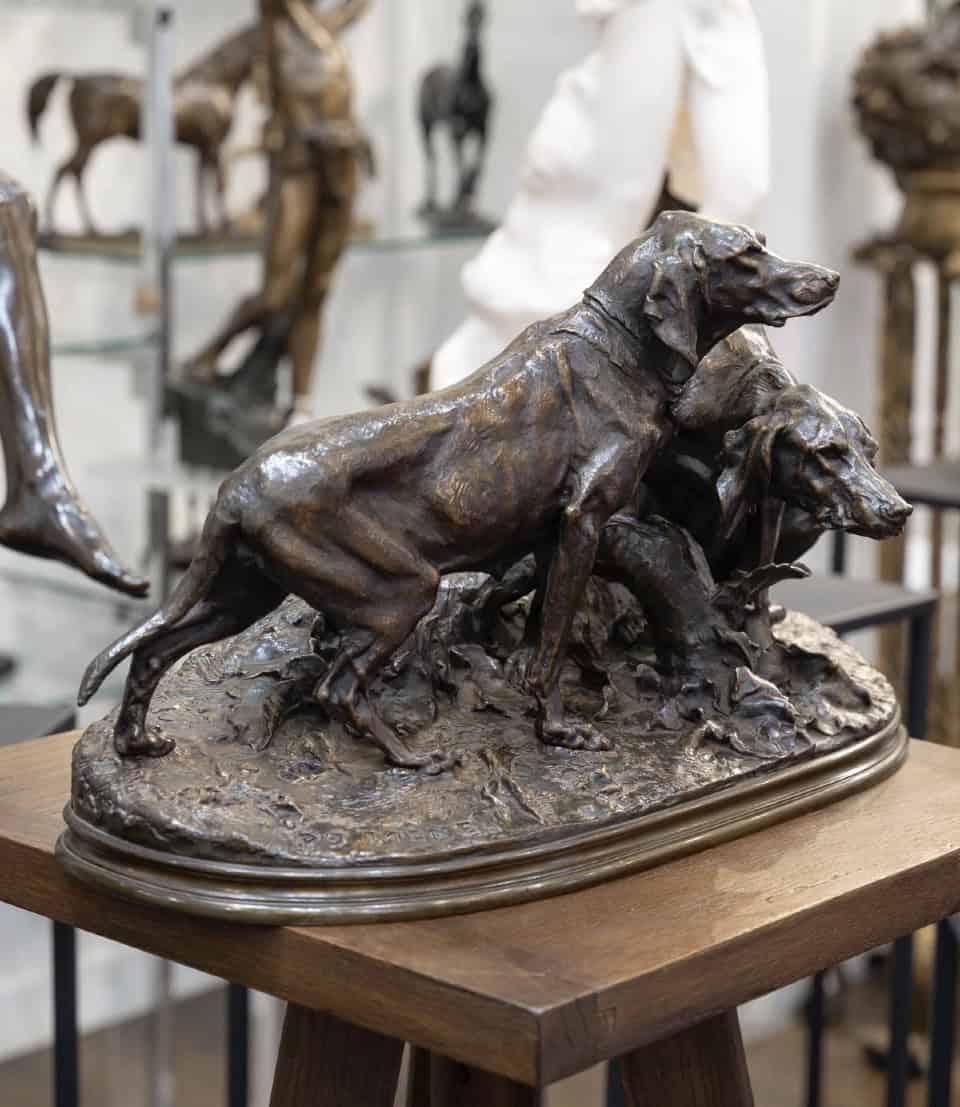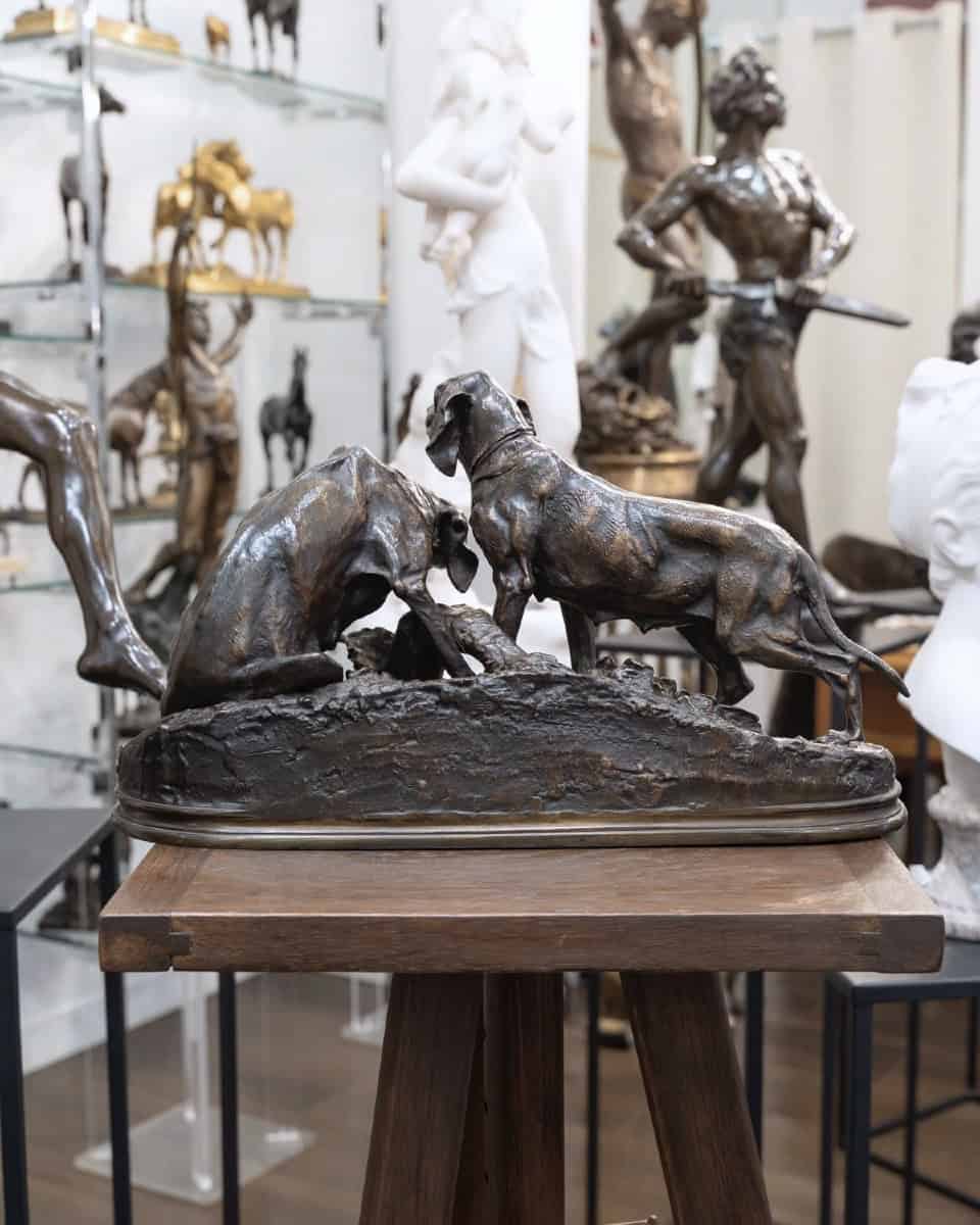 Groupe en bronze représentant deux chiens de chasse au repos , de race « Saintongeoise » , par le sculpteur Pierre-Jules Mêne (1810-1879) .