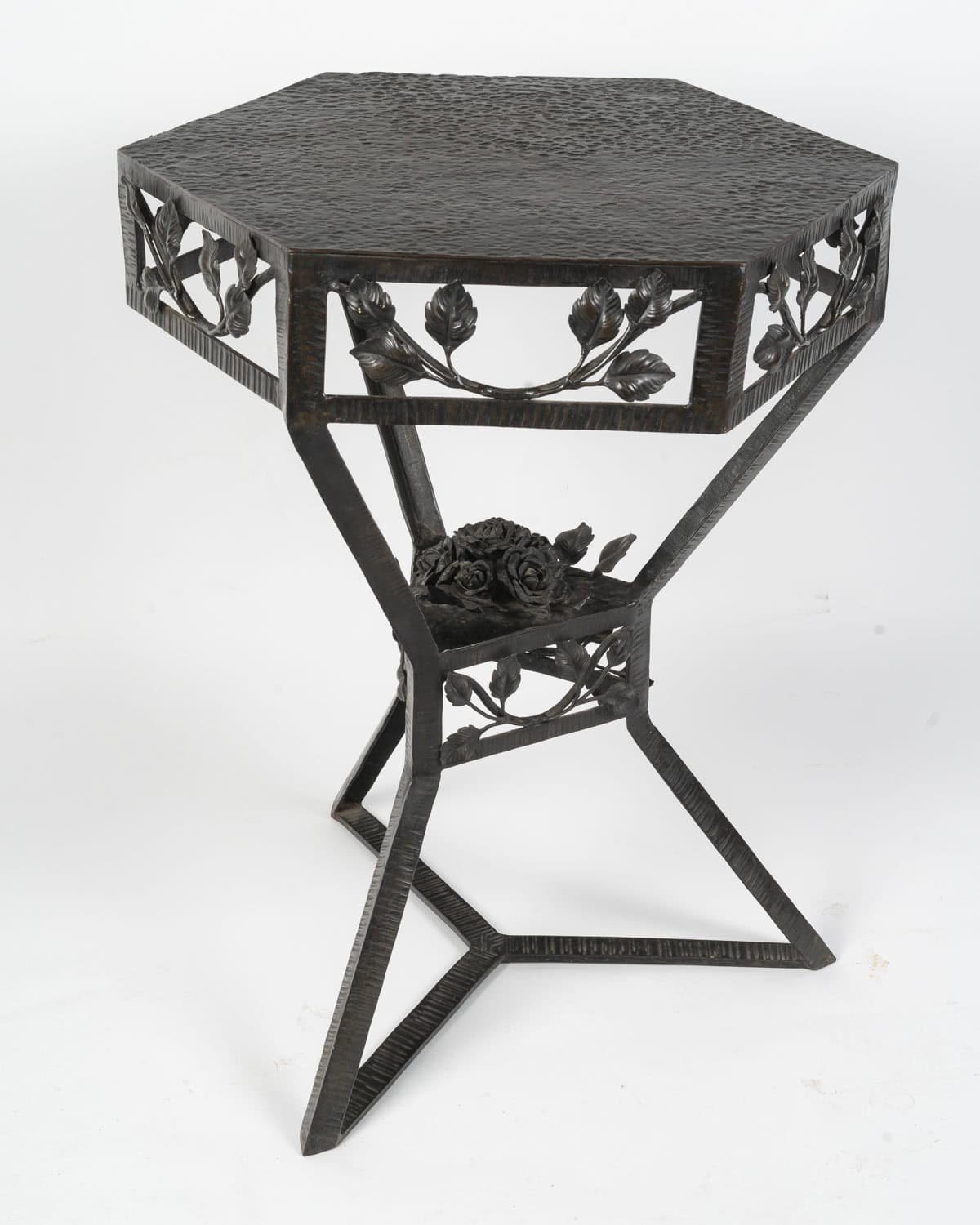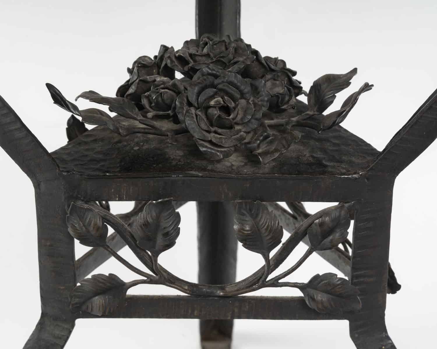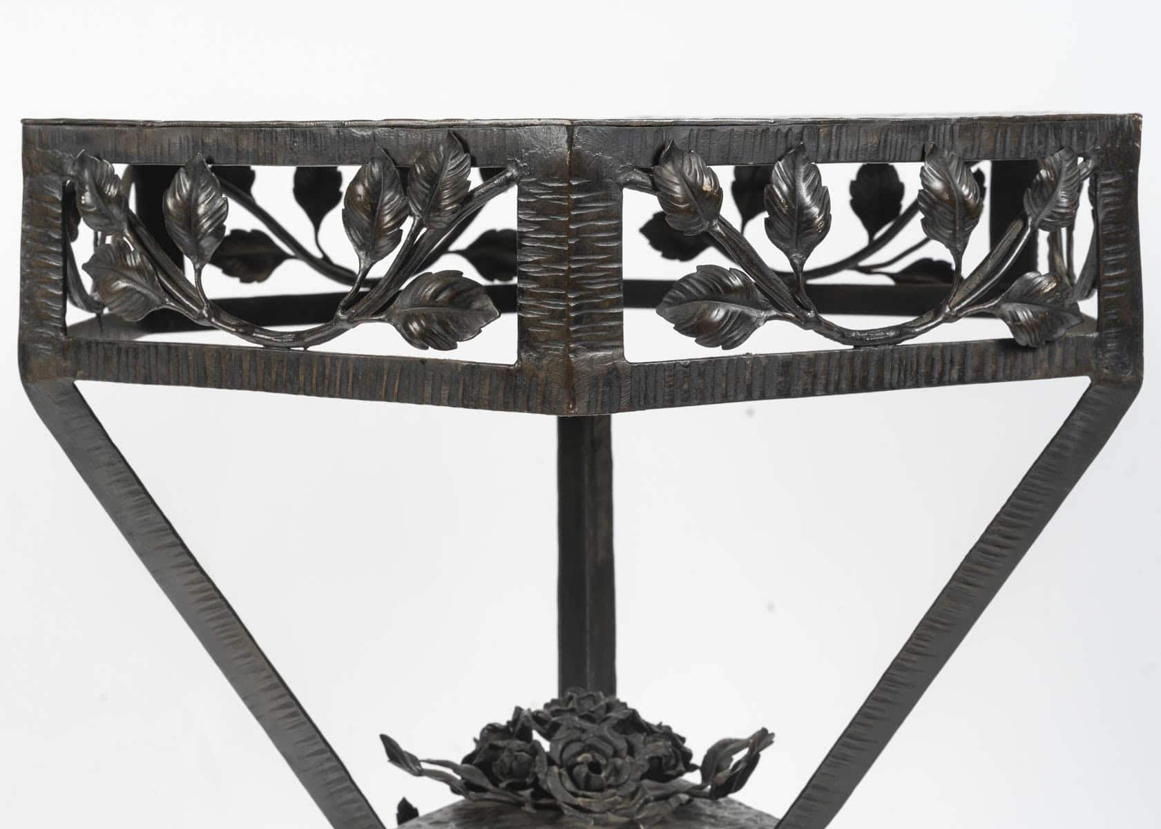 Le plateau en cuivre de forme hexagonale à patine brune est travaillé en dinanderie. Le piètement est garni de branches feuillues, un bouquet de roses orne le centre. Les pieds sont martelés formant des lignes parallèles.