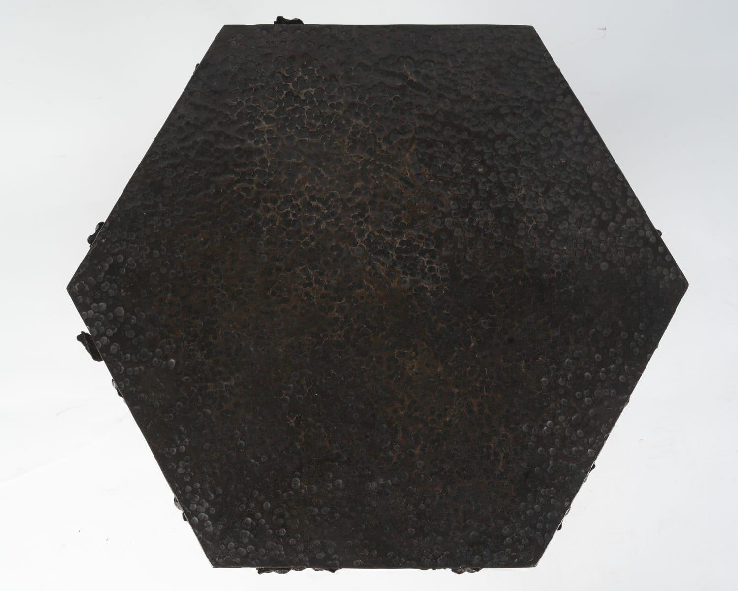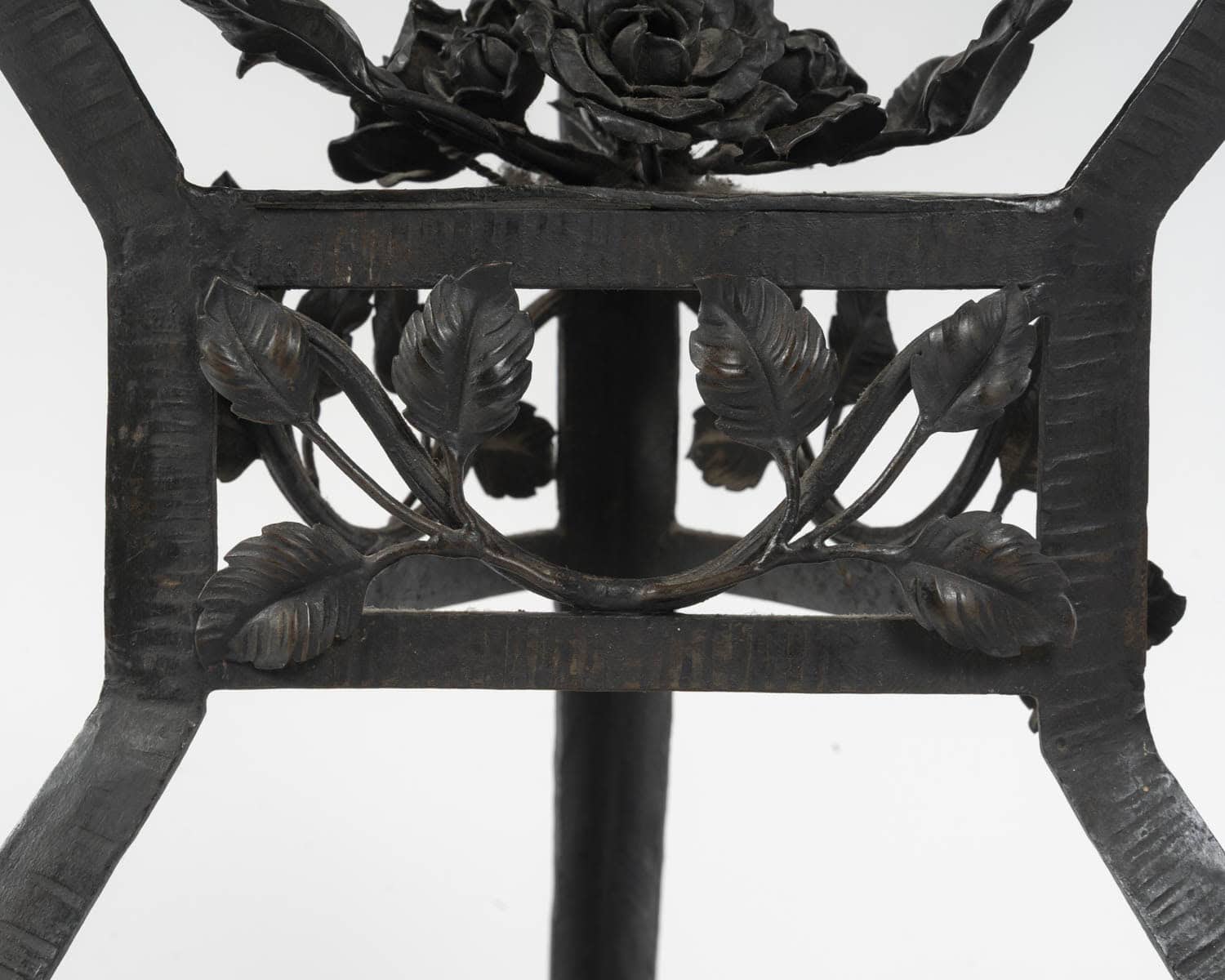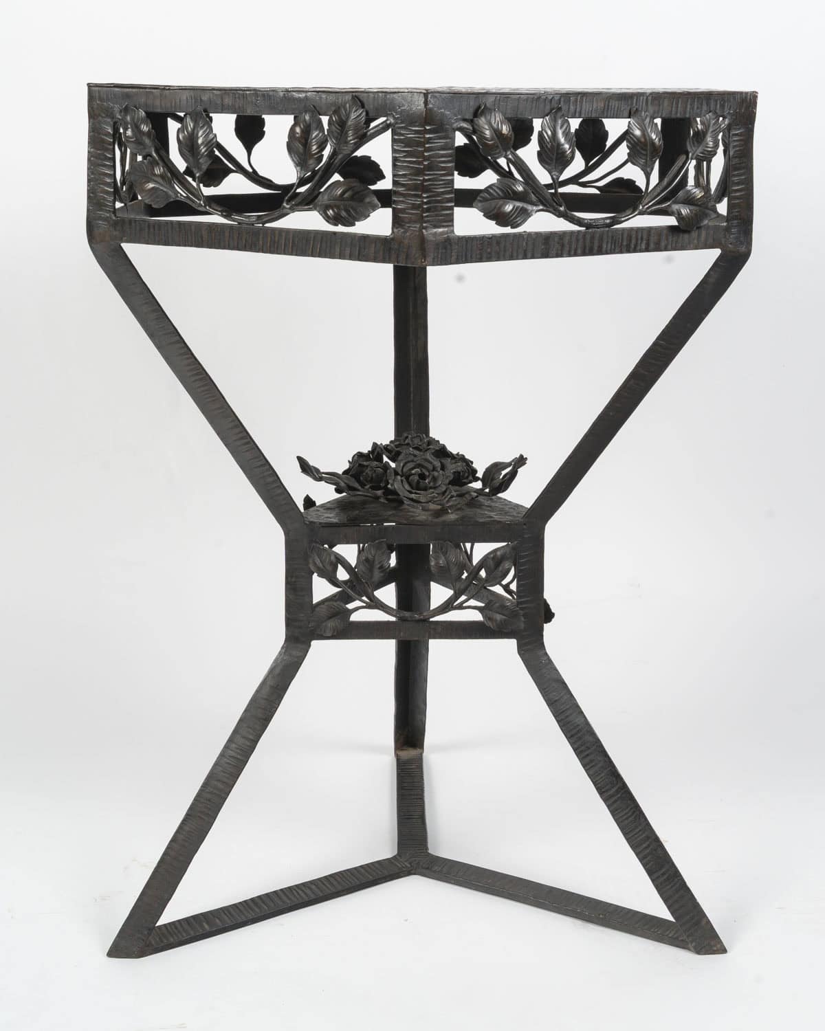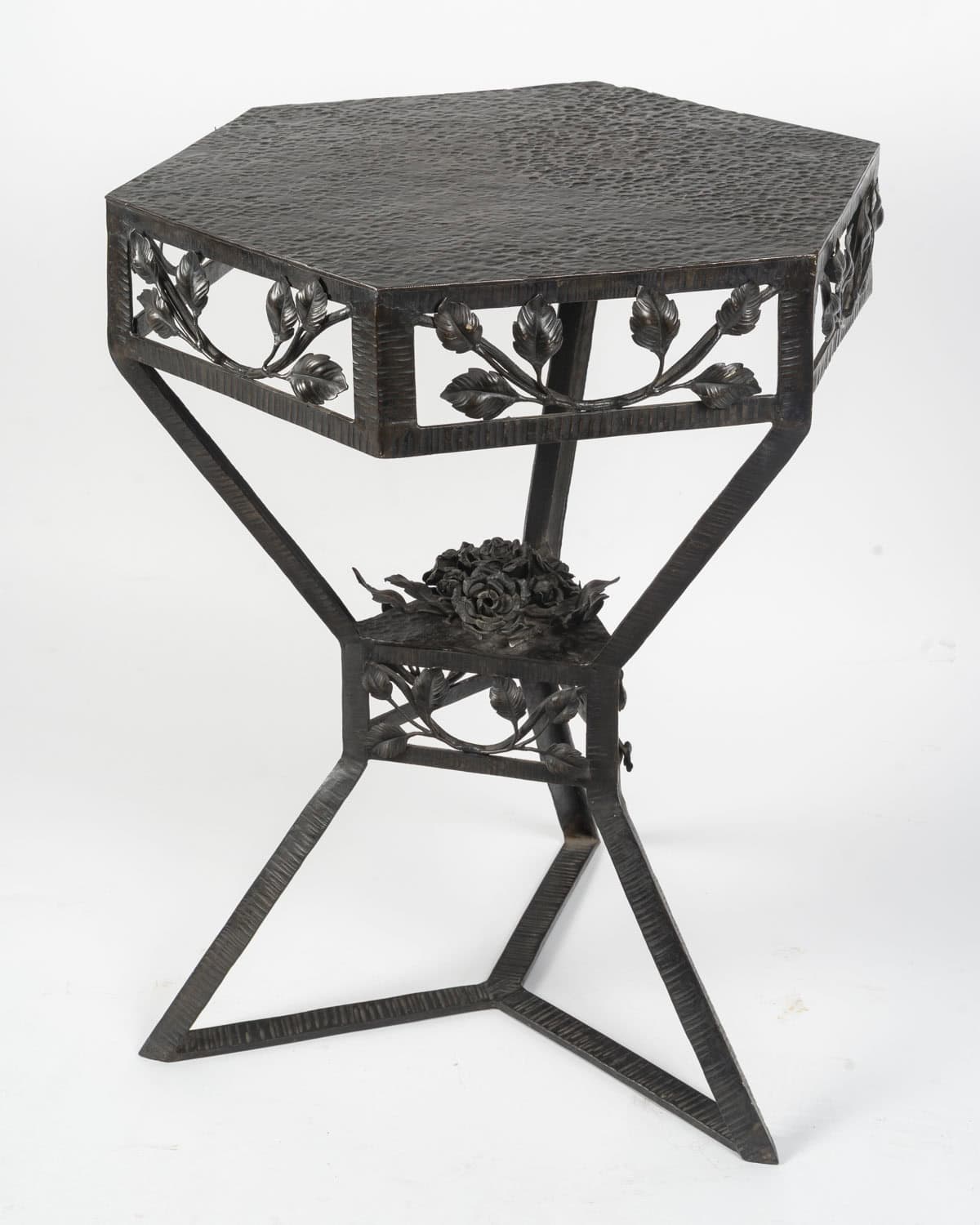 Le plateau en cuivre de forme hexagonale à patine brune est travaillé en dinanderie. Le piètement est garni de branches feuillues, un bouquet de roses orne le centre. Les pieds sont martelés formant des lignes parallèles.