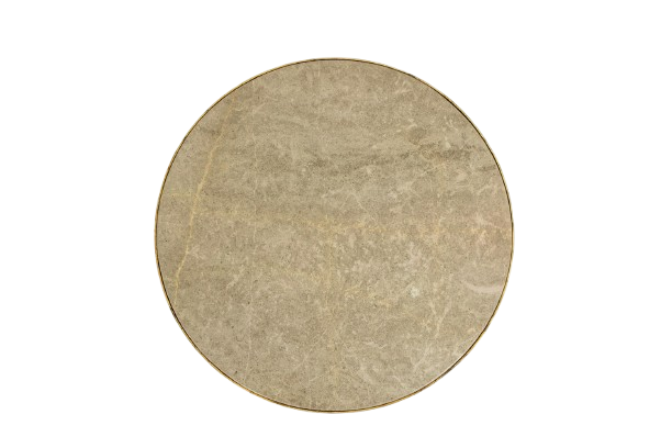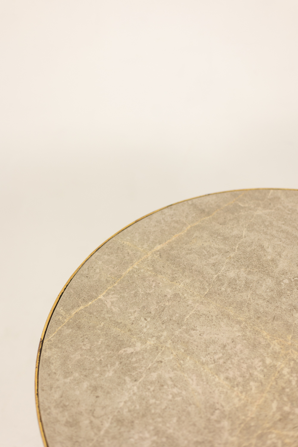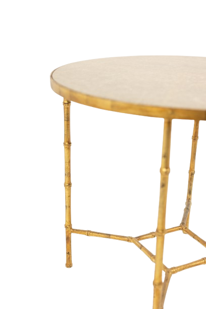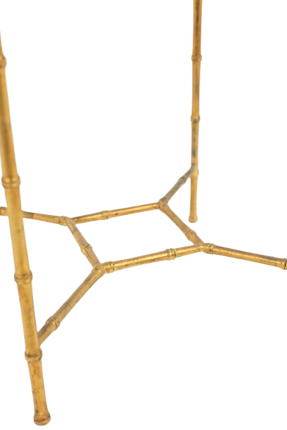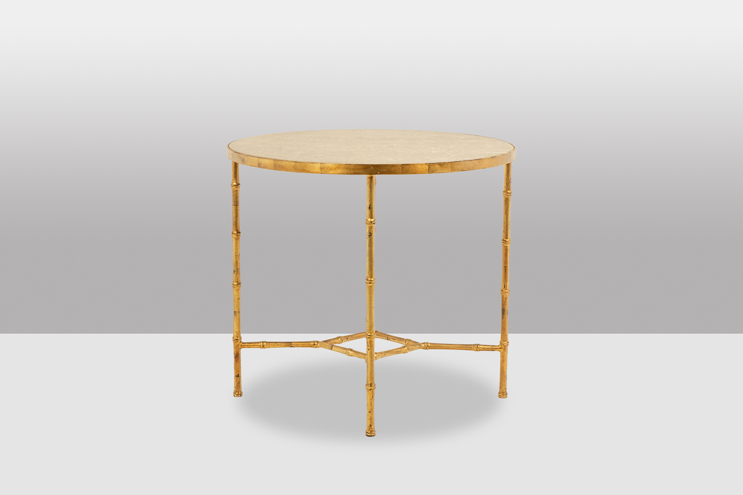 Guéridon composé d’un piètement en métal doré façon bambou, avec son plateau de forme ronde en marbre gris.