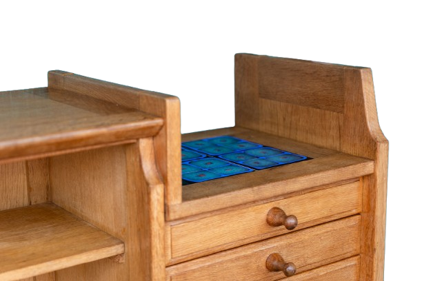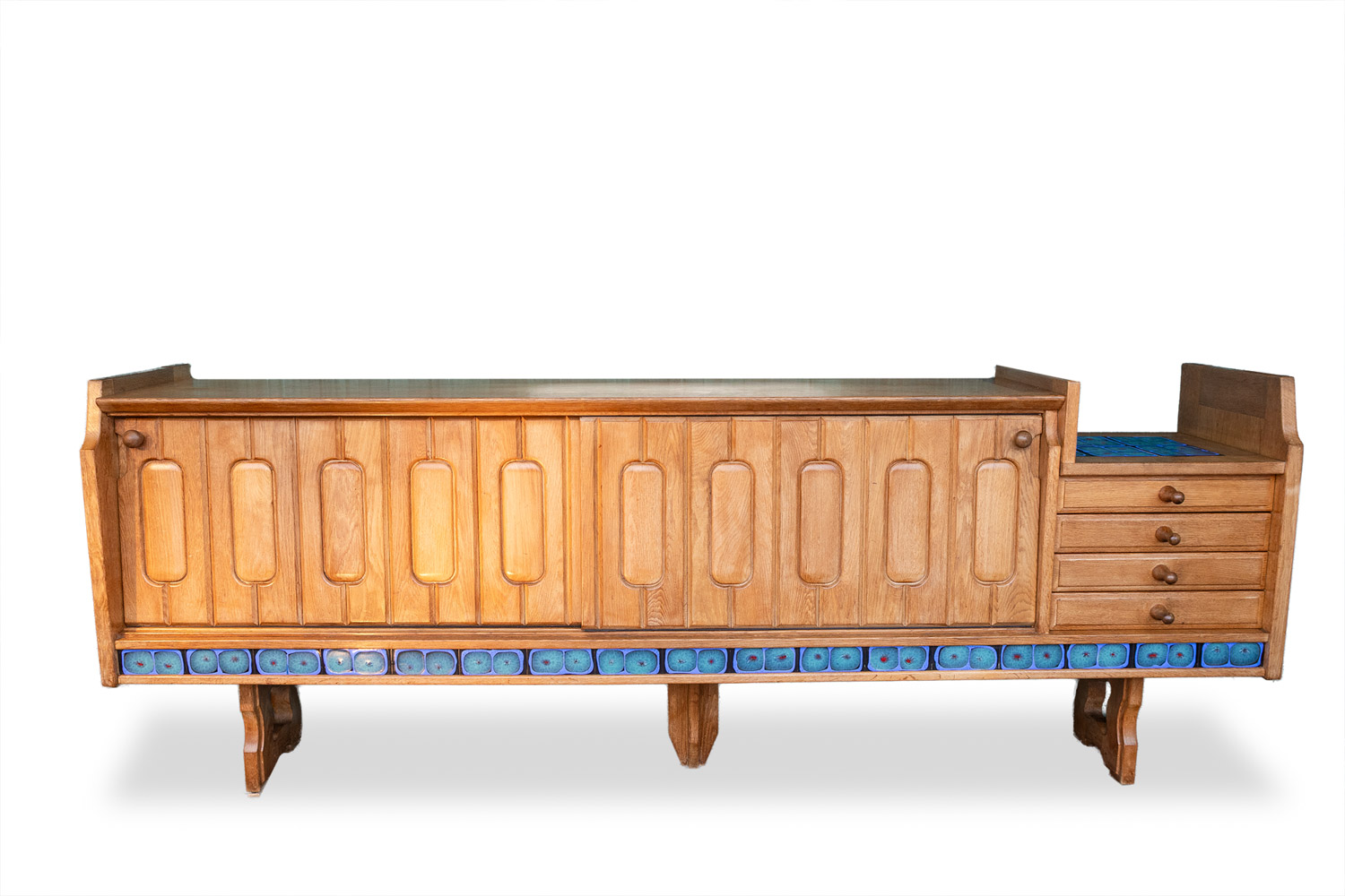 Enfilade en chêne blond massif ouvrant à deux panneaux coulissants sculptés et 4 petits tiroirs. Décor de carreaux de céramique, en frise en façade et sur le dessus de la partie tiroirs, travail probable du céramiste Boleslaw Danikowski L’enfilade repose sur 3 pieds de forme mouvementée.