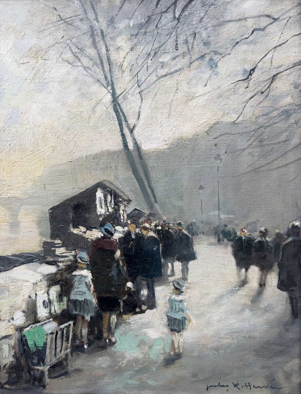Jules René HERVE, Né à Langres ( Haute-Marne ) en 1887, Mort à Langres en 1981 Peintre de scènes typiques , figures , portraits , paysages . Elève de Fernand Cormon et de Jules Adler , Jules René Hervé s’installe à Paris et commence à exposer au Salon des Artistes Français en 1910 , Jules René Hervé y reçoit une médaille d’argent en 1914 et une médaille d’or en 1925 .Puis Jules René Hervé partage sa vie entre Paris et sa ville natale dont il peint , d’un pinceau léger , expert en petits éclats vifs sur des gris ou des ocres habilement répartis , les évènements humbles et pittoresques , les portraits de son austère société à l’existence monotone et feutrée – Mais Jules René Hervé sait tout aussi bien restituer l’atmosphère animée de la vie Parisienne et ses monuments ou les danseuses au foyer de l’Opéra -De ses compositions finement observées émanent de délicats sentiments – Apprécié des amateurs français et étrangers , Jules René Hervé s »est adonné à son art tout au long de sa vie -Jules René Hervé est considéré comme « le dernier des impressionnistes »