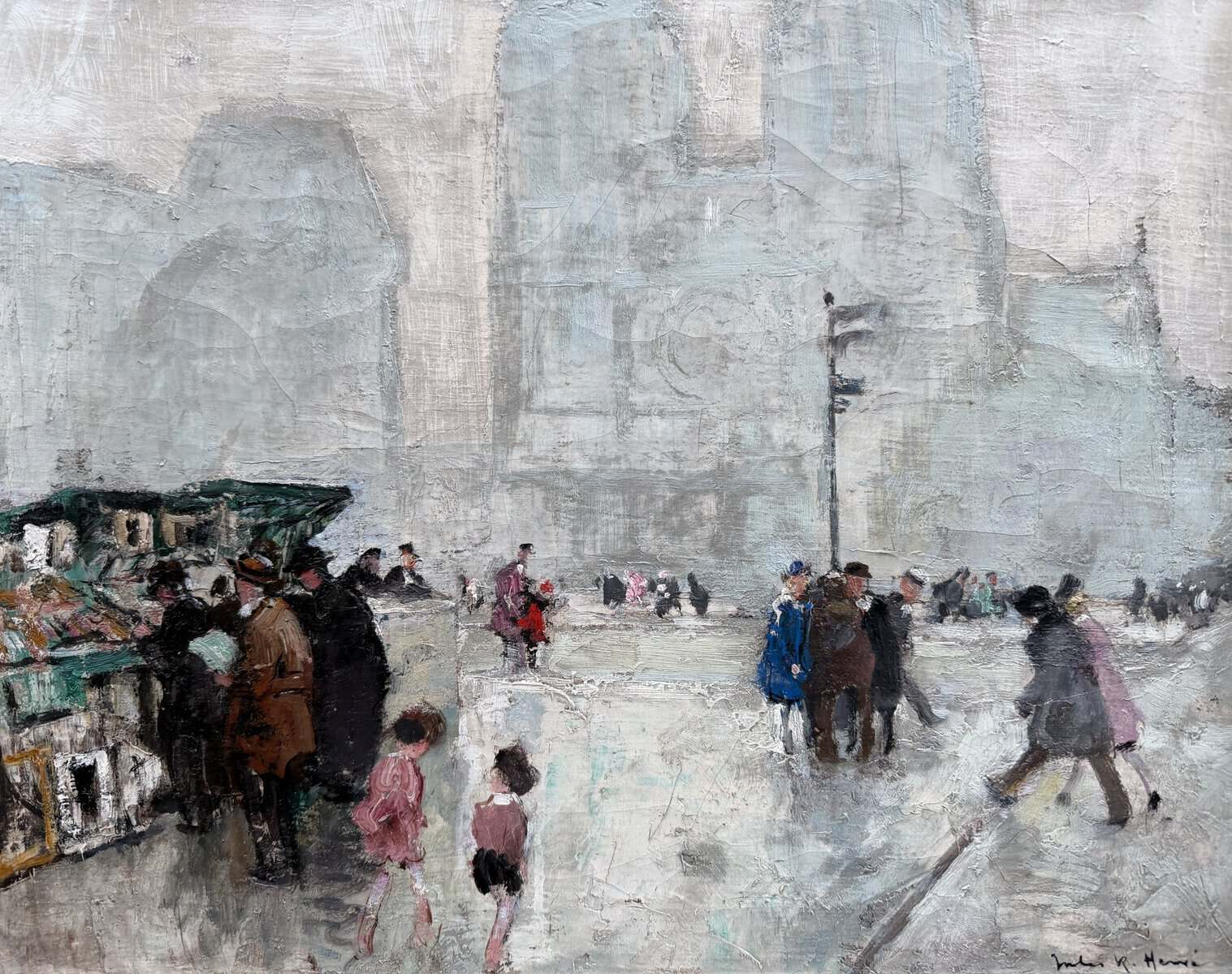 Peintre de scènes typiques , figures , portraits , paysages . Elève de Fernand Cormon et de Jules Adler , Jules René Hervé s’installe à Paris et commence à exposer au Salon des Artistes Français en 1910 , Jules René Hervé y reçoit une médaille d’argent en 1914 et une médaille d’or en 1925 .Puis Jules René Hervé partage sa vie entre Paris et sa ville natale dont il peint , d’un pinceau léger , expert en petits éclats vifs sur des gris ou des ocres habilement répartis , les évènements humbles et pittoresques , les portraits de son austère société à l’existence monotone et feutrée – Mais Jules René Hervé sait tout aussi bien restituer l’atmosphère animée de la vie Parisienne et ses monuments ou les danseuses au foyer de l’Opéra -De ses compositions finement observées émanent de délicats sentiments – Apprécié des amateurs français et étrangers , Jules René Hervé s »est adonné à son art tout au long de sa vie -Jules René Hervé est considéré comme « le dernier des impressionnistes »