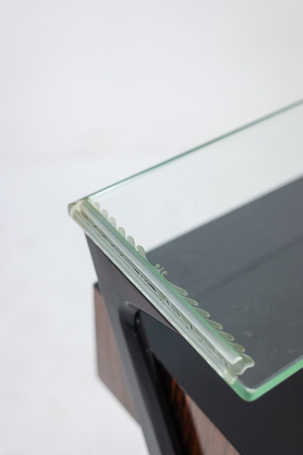 Piètement en bois noir, caisson formant tiroir en bois stratifié et dessus laqué noir, épais plateau de verre (2 cm) à décor gravé de frises.